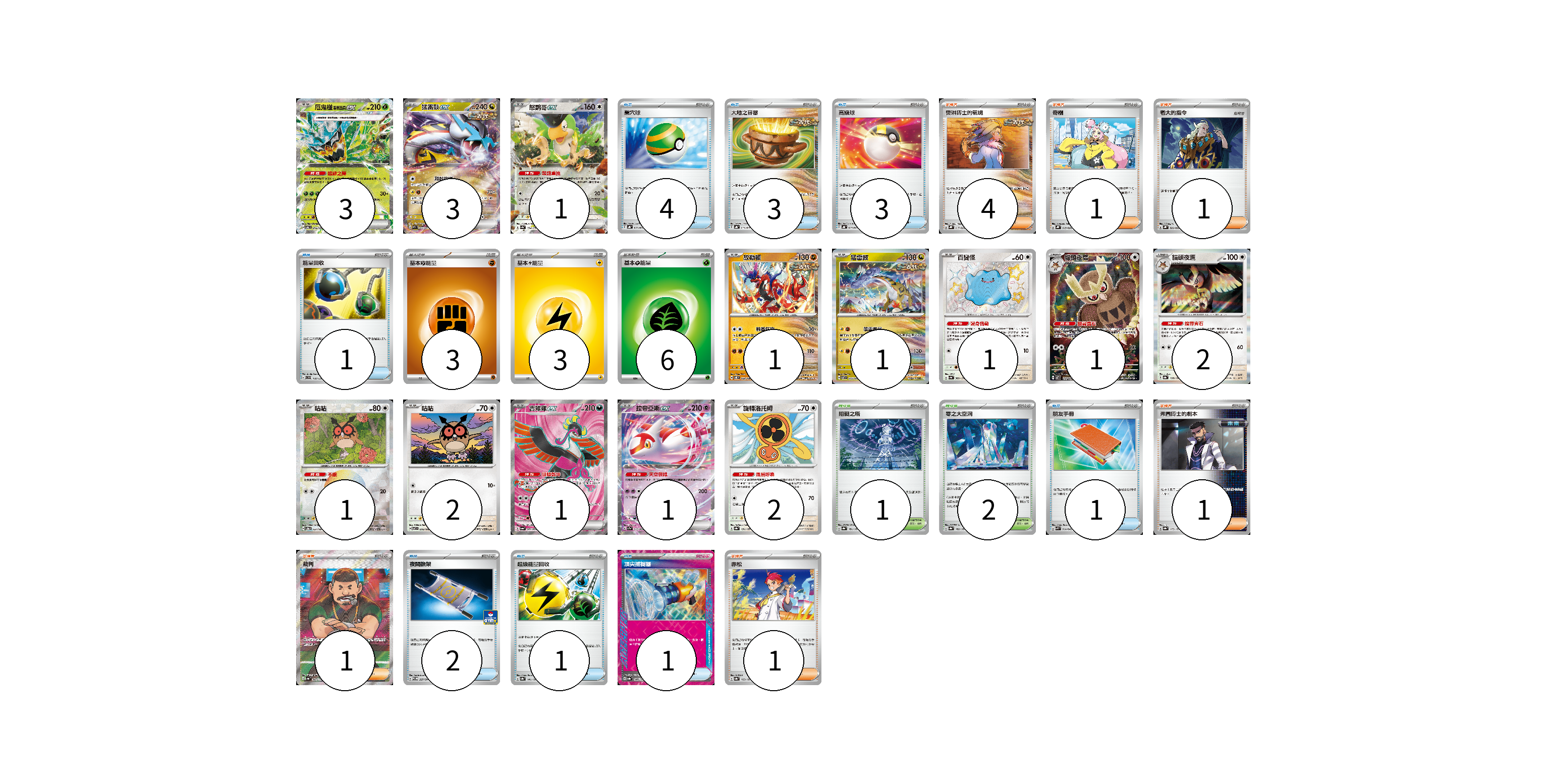 牌組構築方案 以此牌組為基礎新構築牌組 顯示卡面 顯示列表 寶可夢卡(20) 3 3 1 1 1 1 1 2 1 2 1 1 2 物品卡(16) 4 3 3 1 1 2 1 1 支援者卡(9) 4 1 1 1 1 1 競技場卡(3) 1 2 能量卡(12) 3 3 6 寶可夢卡(20) 卡牌名稱 張數 卡牌名稱 張數 厄鬼椪 碧草面具ex SV6 016/101 03 猛雷鼓ex SV5K 053/071 03 怒鸚哥ex SV4a 154/190 01 故勒頓 SV8 069/106 01 猛雷鼓 SV7 075/102 01 百變怪 SV4a 309/190 01 貓頭夜鷹 SV7 114/102 01 貓頭夜鷹 SV8a 128/187 02 咕咕 SV8a 127/187 01 咕咕 SV7 076/102 02 吉雉雞ex SV6a 081/064 01 拉帝亞斯ex SV7a 019/064 01 旋轉洛托姆 SV8a 131/187 02 物品卡(16) 卡牌名稱 張數 卡牌名稱 張數 巢穴球 SVHK 012/022 04 大地之容器 SVHK 011/022 03 高級球 SVHK 013/022 03 能量回收 SVD 110/139 01 朋友手冊 SVK 014/042 01 夜間擔架 SV-P 227/SV-P 02 超級能量回收 SV8a 141/187 01 頂尖捕捉器 SV8a 148/187 01 支援者卡(9) 卡牌名稱 張數 卡牌名稱 張數 奧琳博士的氣魄 SVHK 017/022 04 奇樹 SVHK 019/022 01 老大的指令 SVHK 022/022 01 弗圖博士的劇本 SV8a 175/187 01 裁判 SV4a 342/190 01 赤松 SV8a 163/187 01 競技場卡(3) 卡牌名稱 張數 卡牌名稱 張數 阻礙之塔 SV8a 181/187 01 零之大空洞 SV8a 182/187 02 能量卡(12) 卡牌名稱 張數 卡牌名稱 張數 基本【鬥】能量 SVHK FIG 03 基本【雷】能量 SVHM LIG 03 基本【草】能量 SVF GRA 06 以此牌組為基礎新構築牌組 牌組編碼 FVjaWa-iafXjV-Clxlfk copy 列印牌組單 牌組編碼已複製 分享至SNS