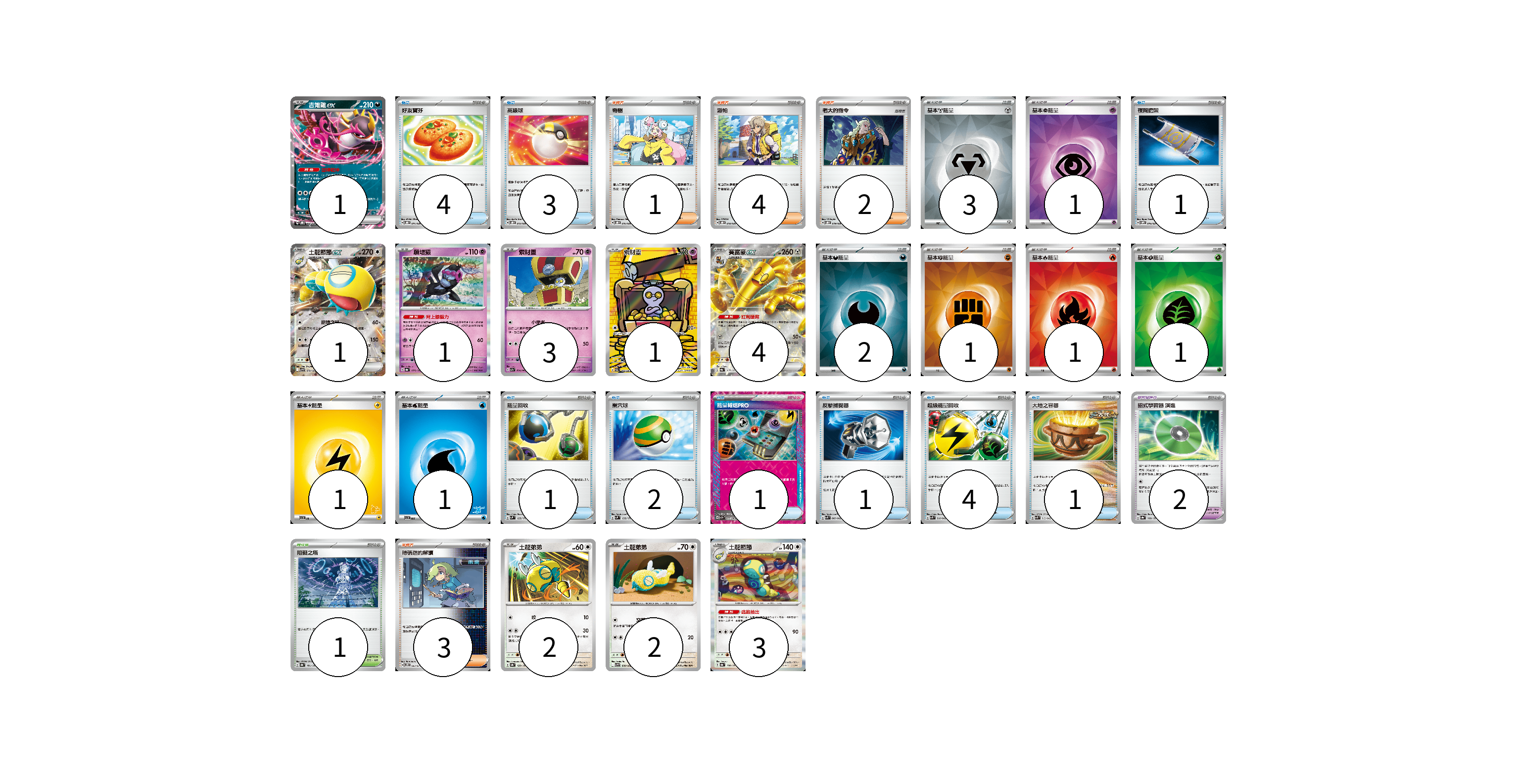 牌組構築方案 以此牌組為基礎新構築牌組 顯示卡面 顯示列表 寶可夢卡(18) 1 1 1 3 1 4 2 2 3 寶可夢道具(2) 2 物品卡(18) 4 3 1 1 2 1 1 4 1 支援者卡(10) 1 4 2 3 競技場卡(1) 1 能量卡(11) 3 1 2 1 1 1 1 1 寶可夢卡(18) 卡牌名稱 張數 卡牌名稱 張數 吉雉雞ex SVOD 004/020 01 土龍節節ex SV9 079/100 01 願增猿 SV8a 075/187 01 索財靈 SV7a 024/064 03 索財靈 SV3a 068/062 01 賽富豪ex SV8a 117/187 04 土龍弟弟 SV8a 129/187 02 土龍弟弟 SV9 078/100 02 土龍節節 SV8a 130/187 03 寶可夢道具(2) 卡牌名稱 張數 卡牌名稱 張數 招式學習器 演進 SV8a 160/187 02 物品卡(18) 卡牌名稱 張數 卡牌名稱 張數 好友寶芬 SVOD 011/020 04 高級球 SVOD 012/020 03 夜間擔架 SVOM 016/021 01 能量回收 SVM 125/175 01 巢穴球 SVM 133/175 02 能量輸送PRO SV7a 052/064 01 反擊捕捉器 SVK 009/042 01 超級能量回收 SVK 010/042 04 大地之容器 SVK 012/042 01 支援者卡(10) 卡牌名稱 張數 卡牌名稱 張數 奇樹 SVOD 016/020 01 派帕 SVOD 018/020 04 老大的指令 SVOD 019/020 02 暗碼迷的解讀 SV5M 067/071 03 競技場卡(1) 卡牌名稱 張數 卡牌名稱 張數 阻礙之塔 SV8a 181/187 01 能量卡(11) 卡牌名稱 張數 卡牌名稱 張數 基本【鋼】能量 SVOD MET 03 基本【超】能量 SVOD PSY 01 基本【惡】能量 SVOM DAR 02 基本【鬥】能量 SVK FIG 01 基本【火】能量 SVK FIR 01 基本【草】能量 SVK GRA 01 基本【雷】能量 SVI LIG 01 基本【水】能量 SVI WAT 01 以此牌組為基礎新構築牌組 牌組編碼 FVwVAl-VrIqlo-vnkYMA copy 列印牌組單 牌組編碼已複製 分享至SNS