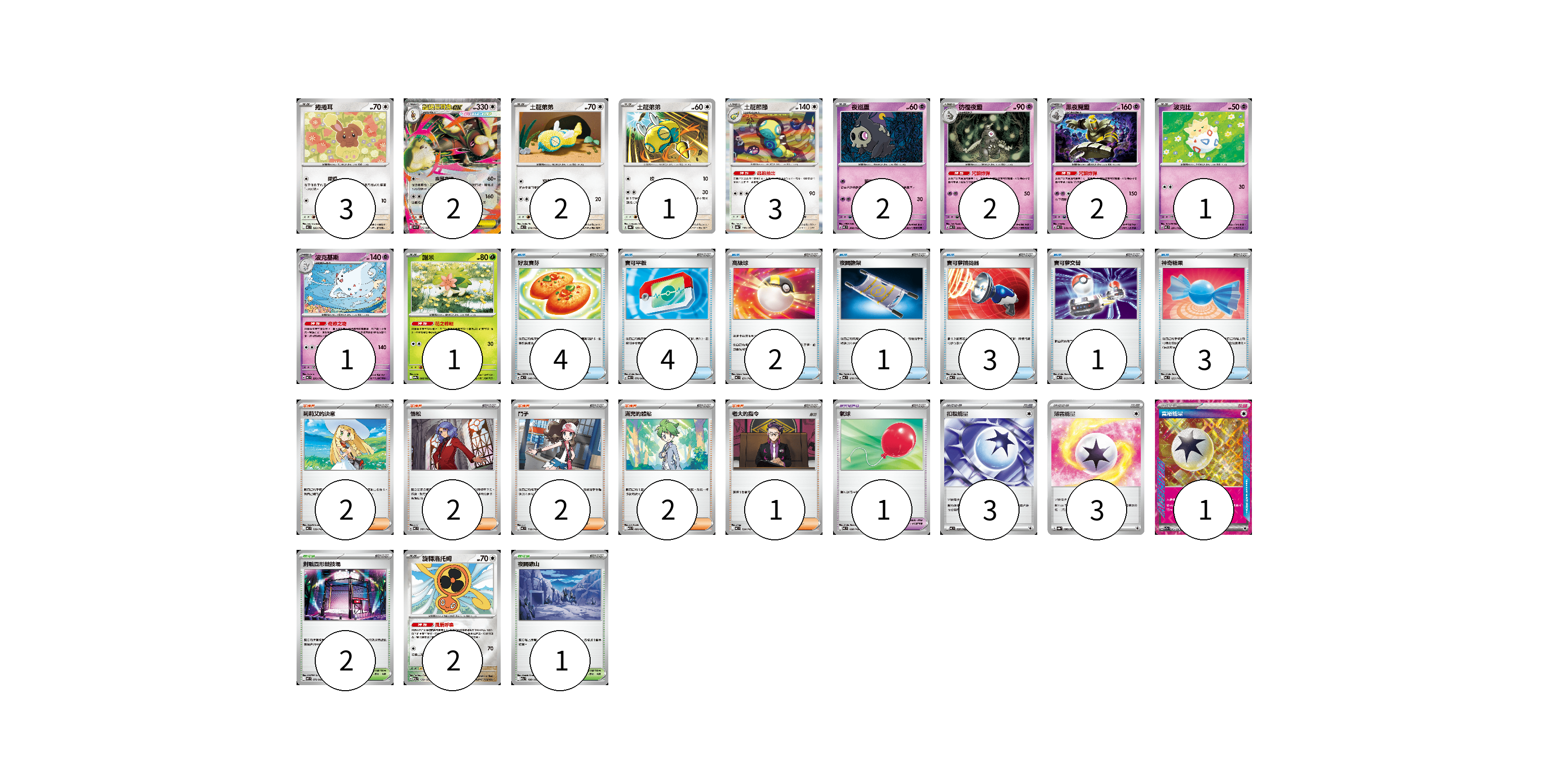 牌組構築方案 以此牌組為基礎新構築牌組 顯示卡面 顯示列表 寶可夢卡(22) 3 2 2 1 3 2 2 2 1 1 1 2 寶可夢道具(1) 1 物品卡(18) 4 4 2 1 3 1 3 支援者卡(9) 2 2 2 2 1 競技場卡(3) 2 1 能量卡(7) 3 3 1 寶可夢卡(22) 卡牌名稱 張數 卡牌名稱 張數 捲捲耳 MC 593/742 03 超級長耳兔ex M2 072/080 02 土龍弟弟 MC 574/742 02 土龍弟弟 SV8a 129/187 01 土龍節節 SV8a 130/187 03 夜巡靈 MC 308/742 02 彷徨夜靈 MC 309/742 02 黑夜魔靈 MC 310/742 02 波克比 MC 291/742 01 波克基斯 MC 293/742 01 謝米 SV9a 006/063 01 旋轉洛托姆 M2a 139/193 02 寶可夢道具(1) 卡牌名稱 張數 卡牌名稱 張數 氣球 MC 688/742 01 物品卡(18) 卡牌名稱 張數 卡牌名稱 張數 好友寶芬 MC 648/742 04 寶可平板 M3 070/080 04 高級球 MC 651/742 02 夜間擔架 MC 670/742 01 寶可夢捕捉器 MC 665/742 03 寶可夢交替 MC 663/742 01 神奇糖果 MC 655/742 03 支援者卡(9) 卡牌名稱 張數 卡牌名稱 張數 莉莉艾的決意 MC 729/742 02 悟松 MC 707/742 02 鬥子 MC 718/742 02 滿充的體貼 M1S 060/063 02 老大的指令 MC 724/742 01 競技場卡(3) 卡牌名稱 張數 卡牌名稱 張數 對戰圓形競技場 M2 079/080 02 夜間礦山 M2a 188/193 01 能量卡(7) 卡牌名稱 張數 卡牌名稱 張數 扣殺能量 MC 737/742 03 薄霧能量 SV8a 186/187 03 富裕能量 SV7a 064/064 01 以此牌組為基礎新構築牌組 牌組編碼 FWolNj-CKpCwf-IuCxUk copy 列印牌組單 牌組編碼已複製 分享至SNS