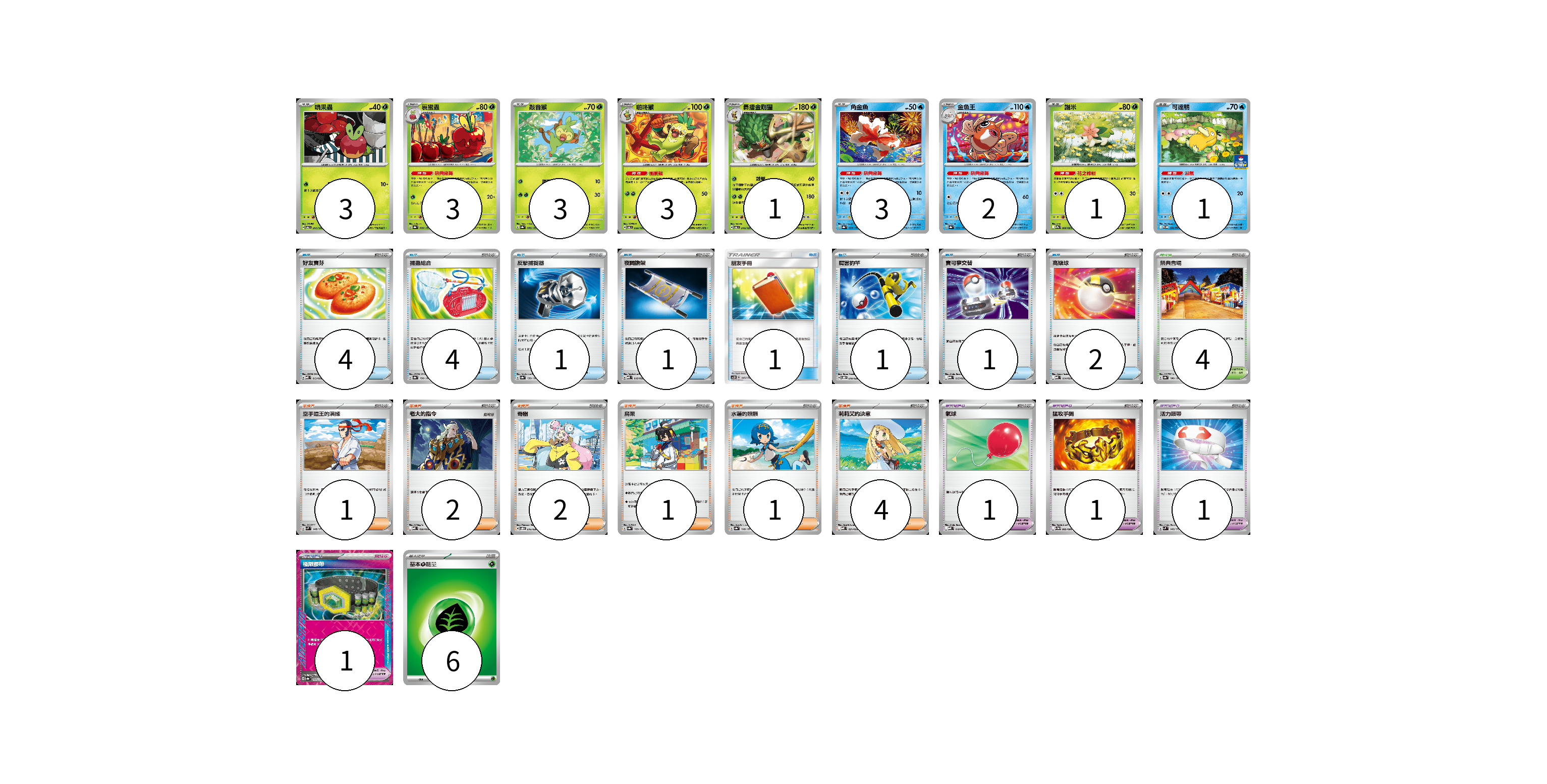 牌組構築方案 以此牌組為基礎新構築牌組 顯示卡面 顯示列表 寶可夢卡(20) 3 3 3 3 1 3 2 1 1 寶可夢道具(3) 1 1 1 物品卡(16) 4 4 1 1 1 1 1 2 1 支援者卡(11) 1 2 2 1 1 4 競技場卡(4) 4 能量卡(6) 6 寶可夢卡(20) 卡牌名稱 張數 卡牌名稱 張數 啃果蟲 SV6 011/101 03 裹蜜蟲 SV8a 009/187 03 敲音猴 SV8a 006/187 03 啪咚猴 SV6 009/101 03 轟擂金剛猩 SV6 010/101 01 角金魚 SV8a 028/187 03 金魚王 SV8a 029/187 02 謝米 SV9a 006/063 01 可達鴨 SV-P 220/SV-P 01 寶可夢道具(3) 卡牌名稱 張數 卡牌名稱 張數 猛攻手鐲 SV11W 082/086 01 活力頭帶 SVM 140/175 01 極限腰帶 SV8a 159/187 01 物品卡(16) 卡牌名稱 張數 卡牌名稱 張數 好友寶芬 MBD 013/022 04 捕蟲組合 SV8a 150/187 04 反擊捕捉器 SV8a 139/187 01 夜間擔架 MBD 016/022 01 朋友手冊 AC2D 145/176 01 厲害釣竿 SVOD 010/020 01 寶可夢交替 MBG 015/022 01 高級球 MBD 014/022 02 氣球 MBD 018/022 01 支援者卡(11) 卡牌名稱 張數 卡牌名稱 張數 空手道王的演練 SVM 148/175 01 老大的指令 MBD 020/022 02 奇樹 SVOD 016/020 02 烏栗 SV8a 169/187 01 水蓮的照顧 SV8a 168/187 01 莉莉艾的決意 MBD 021/022 04 競技場卡(4) 卡牌名稱 張數 卡牌名稱 張數 祭典會場 SV8a 180/187 04 能量卡(6) 卡牌名稱 張數 卡牌名稱 張數 基本草能量 sv-p GRA 06 以此牌組為基礎新構築牌組 牌組編碼 FYqRDc-uQoUXf-oVOKgg copy 列印牌組單 牌組編碼已複製 分享至SNS