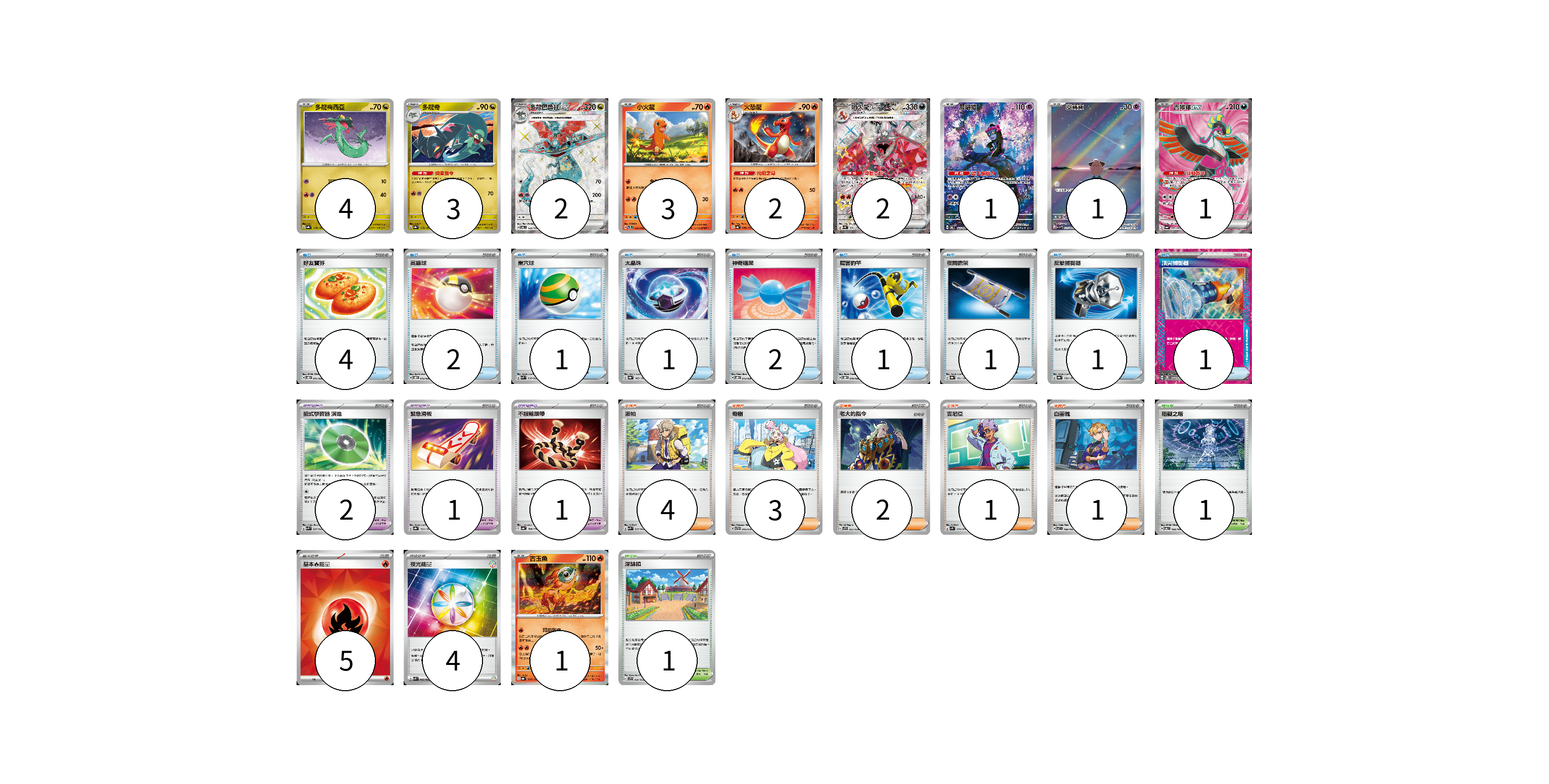 牌組構築方案 以此牌組為基礎新構築牌組 顯示卡面 顯示列表 寶可夢卡(20) 4 3 2 3 2 2 1 1 1 1 寶可夢道具(4) 2 1 1 物品卡(14) 4 2 1 1 2 1 1 1 1 支援者卡(11) 4 3 2 1 1 競技場卡(2) 1 1 能量卡(9) 5 4 寶可夢卡(20) 卡牌名稱 張數 卡牌名稱 張數 多龍梅西亞 SV8a 118/187 04 多龍奇 SV8a 119/187 03 多龍巴魯托ex SV6 120/101 02 小火龍 SVTL 001/021 03 火恐龍 SV4a 026/190 02 噴火龍ex SV4a 331/190 02 願增猿 SV6 107/101 01 皮寶寶 SV3 113/108 01 吉雉雞ex SV6a 081/064 01 古玉魚 SV8a 025/187 01 寶可夢道具(4) 卡牌名稱 張數 卡牌名稱 張數 招式學習器 演進 SVK 025/042 02 緊急滑板 SV8a 153/187 01 不服輸頭帶 SV4a 168/190 01 物品卡(14) 卡牌名稱 張數 卡牌名稱 張數 好友寶芬 SVOD 011/020 04 高級球 SVOD 012/020 02 巢穴球 SVK 016/042 01 太晶珠 SV8a 145/187 01 神奇糖果 SVOD 013/020 02 厲害釣竿 SVOD 010/020 01 夜間擔架 SV8a 151/187 01 反擊捕捉器 SV8a 139/187 01 頂尖捕捉器 SV5M 062/071 01 支援者卡(11) 卡牌名稱 張數 卡牌名稱 張數 派帕 SVK 035/042 04 奇樹 SVTH 015/018 03 老大的指令 SVF 032/038 02 吉尼亞 SV1S 074/078 01 白蕾雅 SV7 100/102 01 競技場卡(2) 卡牌名稱 張數 卡牌名稱 張數 阻礙之塔 SV6 100/101 01 深缽鎮 SVF 036/038 01 能量卡(9) 卡牌名稱 張數 卡牌名稱 張數 基本【火】能量 SVK FIR 05 夜光能量 SVK 042/042 04 以此牌組為基礎新構築牌組 牌組編碼 FZEKnN-ohWdgF-rgMvZh copy 列印牌組單 牌組編碼已複製 分享至SNS