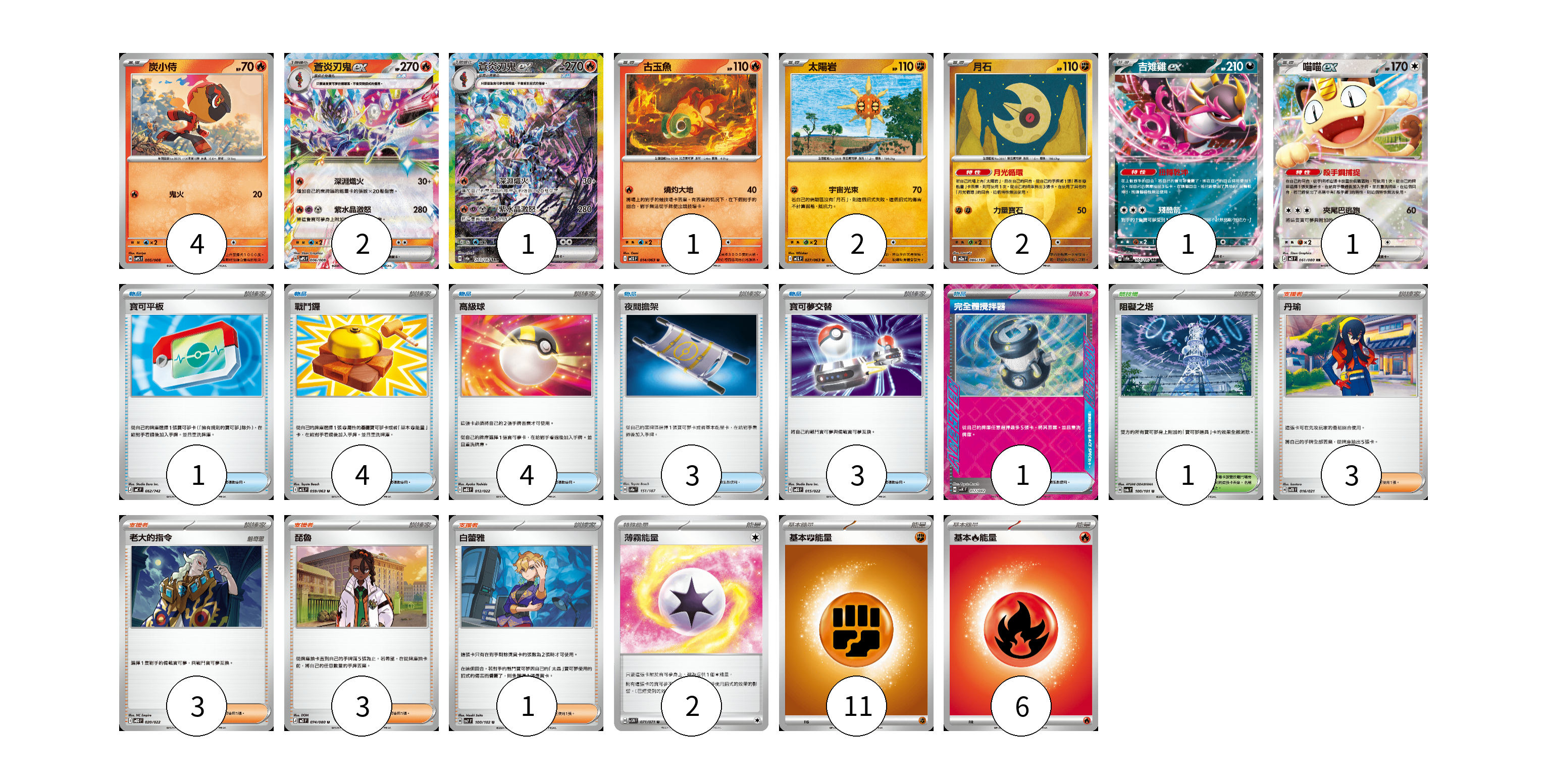 牌組構築方案 以此牌組為基礎新構築牌組 顯示卡面 顯示列表 寶可夢卡(14) 4 2 1 1 2 2 1 1 物品卡(16) 1 4 4 3 3 1 支援者卡(10) 3 3 3 1 競技場卡(1) 1 能量卡(19) 2 11 6 寶可夢卡(14) 卡牌名稱 張數 卡牌名稱 張數 炭小侍 SVPS 005/008 04 蒼炎刃鬼ex SVPS 006/008 02 蒼炎刃鬼ex SV8a 203/187 01 古玉魚 M1S 014/063 01 太陽岩 M1L 027/063 02 月石 M2a 086/193 02 吉雉雞ex SV8a 104/187 01 喵喵ex M3 061/080 01 物品卡(16) 卡牌名稱 張數 卡牌名稱 張數 寶可平板 MC 662/742 01 戰鬥鑼 M1L 059/063 04 高級球 MBG 012/022 04 夜間擔架 SV8a 151/187 03 寶可夢交替 MBG 015/022 03 完全體攪拌器 SVK 017/042 01 支援者卡(10) 卡牌名稱 張數 卡牌名稱 張數 丹瑜 SVTR 016/021 03 老大的指令 MBD 020/022 03 琵魯 M3 074/080 03 白蕾雅 SV7 100/102 01 競技場卡(1) 卡牌名稱 張數 卡牌名稱 張數 阻礙之塔 SV6 100/101 01 能量卡(19) 卡牌名稱 張數 卡牌名稱 張數 薄霧能量 SV5M 071/071 02 基本【鬥】能量 MC FIG 11 基本【火】能量 MC FIR 06 以此牌組為基礎新構築牌組 牌組編碼 FbGrdG-IlsRob-kFmLqW copy 列印牌組單 牌組編碼已複製 分享至SNS