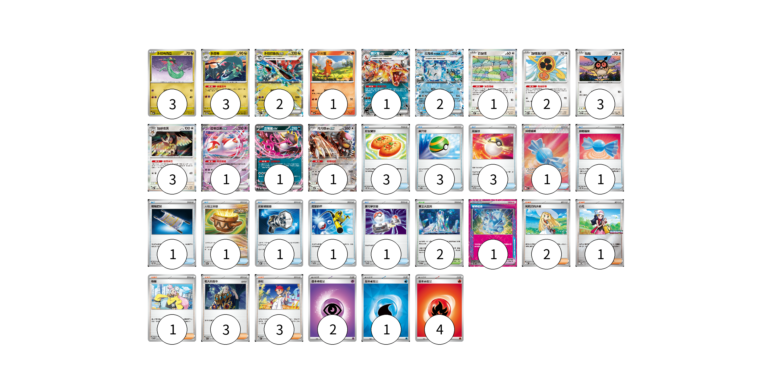 牌組構築方案 以此牌組為基礎新構築牌組 顯示卡面 顯示列表 寶可夢卡(24) 3 3 2 1 1 2 1 2 3 3 1 1 1 寶可夢道具(1) 1 物品卡(16) 3 3 3 1 1 1 1 1 1 1 支援者卡(10) 2 1 1 3 3 競技場卡(2) 2 能量卡(7) 2 1 4 寶可夢卡(24) 卡牌名稱 張數 卡牌名稱 張數 多龍梅西亞 SV8a 118/187 03 多龍奇 SV6 080/101 03 多龍巴魯托ex M2a 134/193 02 小火龍 SV4a 025/190 01 噴火龍ex SV4a 115/190 01 厄鬼椪 水井面具ex SV8a 050/187 02 百變怪 SV4a 144/190 01 旋轉洛托姆 SV8a 131/187 02 咕咕 SV7 076/102 03 貓頭夜鷹 SV8a 128/187 03 拉帝亞斯ex M2a 075/193 01 吉雉雞ex SVOM 009/021 01 月月熊 赫月ex SV8a 134/187 01 寶可夢道具(1) 卡牌名稱 張數 卡牌名稱 張數 璀璨結晶 SV7 094/102 01 物品卡(16) 卡牌名稱 張數 卡牌名稱 張數 好友寶芬 SVOM 012/021 03 巢穴球 SVEL 011/020 03 高級球 SVTM 012/022 03 神奇糖果 M1S 082/063 01 神奇糖果 SVOM 014/021 01 夜間擔架 SVOM 016/021 01 大地之容器 SV8a 143/187 01 反擊捕捉器 SV8a 139/187 01 厲害釣竿 SVTG 009/019 01 寶可夢交替 SVTG 015/019 01 支援者卡(10) 卡牌名稱 張數 卡牌名稱 張數 莉莉艾的決意 MBD 021/022 02 小光 M-P 028/M-P 01 奇樹 SVTH 015/018 01 老大的指令 SVK 036/042 03 赤松 SVK 027/042 03 競技場卡(2) 卡牌名稱 張數 卡牌名稱 張數 零之大空洞 SV7 102/102 02 能量卡(7) 卡牌名稱 張數 卡牌名稱 張數 基本【超】能量 M-P PSY 02 基本【水】能量 SVK WAT 01 基本【火】能量 SVTL FIR 04 以此牌組為基礎新構築牌組 牌組編碼 FgMZTc-rIJnMO-wGVWfz copy 列印牌組單 牌組編碼已複製 分享至SNS