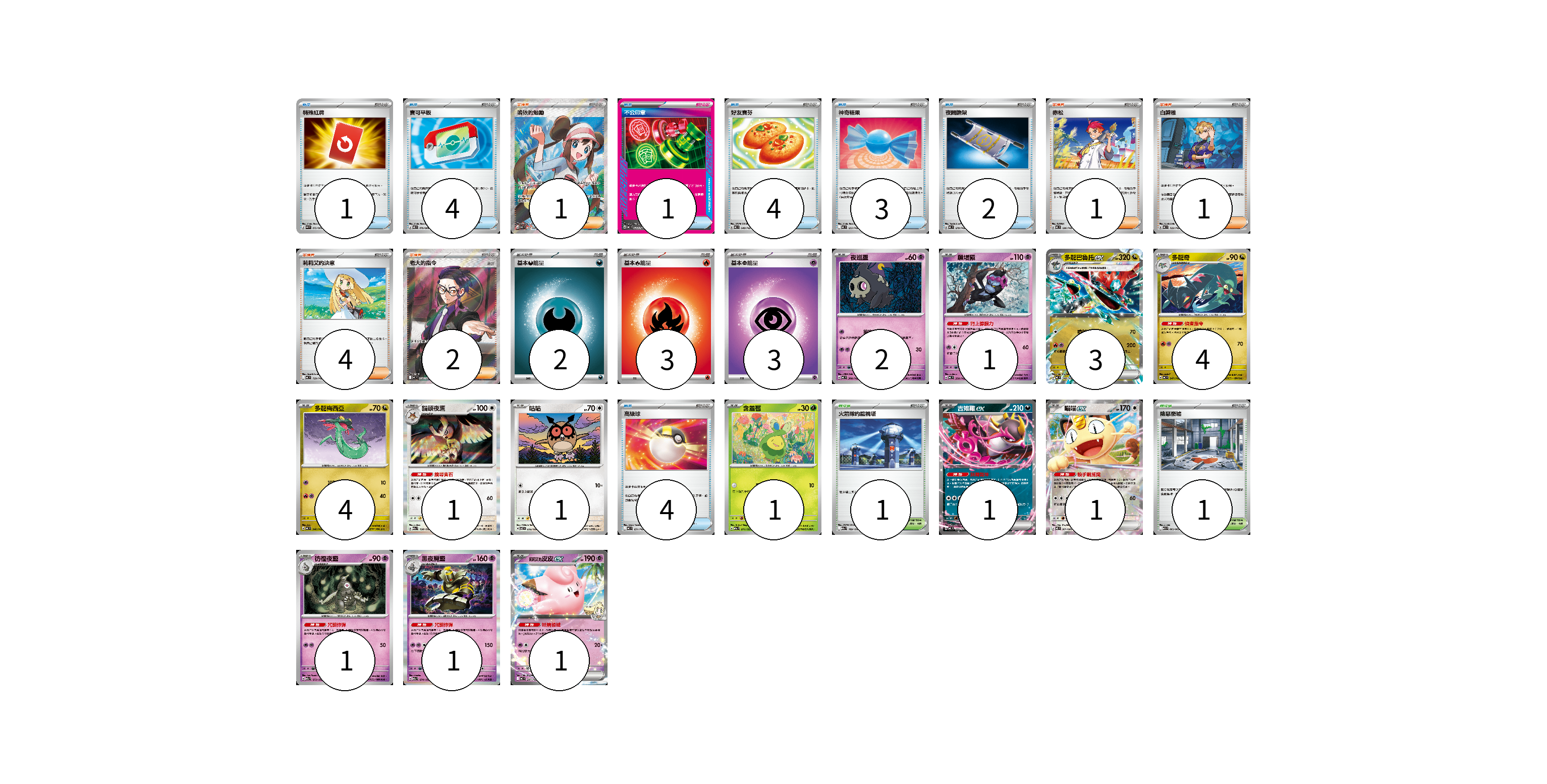 牌組構築方案 以此牌組為基礎新構築牌組 顯示卡面 顯示列表 寶可夢卡(22) 2 1 3 4 4 1 1 1 1 1 1 1 1 物品卡(19) 1 4 1 4 3 2 4 支援者卡(9) 1 1 1 4 2 競技場卡(2) 1 1 能量卡(8) 2 3 3 寶可夢卡(22) 卡牌名稱 張數 卡牌名稱 張數 夜巡靈 MC 308/742 02 願增猿 MC 358/742 01 多龍巴魯托ex MC 548/742 03 多龍奇 MC 547/742 04 多龍梅西亞 MC 546/742 04 貓頭夜鷹 M2a 138/193 01 咕咕 SV7 076/102 01 含羞苞 M2a 011/193 01 吉雉雞ex MC 489/742 01 喵喵ex M3 061/080 01 彷徨夜靈 M2a 073/193 01 黑夜魔靈 M2a 074/193 01 莉莉艾的皮皮ex MC 287/742 01 物品卡(19) 卡牌名稱 張數 卡牌名稱 張數 特殊紅牌 M4 072/083 01 寶可平板 M3 070/080 04 不公印章 MC 633/742 01 好友寶芬 MC 648/742 04 神奇糖果 MC 655/742 03 夜間擔架 MC 670/742 02 高級球 MC 651/742 04 支援者卡(9) 卡牌名稱 張數 卡牌名稱 張數 鳴依的勉勵 M3 107/080 01 赤松 MC 696/742 01 白蕾雅 MC 722/742 01 莉莉艾的決意 MC 729/742 04 老大的指令(烏羽) MC 760/742 02 競技場卡(2) 卡牌名稱 張數 卡牌名稱 張數 火箭隊的監視塔 M2a 189/193 01 險惡廢墟 M1L 063/063 01 能量卡(8) 卡牌名稱 張數 卡牌名稱 張數 基本【惡】能量 MC DAR 02 基本【火】能量 MC FIR 03 基本【超】能量 MBD PSY 03 以此牌組為基礎新構築牌組 牌組編碼 FhCzCg-cYyrfa-dCLvqS copy 列印牌組單 牌組編碼已複製 分享至SNS