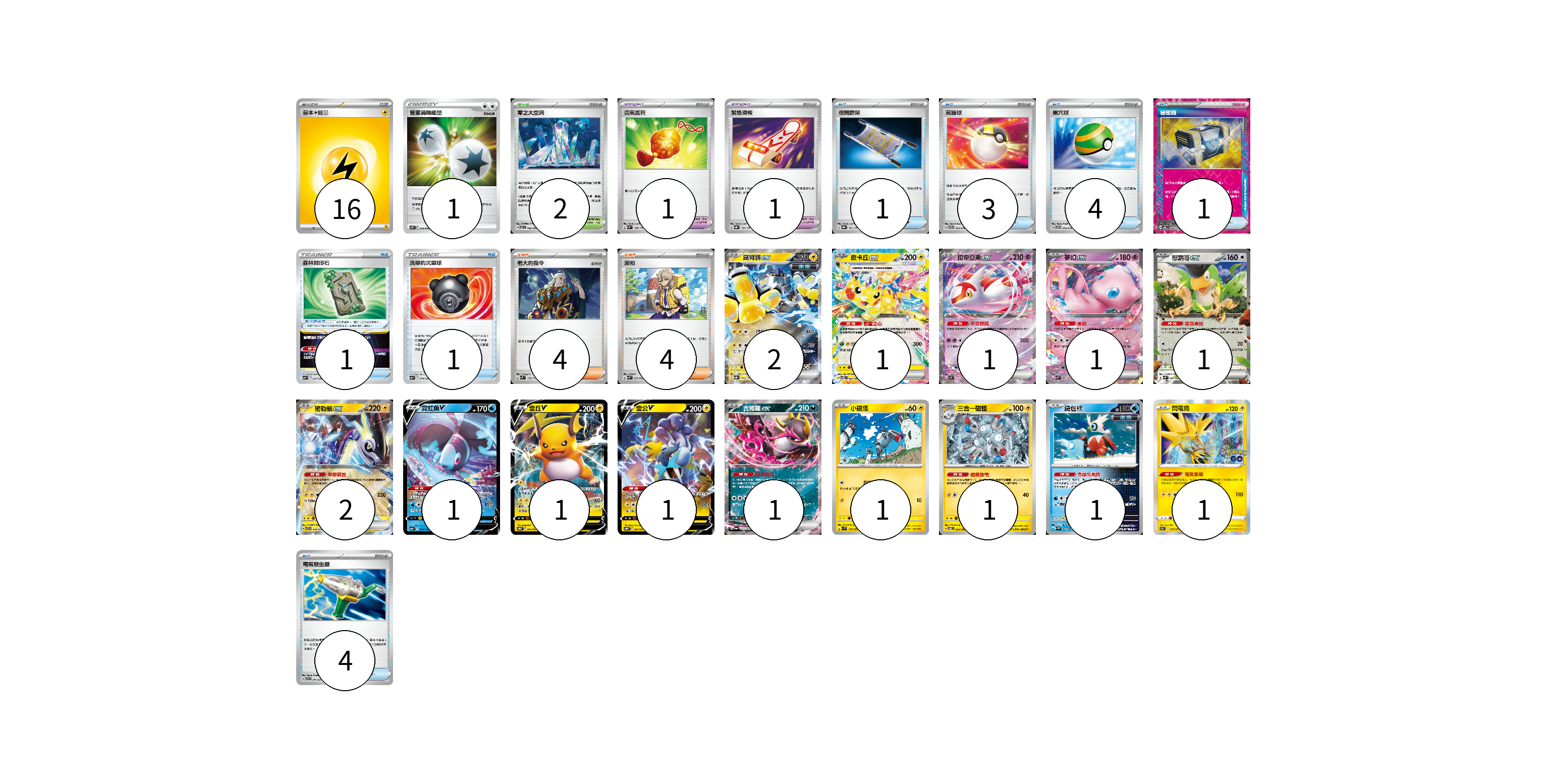 牌組構築方案 以此牌組為基礎新構築牌組 顯示卡面 顯示列表 寶可夢卡(16) 2 1 1 1 1 2 1 1 1 1 1 1 1 1 寶可夢道具(2) 1 1 物品卡(15) 1 3 4 1 1 1 4 支援者卡(8) 4 4 競技場卡(2) 2 能量卡(17) 16 1 寶可夢卡(16) 卡牌名稱 張數 卡牌名稱 張數 鐵臂膀ex SV8a 054/187 02 皮卡丘ex SV8 033/106 01 拉帝亞斯ex SV7a 019/064 01 夢幻ex SVK 001/042 01 怒鸚哥ex SVK 006/042 01 密勒頓ex SVTR 008/021 02 霓虹魚V SVB 008/028 01 雷丘V SVTR 003/021 01 雷公V SVTR 005/021 01 吉雉雞ex SV6a 038/064 01 小磁怪 SV1V 026/078 01 三合一磁怪 SV8 035/106 01 鐵包袱 SV4M 020/066 01 閃電鳥 S10b 029/071 01 寶可夢道具(2) 卡牌名稱 張數 卡牌名稱 張數 勇氣護符 SVM 142/175 01 緊急滑板 SV8a 153/187 01 物品卡(15) 卡牌名稱 張數 卡牌名稱 張數 夜間擔架 SV8a 151/187 01 高級球 SVTG 013/019 03 巢穴球 SVTG 012/019 04 秘密箱 SV6 092/101 01 森林封印石 SVF 024/038 01 洗翠的沉重球 SVF 019/038 01 電氣發生器 SVTR 011/021 04 支援者卡(8) 卡牌名稱 張數 卡牌名稱 張數 老大的指令 SVM 172/175 04 派帕 SVK 035/042 04 競技場卡(2) 卡牌名稱 張數 卡牌名稱 張數 零之大空洞 SV7 102/102 02 能量卡(17) 卡牌名稱 張數 卡牌名稱 張數 基本【雷】能量 SVTR LIG 16 雙重渦輪能量 SVTM 022/022 01 以此牌組為基礎新構築牌組 牌組編碼 Fjcmsk-BsyhZP-FyDXGK copy 列印牌組單 牌組編碼已複製 分享至SNS