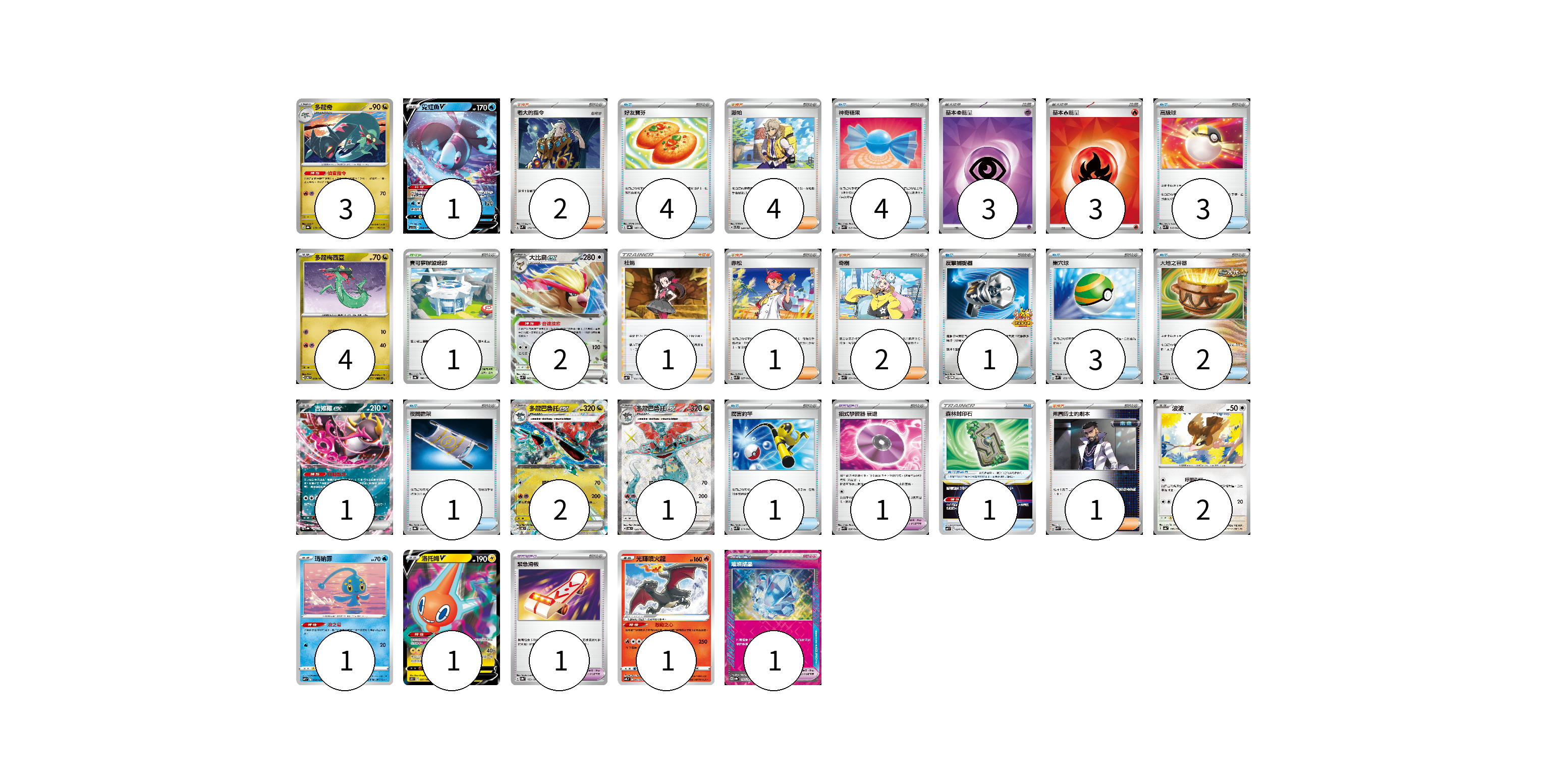 牌組構築方案 以此牌組為基礎新構築牌組 顯示卡面 顯示列表 寶可夢卡(19) 3 1 4 2 1 2 1 2 1 1 1 寶可夢道具(3) 1 1 1 物品卡(20) 4 4 3 1 3 2 1 1 1 支援者卡(11) 2 4 1 1 2 1 競技場卡(1) 1 能量卡(6) 3 3 寶可夢卡(19) 卡牌名稱 張數 卡牌名稱 張數 多龍奇 SV8a 119/187 03 霓虹魚V SVHK 004/022 01 多龍梅西亞 SV6 079/101 04 大比鳥ex SVK 005/042 02 吉雉雞ex SV8a 104/187 01 多龍巴魯托ex SV6 081/101 02 多龍巴魯托ex SV6 120/101 01 波波 SV4a 137/190 02 瑪納霏 SVF 003/038 01 洛托姆V S11 037/100 01 光輝噴火龍 SVTL 003/021 01 寶可夢道具(3) 卡牌名稱 張數 卡牌名稱 張數 招式學習器 衰退 SVK 026/042 01 緊急滑板 SV8a 153/187 01 璀璨結晶 SV8a 152/187 01 物品卡(20) 卡牌名稱 張數 卡牌名稱 張數 好友寶芬 SV8a 147/187 04 神奇糖果 SVK 019/042 04 高級球 SVK 018/042 03 反擊捕捉器 SV-P 083/SV-P 01 巢穴球 SVM 133/175 03 大地之容器 SVK 012/042 02 夜間擔架 SV8a 151/187 01 厲害釣竿 SVK 011/042 01 森林封印石 SVF 024/038 01 支援者卡(11) 卡牌名稱 張數 卡牌名稱 張數 老大的指令 SVM 172/175 02 派帕 SVTL 020/021 04 杜娟 SVB 021/028 01 赤松 SVK 027/042 01 奇樹 SVK 031/042 02 弗圖博士的劇本 SVK 034/042 01 競技場卡(1) 卡牌名稱 張數 卡牌名稱 張數 寶可夢聯盟總部 SV4a 186/190 01 能量卡(6) 卡牌名稱 張數 卡牌名稱 張數 基本【超】能量 SVK PSY 03 基本【火】能量 SVK FIR 03 以此牌組為基礎新構築牌組 牌組編碼 FkXOxV-ftQKuS-nkEeBC copy 列印牌組單 牌組編碼已複製 分享至SNS