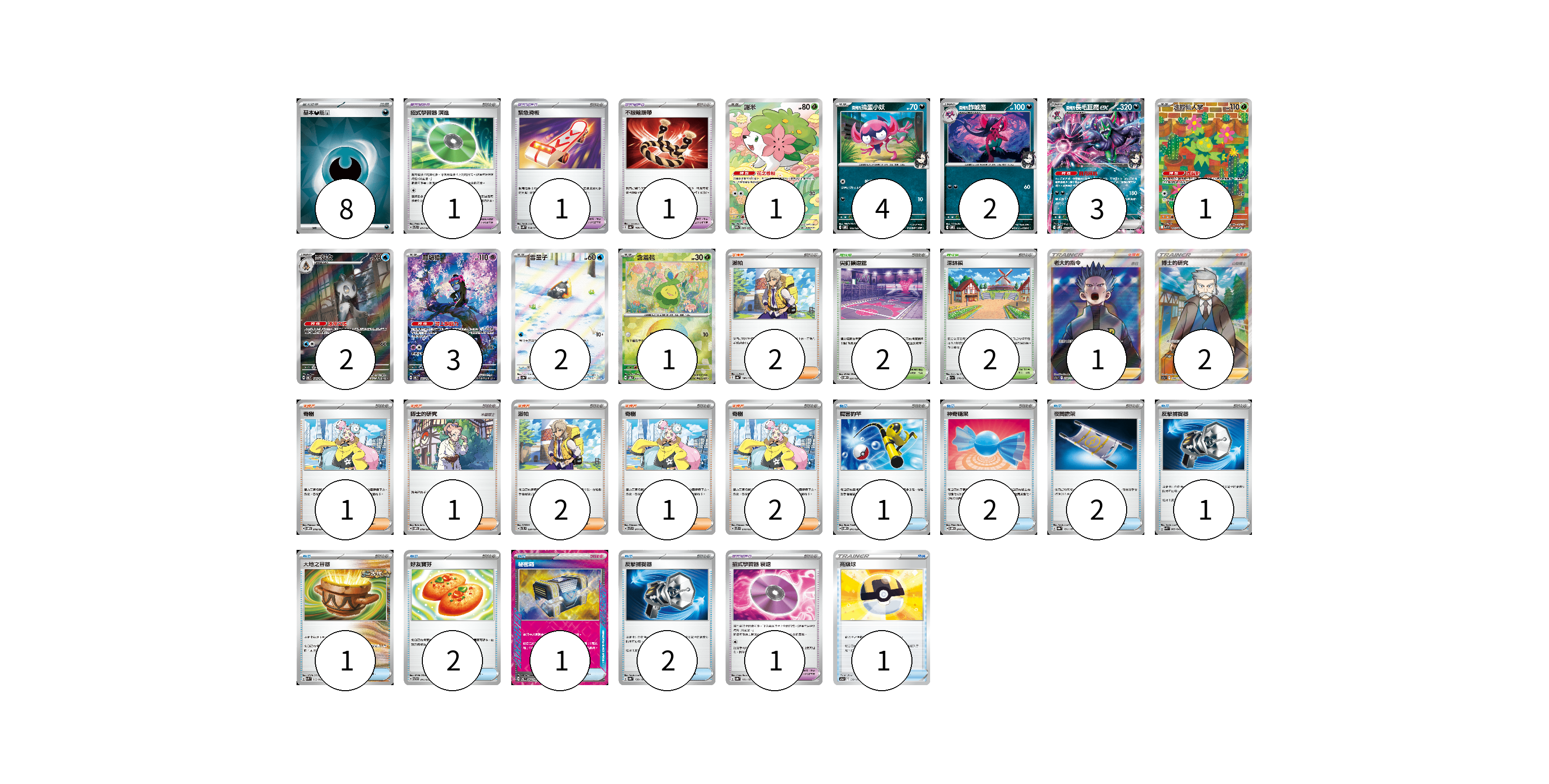 牌組構築方案 以此牌組為基礎新構築牌組 顯示卡面 顯示列表 寶可夢卡(19) 1 4 2 3 1 2 3 2 1 寶可夢道具(4) 1 1 1 1 物品卡(13) 1 2 2 1 1 2 1 2 1 支援者卡(12) 2 1 2 1 1 2 1 2 競技場卡(4) 2 2 能量卡(8) 8 寶可夢卡(19) 卡牌名稱 張數 卡牌名稱 張數 謝米 SV9a 066/063 01 <瑪俐的>搗蛋小妖 SVOM 005/021 04 <瑪俐的>詐唬魔 SVOM 006/021 02 <瑪俐的>長毛巨魔ex SVOM 007/021 03 沙鈴仙人掌 SV9 101/100 01 雪妖女 SV6 104/101 02 願增猿 SV6 107/101 03 雪童子 SV3a 063/062 02 含羞苞 SV8a 001/187 01 寶可夢道具(4) 卡牌名稱 張數 卡牌名稱 張數 招式學習器 演進 SVTL 017/021 01 緊急滑板 SV5K 064/071 01 不服輸頭帶 SV4a 168/190 01 招式學習器 衰退 SV8a 161/187 01 物品卡(13) 卡牌名稱 張數 卡牌名稱 張數 厲害釣竿 SVOM 011/021 01 神奇糖果 SVOM 014/021 02 夜間擔架 SV8a 151/187 02 反擊捕捉器 SVK 009/042 01 大地之容器 SVK 012/042 01 好友寶芬 SVTG 011/019 02 秘密箱 SV6 092/101 01 反擊捕捉器 SV8a 139/187 02 高級球 S12a 138/172 01 支援者卡(12) 卡牌名稱 張數 卡牌名稱 張數 派帕 SV4a 180/190 02 老大的指令(赤日) S12a 250/172 01 博士的研究(山梨博士) S12a 248/172 02 奇樹 SVOM 018/021 01 博士的研究 SVOM 019/021 01 派帕 SVTL 020/021 02 奇樹 SVTR 017/021 01 奇樹 SVTS 018/022 02 競技場卡(4) 卡牌名稱 張數 卡牌名稱 張數 尖釘鎮道館 SVOM 021/021 02 深缽鎮 SV1a 070/073 02 能量卡(8) 卡牌名稱 張數 卡牌名稱 張數 基本【惡】能量 SVOM DAR 08 以此牌組為基礎新構築牌組 牌組編碼 FsAFfo-yyuCTU-kybetY copy 列印牌組單 牌組編碼已複製 分享至SNS