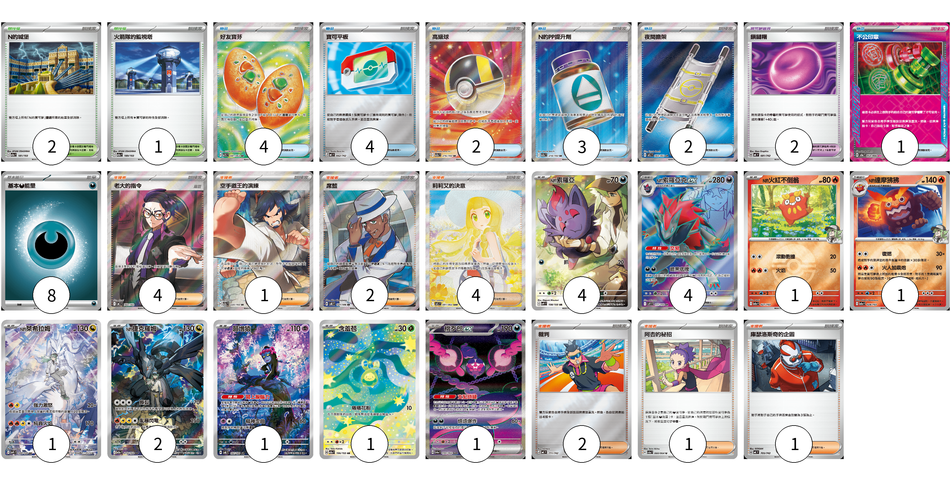 牌組構築方案 以此牌組為基礎新構築牌組 顯示卡面 顯示列表 寶可夢卡(16) 4 4 1 1 1 2 1 1 1 寶可夢道具(2) 2 物品卡(16) 4 4 2 3 2 1 支援者卡(15) 4 1 2 4 2 1 1 競技場卡(3) 2 1 能量卡(8) 8 寶可夢卡(16) 卡牌名稱 張數 卡牌名稱 張數 N的索羅亞 SV9 108/100 04 N的索羅亞克ex SV9 117/100 04 N的火紅不倒翁 M2a 027/193 01 N的達摩狒狒 M2a 028/193 01 N的萊希拉姆 SV9 109/100 01 N的捷克羅姆 M2a 210/193 02 願增猿 SV6 107/101 01 含羞苞 M2a 196/193 01 桃歹郎ex SV6a 090/064 01 寶可夢道具(2) 卡牌名稱 張數 卡牌名稱 張數 鎖鏈糬 MC 681/742 02 物品卡(16) 卡牌名稱 張數 卡牌名稱 張數 好友寶芬 M1S 081/063 04 寶可平板 MC 662/742 04 高級球 M2a 216/193 02 N的PP提升劑 M2a 214/193 03 夜間擔架 M1L 083/063 02 不公印章 SV5a 053/066 01 支援者卡(15) 卡牌名稱 張數 卡牌名稱 張數 老大的指令(烏羽) MC 760/742 04 空手道王的演練 M2a 220/193 01 席藍 SV8 127/106 02 莉莉艾的決意 M1L 091/063 04 裁判 MC 711/742 02 阿杏的秘招 SV6a 060/064 01 庫瑟洛斯奇的企圖 MC 705/742 01 競技場卡(3) 卡牌名稱 張數 卡牌名稱 張數 N的城堡 M2a 181/193 02 火箭隊的監視塔 M2a 189/193 01 能量卡(8) 卡牌名稱 張數 卡牌名稱 張數 基本【惡】能量 MC DAR 08 以此牌組為基礎新構築牌組 牌組編碼 FsgbRt-tdSyVi-ScCPGI copy 列印牌組單 牌組編碼已複製 分享至SNS