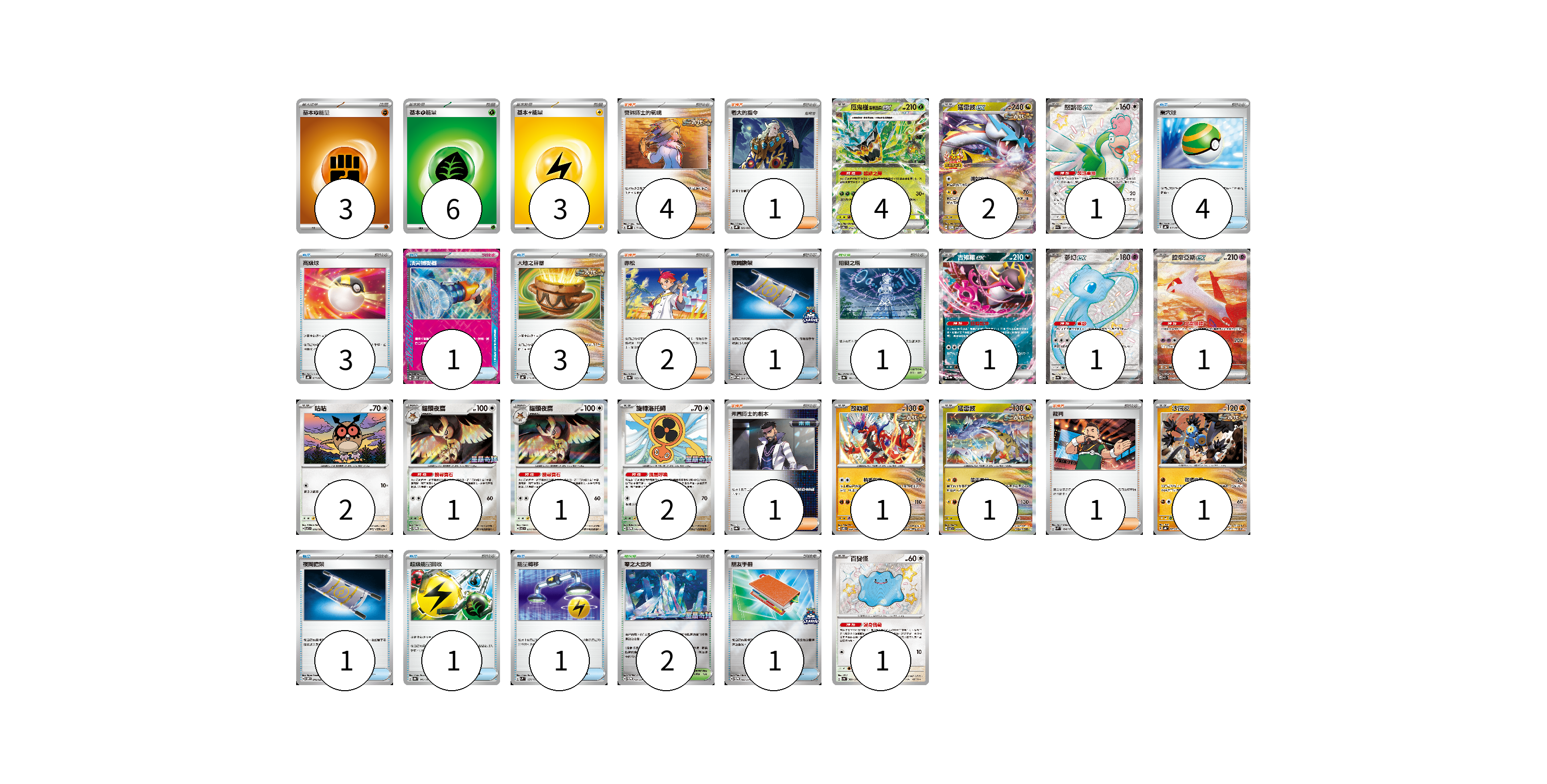 牌組構築方案 以此牌組為基礎新構築牌組 顯示卡面 顯示列表 寶可夢卡(20) 4 2 1 1 1 1 2 1 1 2 1 1 1 1 物品卡(16) 4 3 1 3 1 1 1 1 1 支援者卡(9) 4 1 2 1 1 競技場卡(3) 1 2 能量卡(12) 3 6 3 寶可夢卡(20) 卡牌名稱 張數 卡牌名稱 張數 厄鬼椪 碧草面具ex SV6 016/101 04 猛雷鼓ex SV-P 081/SV-P 02 怒鸚哥ex SV4a 337/190 01 吉雉雞ex SV8a 104/187 01 夢幻ex SV4a 327/190 01 拉帝亞斯ex SV7a 087/064 01 咕咕 SV7 076/102 02 貓頭夜鷹 SV-P 145/SV-P 01 貓頭夜鷹 SV7 077/102 01 旋轉洛托姆 SV-P 146/SV-P 02 故勒頓 SV8 069/106 01 猛雷鼓 SV7 075/102 01 沙鐵皮 SVHK 009/022 01 百變怪 SV4a 309/190 01 物品卡(16) 卡牌名稱 張數 卡牌名稱 張數 巢穴球 SVHK 012/022 04 高級球 SVHK 013/022 03 頂尖捕捉器 SV5M 062/071 01 大地之容器 SVHK 011/022 03 夜間擔架 SV-P 204/SV-P 01 夜間擔架 SVOM 016/021 01 超級能量回收 SV8a 141/187 01 能量轉移 SVM 127/175 01 朋友手冊 SV-P 182/SV-P 01 支援者卡(9) 卡牌名稱 張數 卡牌名稱 張數 奧琳博士的氣魄 SVHK 017/022 04 老大的指令 SVHK 022/022 01 赤松 SV8a 163/187 02 弗圖博士的劇本 SV8a 175/187 01 裁判 SVM 154/175 01 競技場卡(3) 卡牌名稱 張數 卡牌名稱 張數 阻礙之塔 SV8a 181/187 01 零之大空洞 SV-P 151/SV-P 02 能量卡(12) 卡牌名稱 張數 卡牌名稱 張數 基本【鬥】能量 SVHK FIG 03 基本【草】能量 SVF GRA 06 基本【雷】能量 SVF LIG 03 以此牌組為基礎新構築牌組 牌組編碼 FudLwy-BrpkDg-wuwQVJ copy 列印牌組單 牌組編碼已複製 分享至SNS