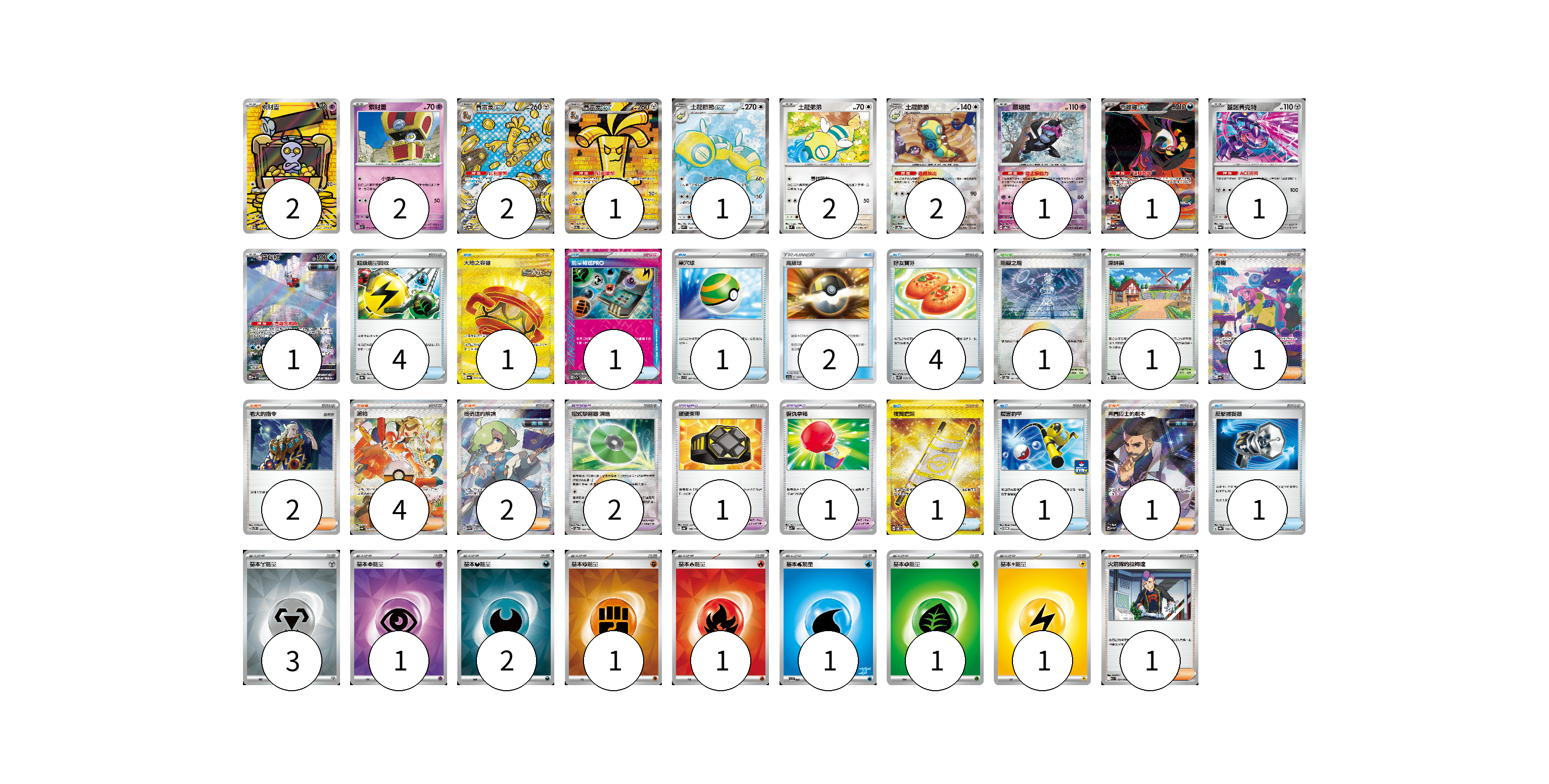 牌組構築方案 以此牌組為基礎新構築牌組 顯示卡面 顯示列表 寶可夢卡(16) 2 2 2 1 1 2 2 1 1 1 1 寶可夢道具(4) 2 1 1 物品卡(16) 4 1 1 1 2 4 1 1 1 支援者卡(11) 1 2 4 2 1 1 競技場卡(2) 1 1 能量卡(11) 3 1 2 1 1 1 1 1 寶可夢卡(16) 卡牌名稱 張數 卡牌名稱 張數 索財靈 SV3a 068/062 02 索財靈 SV7a 024/064 02 賽富豪ex SV8a 220/187 02 賽富豪ex SV3a 087/062 01 土龍節節ex SV9 120/100 01 土龍弟弟 SVM 095/175 02 土龍節節 SV8a 130/187 02 願增猿 SV8a 075/187 01 吉雉雞ex SV6a 089/064 01 蓋諾賽克特 SV6a 040/064 01 鐵包袱 SV4M 071/066 01 寶可夢道具(4) 卡牌名稱 張數 卡牌名稱 張數 招式學習器 演進 SV8a 160/187 02 硬硬束帶 SV4a 166/190 01 復仇拳箱 SV3 102/108 01 物品卡(16) 卡牌名稱 張數 卡牌名稱 張數 超級能量回收 SV8a 141/187 04 大地之容器 SV6a 093/064 01 能量輸送PRO SV7a 052/064 01 巢穴球 SVB 001/028 01 高級球 AC1a 132/158 02 好友寶芬 SV5K 063/071 04 夜間擔架 SV8 137/106 01 厲害釣竿 SV-P 112/SV-P 01 反擊捕捉器 SV8a 139/187 01 支援者卡(11) 卡牌名稱 張數 卡牌名稱 張數 奇樹 SV4a 350/190 01 老大的指令 SVTS 020/022 02 派帕 SV4a 353/190 04 暗碼迷的解讀 SV5M 090/071 02 弗圖博士的劇本 SV4M 086/066 01 火箭隊的拉姆達 SV10 094/098 01 競技場卡(2) 卡牌名稱 張數 卡牌名稱 張數 阻礙之塔 SV8a 181/187 01 深缽鎮 SVK 039/042 01 能量卡(11) 卡牌名稱 張數 卡牌名稱 張數 基本【鋼】能量 SVOD MET 03 基本【超】能量 SVOD PSY 01 基本【惡】能量 SVOM DAR 02 基本【鬥】能量 SVK FIG 01 基本【火】能量 SVK FIR 01 基本【水】能量 SVI WAT 01 基本【草】能量 SVTM GRA 01 基本【雷】能量 SVTR LIG 01 以此牌組為基礎新構築牌組 牌組編碼 FwqzGI-VFUSXw-NMUhUz copy 列印牌組單 牌組編碼已複製 分享至SNS