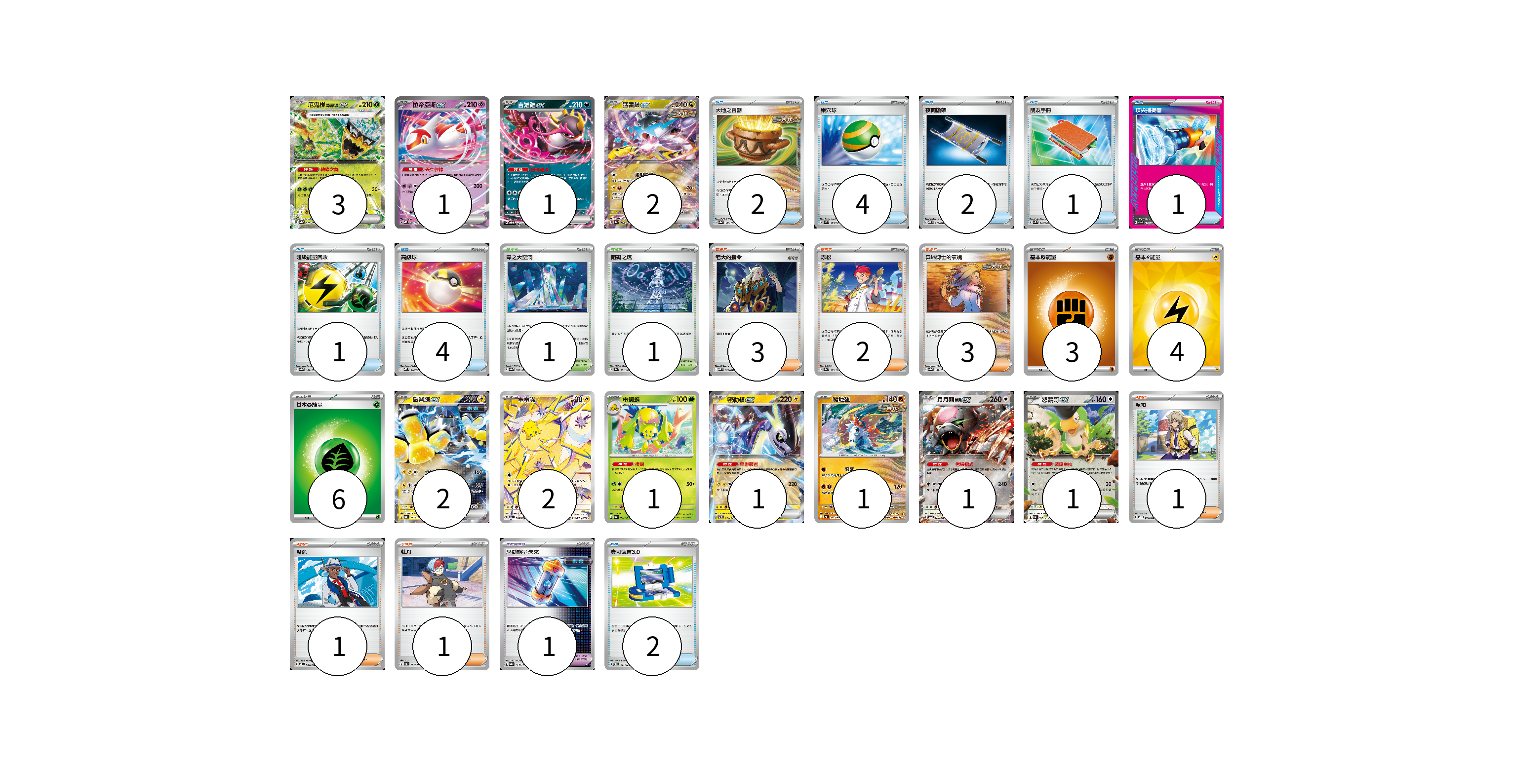 牌組構築方案 以此牌組為基礎新構築牌組 顯示卡面 顯示列表 寶可夢卡(16) 3 1 1 2 2 2 1 1 1 1 1 寶可夢道具(1) 1 物品卡(17) 2 4 2 1 1 1 4 2 支援者卡(11) 3 2 3 1 1 1 競技場卡(2) 1 1 能量卡(13) 3 4 6 寶可夢卡(16) 卡牌名稱 張數 卡牌名稱 張數 厄鬼椪 碧草面具ex SV8a 020/187 03 拉帝亞斯ex MBD 003/022 01 吉雉雞ex SVOD 004/020 01 猛雷鼓ex SV8a 124/187 02 鐵臂膀ex SV8a 054/187 02 電電蟲 SV7 108/102 02 電蜘蛛 SV6a 002/064 01 密勒頓ex SVTR 008/021 01 爬地翅 SV4K 041/066 01 月月熊 赫月 ex SV5a 052/066 01 怒鸚哥ex SVK 006/042 01 寶可夢道具(1) 卡牌名稱 張數 卡牌名稱 張數 驅勁能量 未來 SV8a 158/187 01 物品卡(17) 卡牌名稱 張數 卡牌名稱 張數 大地之容器 SV8a 143/187 02 巢穴球 SVM 133/175 04 夜間擔架 MBD 016/022 02 朋友手冊 SVK 014/042 01 頂尖捕捉器 MBG 014/022 01 超級能量回收 SV8a 141/187 01 高級球 MBD 014/022 04 寶可裝置3.0 SVEL 014/020 02 支援者卡(11) 卡牌名稱 張數 卡牌名稱 張數 老大的指令 MBD 020/022 03 赤松 SV8a 163/187 02 奧琳博士的氣魄 SV8a 167/187 03 派帕 SVOD 018/020 01 席藍 SV8 102/106 01 牡丹 SV4a 182/190 01 競技場卡(2) 卡牌名稱 張數 卡牌名稱 張數 零之大空洞 SV8a 182/187 01 阻礙之塔 SV8a 181/187 01 能量卡(13) 卡牌名稱 張數 卡牌名稱 張數 基本【鬥】能量 M-P FIG 03 基本【雷】能量 SVQP LIG 04 基本【草】能量 M-P GRA 06 以此牌組為基礎新構築牌組 牌組編碼 FxspDh-PGhgCt-GnCKpa copy 列印牌組單 牌組編碼已複製 分享至SNS