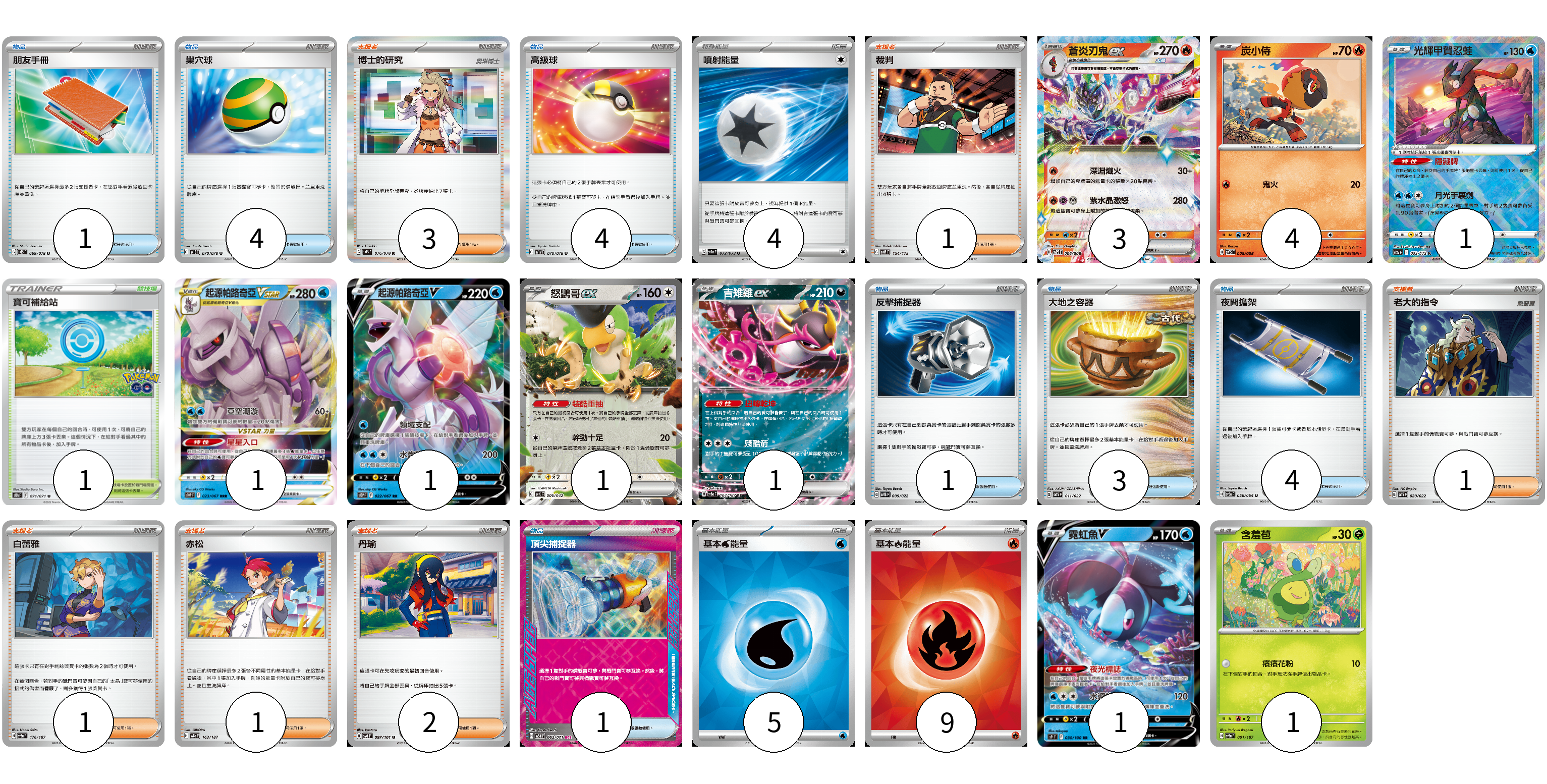 牌組構築方案 以此牌組為基礎新構築牌組 顯示卡面 顯示列表 寶可夢卡(14) 3 4 1 1 1 1 1 1 1 物品卡(18) 1 4 4 1 3 4 1 支援者卡(9) 3 1 1 1 1 2 競技場卡(1) 1 能量卡(18) 4 5 9 寶可夢卡(14) 卡牌名稱 張數 卡牌名稱 張數 蒼炎刃鬼ex SVPS 006/008 03 炭小侍 SVPS 005/008 04 光輝甲賀忍蛙 S12a 033/172 01 起源帕路奇亞VSTAR S10P 023/067 01 起源帕路奇亞V S10P 022/067 01 怒鸚哥ex SVK 006/042 01 吉雉雞ex SV8a 104/187 01 霓虹魚V S9 030/100 01 含羞苞 SV8a 001/187 01 物品卡(18) 卡牌名稱 張數 卡牌名稱 張數 朋友手冊 SV1S 069/078 01 巢穴球 SV1S 070/078 04 高級球 SV1V 070/078 04 反擊捕捉器 SVTS 009/022 01 大地之容器 SVTS 011/022 03 夜間擔架 SV6a 056/064 04 頂尖捕捉器 SV5M 062/071 01 支援者卡(9) 卡牌名稱 張數 卡牌名稱 張數 博士的研究(奧琳博士) SV1S 076/078 03 裁判 SVM 154/175 01 老大的指令 SVTS 020/022 01 白蕾雅 SV8a 176/187 01 赤松 SV8a 163/187 01 丹瑜 SV6 097/101 02 競技場卡(1) 卡牌名稱 張數 卡牌名稱 張數 寶可補給站 S10b 071/071 01 能量卡(18) 卡牌名稱 張數 卡牌名稱 張數 噴射能量 SV1a 072/073 04 基本【水】能量 SVK WAT 05 基本【火】能量 SVK FIR 09 以此牌組為基礎新構築牌組 牌組編碼 FyKmjz-UftPHa-NduavI copy 列印牌組單 牌組編碼已複製 分享至SNS
