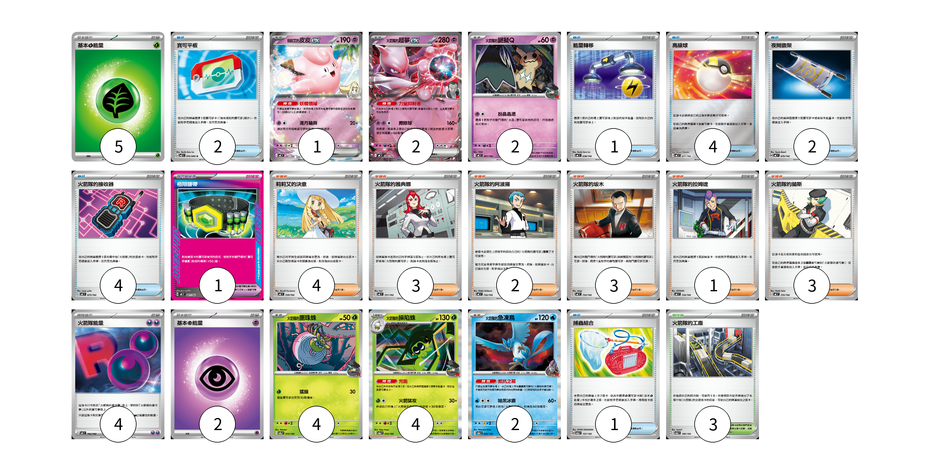 牌組構築方案 以此牌組為基礎新構築牌組 顯示卡面 顯示列表 寶可夢卡(15) 1 2 2 4 4 2 寶可夢道具(1) 1 物品卡(14) 2 1 4 2 4 1 支援者卡(16) 4 3 2 3 1 3 競技場卡(3) 3 能量卡(11) 5 4 2 寶可夢卡(15) 卡牌名稱 張數 卡牌名稱 張數 莉莉艾的皮皮ex MC 287/742 01 <火箭隊的>超夢ex MC 290/742 02 <火箭隊的>謎擬Q MC 341/742 02 <火箭隊的>團珠蛛 M2a 015/193 04 <火箭隊的>操陷蛛 M2a 016/193 04 <火箭隊的>急凍鳥 M2a 034/193 02 寶可夢道具(1) 卡牌名稱 張數 卡牌名稱 張數 極限腰帶 MC 691/742 01 物品卡(14) 卡牌名稱 張數 卡牌名稱 張數 寶可平板 M3 070/080 02 能量轉移 MC 638/742 01 高級球 MC 651/742 04 夜間擔架 MC 670/742 02 火箭隊的接收器 MC 675/742 04 捕蟲組合 M2a 157/193 01 支援者卡(16) 卡牌名稱 張數 卡牌名稱 張數 莉莉艾的決意 MC 729/742 04 火箭隊的雅典娜 MC 731/742 03 火箭隊的阿波羅 MC 732/742 02 火箭隊的坂木 MC 733/742 03 火箭隊的拉姆達 MC 734/742 01 火箭隊的蘭斯 MC 735/742 03 競技場卡(3) 卡牌名稱 張數 卡牌名稱 張數 火箭隊的工廠 M2a 190/193 03 能量卡(11) 卡牌名稱 張數 卡牌名稱 張數 基本【草】能量 MJ GRA 05 火箭隊能量 MC 742/742 04 基本【超】能量 MC PSY 02 以此牌組為基礎新構築牌組 牌組編碼 GBjjfz-ckzNYY-ittJLZ copy 列印牌組單 牌組編碼已複製 分享至SNS