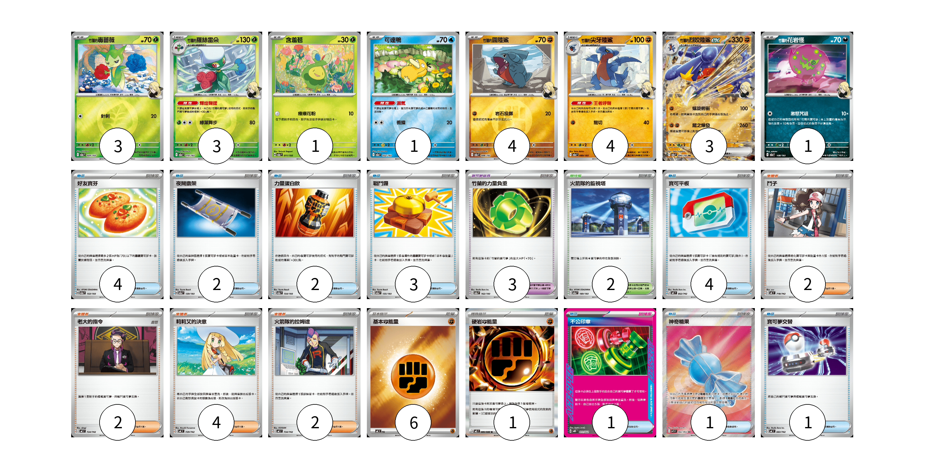牌組構築方案 以此牌組為基礎新構築牌組 顯示卡面 顯示列表 寶可夢卡(20) 3 3 1 1 4 4 3 1 寶可夢道具(3) 3 物品卡(18) 4 2 2 3 4 1 1 1 支援者卡(10) 2 2 4 2 競技場卡(2) 2 能量卡(7) 6 1 寶可夢卡(20) 卡牌名稱 張數 卡牌名稱 張數 竹蘭的毒薔薇 M2a 009/193 03 <竹蘭的>羅絲雷朵 M2a 010/193 03 含羞苞 M2a 011/193 01 可達鴨 M2a 032/193 01 竹蘭的圓陸鯊 M2a 088/193 04 竹蘭的尖牙陸鯊 M2a 089/193 04 <竹蘭的>烈咬陸鯊ex M2a 090/193 03 <竹蘭的>花岩怪 M2a 108/193 01 寶可夢道具(3) 卡牌名稱 張數 卡牌名稱 張數 竹蘭的力量負重 M2a 162/193 03 物品卡(18) 卡牌名稱 張數 卡牌名稱 張數 好友寶芬 M2a 153/193 04 夜間擔架 M2a 159/193 02 力量蛋白飲 M2a 154/193 02 戰鬥鑼 M2a 155/193 03 寶可平板 MC 662/742 04 不公印章 MBD 011/022 01 神奇糖果 M1S 082/063 01 寶可夢交替 MC 663/742 01 支援者卡(10) 卡牌名稱 張數 卡牌名稱 張數 鬥子 MC 718/742 02 老大的指令 MC 724/742 02 莉莉艾的決意 MC 729/742 04 火箭隊的拉姆達 MC 734/742 02 競技場卡(2) 卡牌名稱 張數 卡牌名稱 張數 火箭隊的監視塔 M2a 189/193 02 能量卡(7) 卡牌名稱 張數 卡牌名稱 張數 基本【鬥】能量 MC FIG 06 硬岩【鬥】能量 M3 080/080 01 以此牌組為基礎新構築牌組 牌組編碼 GCDcRt-NYFRuy-HRQQLD copy 列印牌組單 牌組編碼已複製 分享至SNS