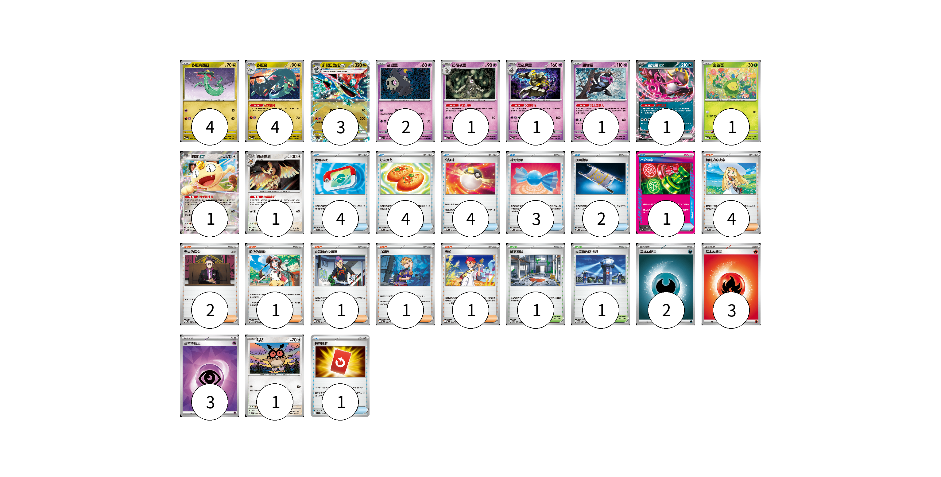 牌組構築方案 以此牌組為基礎新構築牌組 顯示卡面 顯示列表 寶可夢卡(21) 4 4 3 2 1 1 1 1 1 1 1 1 物品卡(19) 4 4 4 3 2 1 1 支援者卡(10) 4 2 1 1 1 1 競技場卡(2) 1 1 能量卡(8) 2 3 3 寶可夢卡(21) 卡牌名稱 張數 卡牌名稱 張數 多龍梅西亞 M2a 132/193 04 多龍奇 M2a 133/193 04 多龍巴魯托ex MC 548/742 03 夜巡靈 MC 308/742 02 彷徨夜靈 MC 309/742 01 黑夜魔靈 MC 310/742 01 願增猿 MC 358/742 01 吉雉雞ex MC 489/742 01 含羞苞 M2a 011/193 01 喵喵ex M3 061/080 01 貓頭夜鷹 MC 573/742 01 咕咕 MC 572/742 01 物品卡(19) 卡牌名稱 張數 卡牌名稱 張數 寶可平板 M3 070/080 04 好友寶芬 MC 648/742 04 高級球 MC 651/742 04 神奇糖果 MC 655/742 03 夜間擔架 MC 670/742 02 不公印章 MC 633/742 01 特殊紅牌 M4 072/083 01 支援者卡(10) 卡牌名稱 張數 卡牌名稱 張數 莉莉艾的決意 MC 729/742 04 老大的指令 MC 724/742 02 鳴依的勉勵 M3 075/080 01 火箭隊的拉姆達 MC 734/742 01 白蕾雅 MC 722/742 01 赤松 MC 696/742 01 競技場卡(2) 卡牌名稱 張數 卡牌名稱 張數 險惡廢墟 M1L 063/063 01 火箭隊的監視塔 M2a 189/193 01 能量卡(8) 卡牌名稱 張數 卡牌名稱 張數 基本【惡】能量 MC DAR 02 基本【火】能量 MC FIR 03 基本【超】能量 SVOD PSY 03 以此牌組為基礎新構築牌組 牌組編碼 GCunGB-fWXZDg-ukODur copy 列印牌組單 牌組編碼已複製 分享至SNS