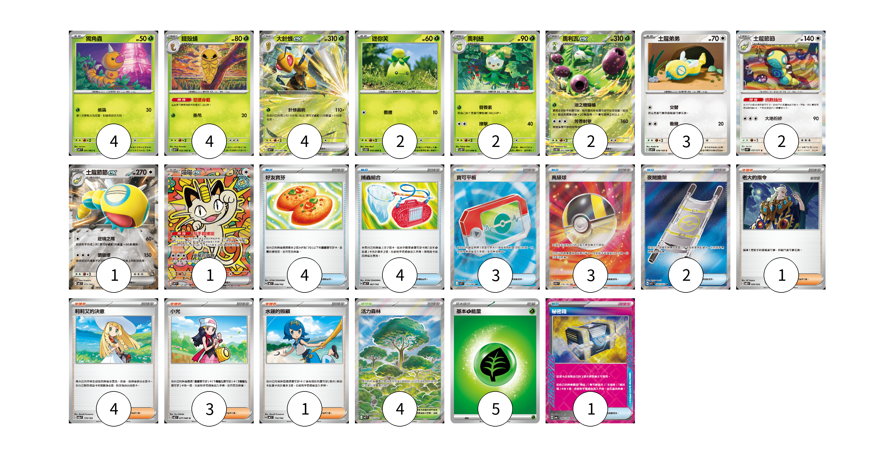 牌組構築方案 以此牌組為基礎新構築牌組 顯示卡面 顯示列表 寶可夢卡(25) 4 4 4 2 2 2 3 2 1 1 物品卡(17) 4 4 3 3 2 1 支援者卡(9) 1 4 3 1 競技場卡(4) 4 能量卡(5) 5 寶可夢卡(25) 卡牌名稱 張數 卡牌名稱 張數 獨角蟲 M4 001/083 04 鐵殼蛹 M4 002/083 04 大針蜂ex M4 003/083 04 迷你芙 SV10 010/098 02 奧利紐 SV10 011/098 02 奧利瓦ex SV10 012/098 02 土龍弟弟 SV9 078/100 03 土龍節節 SV5K 057/071 02 土龍節節ex MC 575/742 01 喵喵ex M3 114/080 01 物品卡(17) 卡牌名稱 張數 卡牌名稱 張數 好友寶芬 MC 648/742 04 捕蟲組合 MC 667/742 04 寶可平板 M3 103/080 03 高級球 M2a 216/193 03 夜間擔架 M1L 083/063 02 秘密箱 SV6 092/101 01 支援者卡(9) 卡牌名稱 張數 卡牌名稱 張數 老大的指令 MBD 020/022 01 莉莉艾的決意 M2a 175/193 04 小光 M2 077/080 03 水蓮的照顧 MC 712/742 01 競技場卡(4) 卡牌名稱 張數 卡牌名稱 張數 活力森林 M3 109/080 04 能量卡(5) 卡牌名稱 張數 卡牌名稱 張數 基本【草】能量 MJ GRA 05 以此牌組為基礎新構築牌組 牌組編碼 GDRXmb-qExPUZ-DGkHQs copy 列印牌組單 牌組編碼已複製 分享至SNS