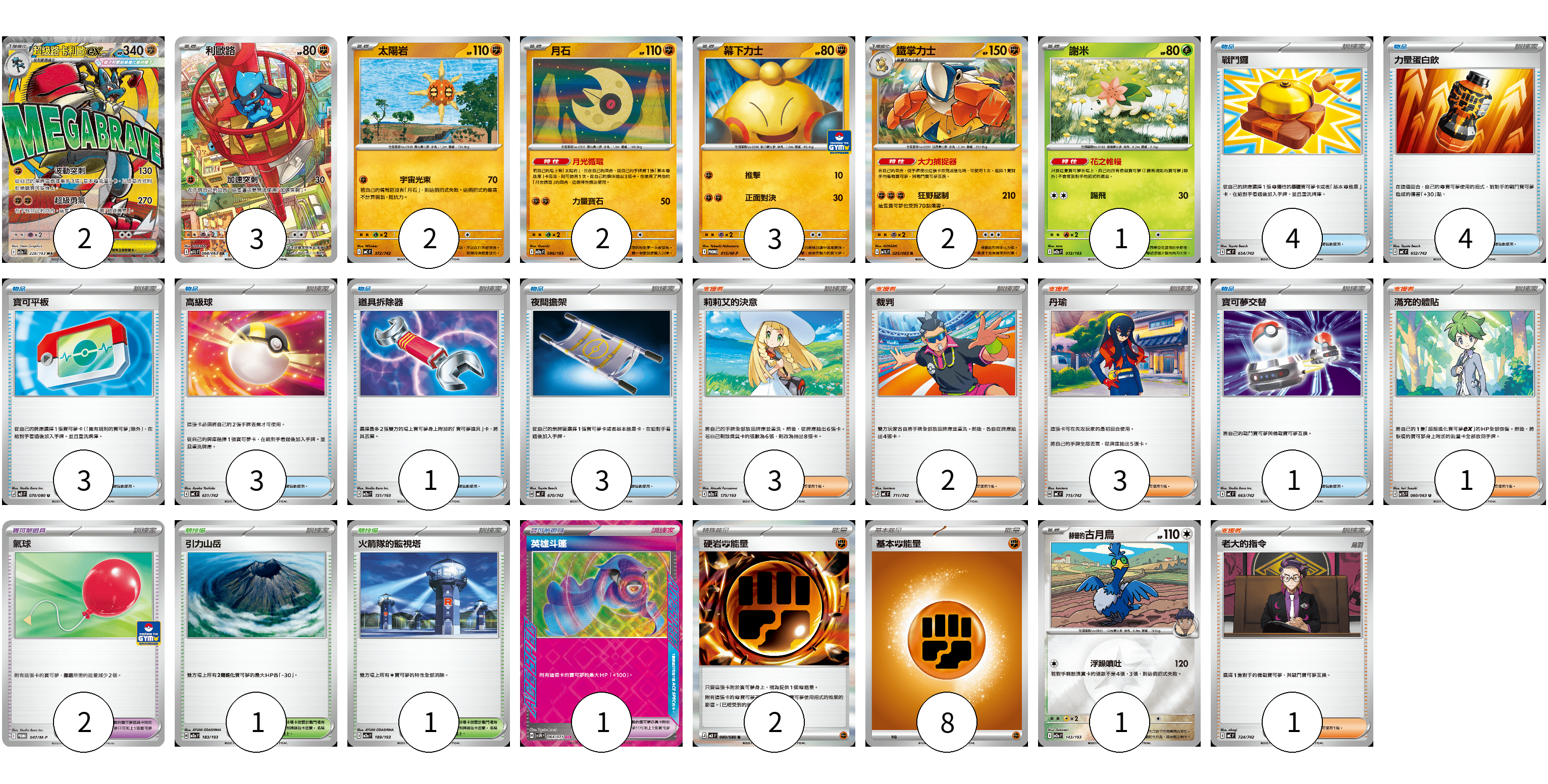 牌組構築方案 以此牌組為基礎新構築牌組 顯示卡面 顯示列表 寶可夢卡(16) 2 3 2 2 3 2 1 1 寶可夢道具(3) 2 1 物品卡(19) 4 4 3 3 1 3 1 支援者卡(10) 3 2 3 1 1 競技場卡(2) 1 1 能量卡(10) 2 8 寶可夢卡(16) 卡牌名稱 張數 卡牌名稱 張數 超級路卡利歐ex M2a 228/193 02 利歐路 M1L 068/063 03 太陽岩 MC 372/742 02 月石 M2a 086/193 02 幕下力士 M-P 015/M-P 03 鐵掌力士 M1L 025/063 02 謝米 M2a 012/193 01 赫普的古月鳥 M2a 143/193 01 寶可夢道具(3) 卡牌名稱 張數 卡牌名稱 張數 氣球 M-P 047/M-P 02 英雄斗篷 SV5M 064/071 01 物品卡(19) 卡牌名稱 張數 卡牌名稱 張數 戰鬥鑼 MC 654/742 04 力量蛋白飲 MC 652/742 04 寶可平板 M3 070/080 03 高級球 MC 651/742 03 道具拆除器 M2a 151/193 01 夜間擔架 MC 670/742 03 寶可夢交替 MC 663/742 01 支援者卡(10) 卡牌名稱 張數 卡牌名稱 張數 莉莉艾的決意 M2a 175/193 03 裁判 MC 711/742 02 丹瑜 MC 715/742 03 滿充的體貼 M1S 060/063 01 老大的指令 MC 724/742 01 競技場卡(2) 卡牌名稱 張數 卡牌名稱 張數 引力山岳 M2a 183/193 01 火箭隊的監視塔 M2a 189/193 01 能量卡(10) 卡牌名稱 張數 卡牌名稱 張數 硬岩【鬥】能量 M3 080/080 02 基本【鬥】能量 MC FIG 08 以此牌組為基礎新構築牌組 牌組編碼 GGfsBM-MKiVCS-GEDtZE copy 列印牌組單 牌組編碼已複製 分享至SNS