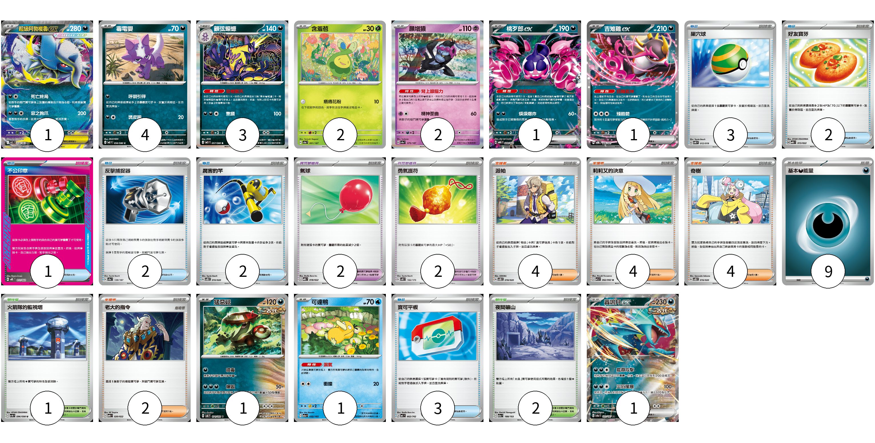 牌組構築方案 以此牌組為基礎新構築牌組 顯示卡面 顯示列表 寶可夢卡(17) 1 4 3 2 2 1 1 1 1 1 寶可夢道具(2) 2 物品卡(15) 3 2 1 2 2 2 3 支援者卡(14) 4 4 4 2 競技場卡(3) 1 2 能量卡(9) 9 寶可夢卡(17) 卡牌名稱 張數 卡牌名稱 張數 超級阿勃梭魯ex M1L 038/063 01 毒電嬰 M2 056/080 04 顫弦蠑螈 M2 057/080 03 含羞苞 SV8a 001/187 02 願增猿 SV8a 075/187 02 桃歹郎ex MBG 009/022 01 吉雉雞ex SVOM 009/021 01 猛惡菇 SV6 071/101 01 可達鴨 M2a 032/193 01 轟鳴月ex SV8a 101/187 01 寶可夢道具(2) 卡牌名稱 張數 卡牌名稱 張數 勇氣護符 SVM 142/175 02 物品卡(15) 卡牌名稱 張數 卡牌名稱 張數 巢穴球 SVTG 012/019 03 好友寶芬 MBD 013/022 02 不公印章 MBD 011/022 01 反擊捕捉器 SV8a 139/187 02 厲害釣竿 SVOD 010/020 02 氣球 MBD 018/022 02 寶可平板 MC 662/742 03 支援者卡(14) 卡牌名稱 張數 卡牌名稱 張數 派帕 SVOD 018/020 04 莉莉艾的決意 M1L 062/063 04 奇樹 SVOD 016/020 04 老大的指令 MBD 020/022 02 競技場卡(3) 卡牌名稱 張數 卡牌名稱 張數 火箭隊的監視塔 SV10 096/098 01 夜間礦山 M2a 188/193 02 能量卡(9) 卡牌名稱 張數 卡牌名稱 張數 基本【惡】能量 SVF DAR 09 以此牌組為基礎新構築牌組 牌組編碼 GJVpBB-XsgLbB-vjExZk copy 列印牌組單 牌組編碼已複製 分享至SNS