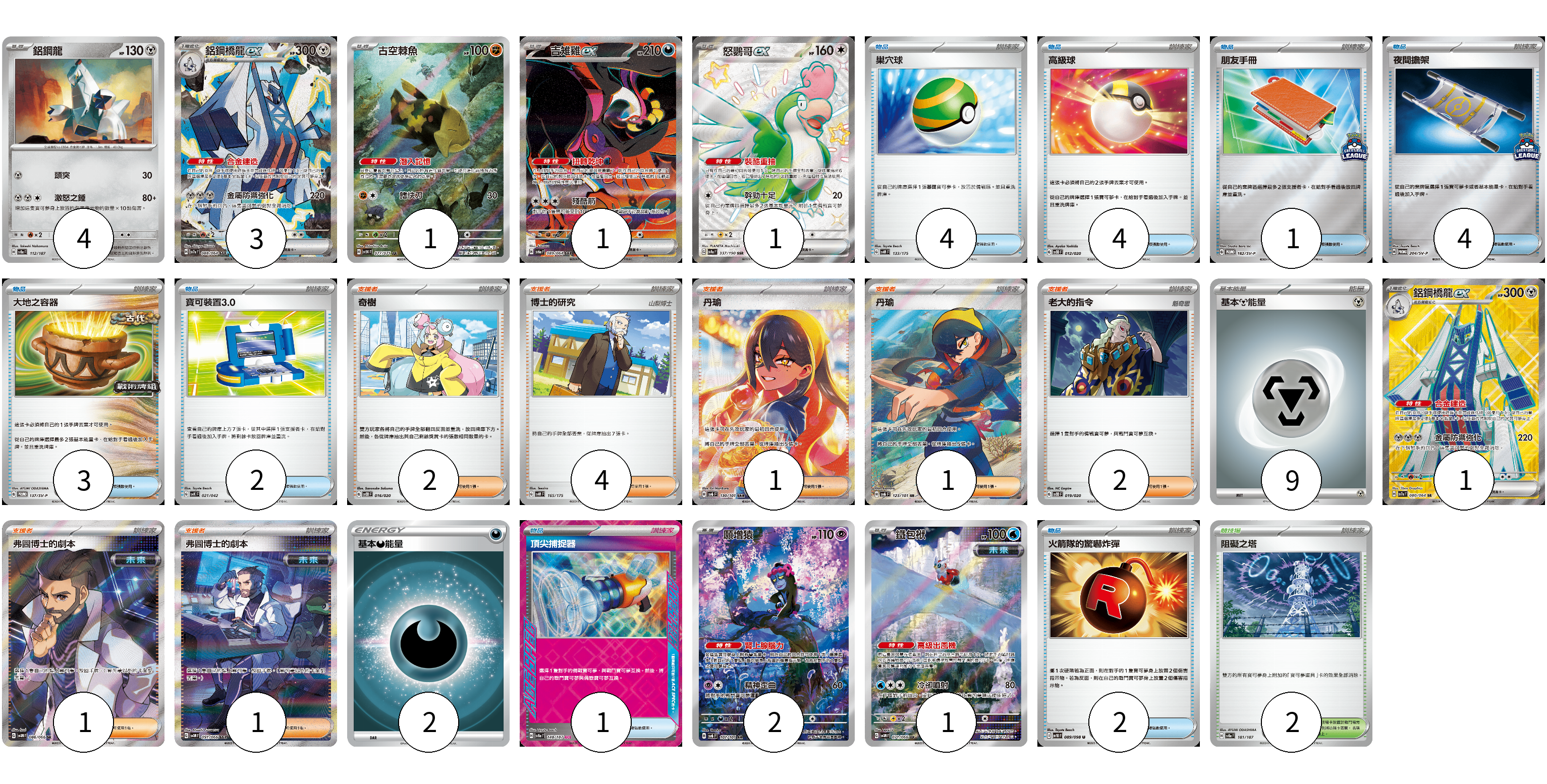 牌組構築方案 以此牌組為基礎新構築牌組 顯示卡面 顯示列表 寶可夢卡(14) 4 3 1 1 1 1 2 1 物品卡(21) 4 4 1 4 3 2 1 2 支援者卡(12) 2 4 1 1 2 1 1 競技場卡(2) 2 能量卡(11) 9 2 寶可夢卡(14) 卡牌名稱 張數 卡牌名稱 張數 鋁鋼龍 SV8a 112/187 04 鋁鋼橋龍ex SV7a 088/064 03 古空棘魚 SV5K 077/071 01 吉雉雞ex SV6a 089/064 01 怒鸚哥ex SV4a 337/190 01 鋁鋼橋龍ex SV7a 080/064 01 願增猿 SV6 107/101 02 鐵包袱 SV4M 071/066 01 物品卡(21) 卡牌名稱 張數 卡牌名稱 張數 巢穴球 SVM 133/175 04 高級球 SVOD 012/020 04 朋友手冊 SV-P 182/SV-P 01 夜間擔架 SV-P 204/SV-P 04 大地之容器 SV-P 137/SV-P 03 寶可裝置3.0 SVK 021/042 02 頂尖捕捉器 SV8a 148/187 01 火箭隊的驚嚇炸彈 SV10 089/098 02 支援者卡(12) 卡牌名稱 張數 卡牌名稱 張數 奇樹 SVOD 016/020 02 博士的研究 SVM 165/175 04 丹瑜 SV6 130/101 01 丹瑜 SV6 123/101 01 老大的指令 SVOD 019/020 02 弗圖博士的劇本 SV4M 086/066 01 弗圖博士的劇本 SV4M 091/066 01 競技場卡(2) 卡牌名稱 張數 卡牌名稱 張數 阻礙之塔 SV8a 181/187 02 能量卡(11) 卡牌名稱 張數 卡牌名稱 張數 基本鋼能量 sv-p MET 09 基本惡能量 SLD DAR 02 以此牌組為基礎新構築牌組 牌組編碼 GKIRYM-epLdde-cAgXtj copy 列印牌組單 牌組編碼已複製 分享至SNS