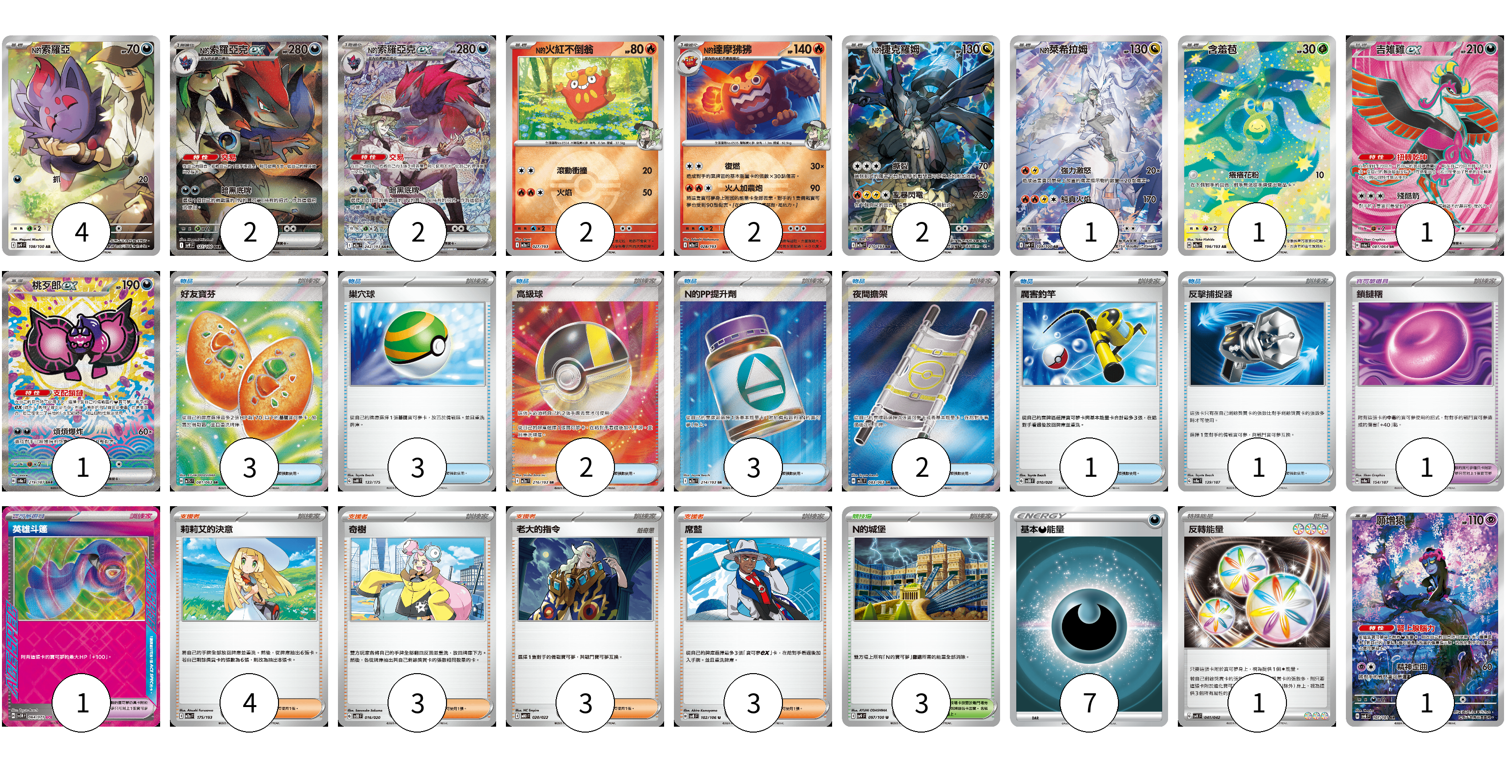 牌組構築方案 以此牌組為基礎新構築牌組 顯示卡面 顯示列表 寶可夢卡(19) 4 2 2 2 2 2 1 1 1 1 1 寶可夢道具(2) 1 1 物品卡(15) 3 3 2 3 2 1 1 支援者卡(13) 4 3 3 3 競技場卡(3) 3 能量卡(8) 7 1 寶可夢卡(19) 卡牌名稱 張數 卡牌名稱 張數 N的索羅亞 SV9 108/100 04 N的索羅亞克ex SV9 127/100 02 N的索羅亞克ex M2a 242/193 02 N的火紅不倒翁 M2a 027/193 02 N的達摩狒狒 M2a 028/193 02 N的捷克羅姆 M2a 210/193 02 N的萊希拉姆 SV9 109/100 01 含羞苞 M2a 196/193 01 吉雉雞ex SV6a 081/064 01 桃歹郎ex SV8a 219/187 01 願增猿 SV6 107/101 01 寶可夢道具(2) 卡牌名稱 張數 卡牌名稱 張數 鎖鏈糬 SV8a 154/187 01 英雄斗篷 SV5M 064/071 01 物品卡(15) 卡牌名稱 張數 卡牌名稱 張數 好友寶芬 M1S 081/063 03 巢穴球 SVM 133/175 03 高級球 M2a 216/193 02 N的PP提升劑 M2a 214/193 03 夜間擔架 M1L 083/063 02 厲害釣竿 SVOD 010/020 01 反擊捕捉器 SV8a 139/187 01 支援者卡(13) 卡牌名稱 張數 卡牌名稱 張數 莉莉艾的決意 M2a 175/193 04 奇樹 SVOD 016/020 03 老大的指令 MBD 020/022 03 席藍 SV8 102/106 03 競技場卡(3) 卡牌名稱 張數 卡牌名稱 張數 N的城堡 SV9 097/100 03 能量卡(8) 卡牌名稱 張數 卡牌名稱 張數 基本惡能量 SLD DAR 07 反轉能量 SVK 041/042 01 以此牌組為基礎新構築牌組 牌組編碼 GKOpMz-XZZQCp-rEWPNT copy 列印牌組單 牌組編碼已複製 分享至SNS