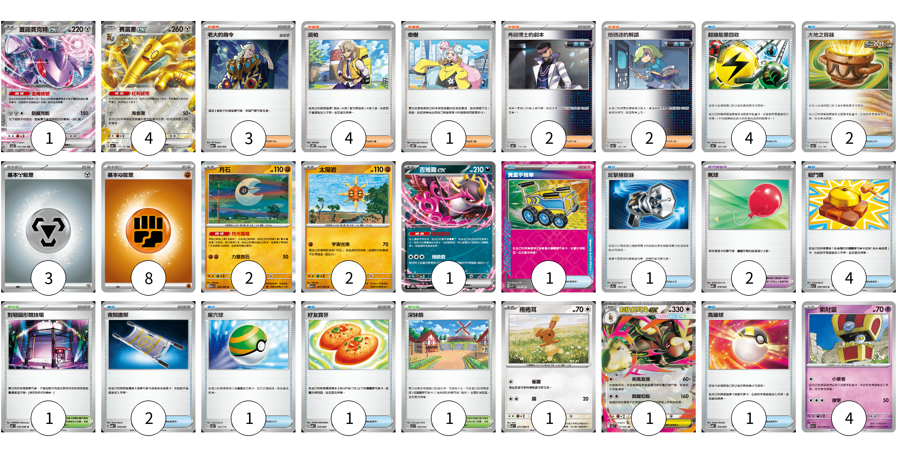 牌組構築方案 以此牌組為基礎新構築牌組 顯示卡面 顯示列表 寶可夢卡(16) 1 4 2 2 1 1 1 4 物品卡(19) 4 2 1 1 2 4 2 1 1 1 支援者卡(12) 3 4 1 2 2 競技場卡(2) 1 1 能量卡(11) 3 8 寶可夢卡(16) 卡牌名稱 張數 卡牌名稱 張數 蓋諾賽克特ex SV11B 069/086 01 賽富豪ex SV8a 117/187 04 月石 M1L 026/063 02 太陽岩 M1L 027/063 02 吉雉雞ex SVOD 004/020 01 捲捲耳 M2 071/080 01 超級長耳兔ex M2 072/080 01 索財靈 SV7a 024/064 04 物品卡(19) 卡牌名稱 張數 卡牌名稱 張數 超級能量回收 SV8a 141/187 04 大地之容器 SV8a 143/187 02 貴重手推車 SVK 020/042 01 反擊捕捉器 SV8a 139/187 01 氣球 MBD 018/022 02 戰鬥鑼 M1L 059/063 04 夜間擔架 MBD 016/022 02 巢穴球 SVM 133/175 01 好友寶芬 MBD 013/022 01 高級球 MBD 014/022 01 支援者卡(12) 卡牌名稱 張數 卡牌名稱 張數 老大的指令 MBD 020/022 03 派帕 SVOD 018/020 04 奇樹 SVOD 016/020 01 弗圖博士的劇本 SV8a 175/187 02 暗碼迷的解讀 SV8a 165/187 02 競技場卡(2) 卡牌名稱 張數 卡牌名稱 張數 對戰圓形競技場 M2 079/080 01 深缽鎮 SVK 039/042 01 能量卡(11) 卡牌名稱 張數 卡牌名稱 張數 基本【鋼】能量 M-P MET 03 基本【鬥】能量 M-P FIG 08 以此牌組為基礎新構築牌組 牌組編碼 GLAsRM-rqizQD-JtFrNL copy 列印牌組單 牌組編碼已複製 分享至SNS