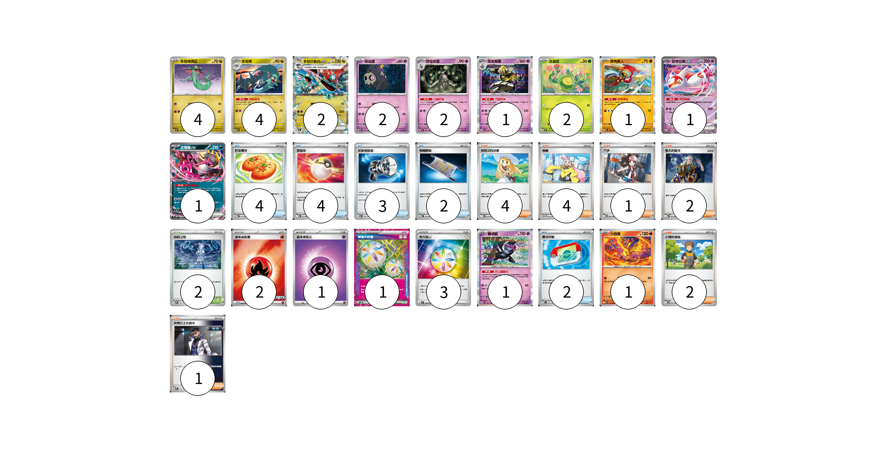 牌組構築方案 以此牌組為基礎新構築牌組 顯示卡面 顯示列表 寶可夢卡(22) 4 4 2 2 2 1 2 1 1 1 1 1 物品卡(15) 4 4 3 2 2 支援者卡(14) 4 4 1 2 2 1 競技場卡(2) 2 能量卡(7) 2 1 1 3 寶可夢卡(22) 卡牌名稱 張數 卡牌名稱 張數 多龍梅西亞 SV8a 118/187 04 多龍奇 SV8a 119/187 04 多龍巴魯托ex SV8a 120/187 02 夜巡靈 SV8a 064/187 02 彷徨夜靈 SV8a 065/187 02 黑夜魔靈 SV8a 066/187 01 含羞苞 SV8a 001/187 02 摔角鷹人 SV8a 084/187 01 拉帝亞斯ex MBD 003/022 01 吉雉雞ex SVOM 009/021 01 願增猿 M2a 081/193 01 火焰鳥 M2 014/080 01 物品卡(15) 卡牌名稱 張數 卡牌名稱 張數 好友寶芬 MBG 011/022 04 高級球 MBG 012/022 04 反擊捕捉器 SV8a 139/187 03 夜間擔架 MBD 016/022 02 寶可平板 MC 662/742 02 支援者卡(14) 卡牌名稱 張數 卡牌名稱 張數 莉莉艾的決意 MBG 022/022 04 奇樹 SVOM 018/021 04 鬥子 SV11W 085/086 01 老大的指令 MBG 021/022 02 小剛的發掘 SV9 096/100 02 弗圖博士的劇本 SV8a 175/187 01 競技場卡(2) 卡牌名稱 張數 卡牌名稱 張數 阻礙之塔 SV8a 181/187 02 能量卡(7) 卡牌名稱 張數 卡牌名稱 張數 基本【火】能量 M-P 032/M-P 02 基本【超】能量 M-P PSY 01 新衝天能量 SV5K 071/071 01 夜光能量 SV4a 190/190 03 以此牌組為基礎新構築牌組 牌組編碼 GLAsxO-fCzKpc-rQzgwh copy 列印牌組單 牌組編碼已複製 分享至SNS