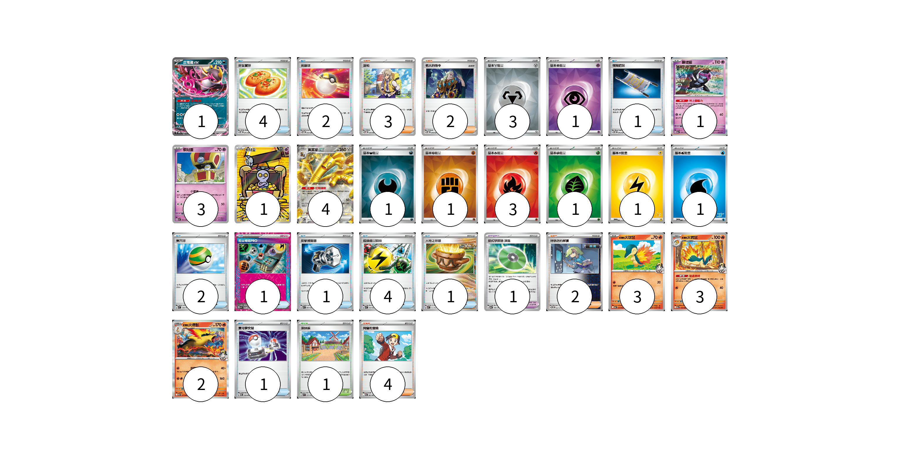牌組構築方案 以此牌組為基礎新構築牌組 顯示卡面 顯示列表 寶可夢卡(18) 1 1 3 1 4 3 3 2 寶可夢道具(1) 1 物品卡(17) 4 2 1 2 1 1 4 1 1 支援者卡(11) 3 2 2 4 競技場卡(1) 1 能量卡(12) 3 1 1 1 3 1 1 1 寶可夢卡(18) 卡牌名稱 張數 卡牌名稱 張數 吉雉雞ex SVOD 004/020 01 願增猿 SV8a 075/187 01 索財靈 SV7a 024/064 03 索財靈 SV3a 068/062 01 賽富豪ex SV8a 117/187 04 <阿響的>火球鼠 SV9a 015/063 03 <阿響的>火岩鼠 SV9a 016/063 03 <阿響的>火爆獸 SV9a 017/063 02 寶可夢道具(1) 卡牌名稱 張數 卡牌名稱 張數 招式學習器 演進 SV8a 160/187 01 物品卡(17) 卡牌名稱 張數 卡牌名稱 張數 好友寶芬 SVOD 011/020 04 高級球 SVOD 012/020 02 夜間擔架 SVOM 016/021 01 巢穴球 SVM 133/175 02 能量輸送PRO SV7a 052/064 01 反擊捕捉器 SVK 009/042 01 超級能量回收 SVK 010/042 04 大地之容器 SVK 012/042 01 寶可夢交替 SV9a 058/063 01 支援者卡(11) 卡牌名稱 張數 卡牌名稱 張數 派帕 SVOD 018/020 03 老大的指令 SVOD 019/020 02 暗碼迷的解讀 SV5M 067/071 02 阿響的冒險 SV9a 063/063 04 競技場卡(1) 卡牌名稱 張數 卡牌名稱 張數 深缽鎮 SVK 039/042 01 能量卡(12) 卡牌名稱 張數 卡牌名稱 張數 基本【鋼】能量 SVOD MET 03 基本【超】能量 SVOD PSY 01 基本【惡】能量 SVOM DAR 01 基本【鬥】能量 SVK FIG 01 基本【火】能量 SVK FIR 03 基本【草】能量 SVK GRA 01 基本【雷】能量 SVI LIG 01 基本【水】能量 SVI WAT 01 以此牌組為基礎新構築牌組 牌組編碼 GLRjVT-evKIEK-FOMItO copy 列印牌組單 牌組編碼已複製 分享至SNS