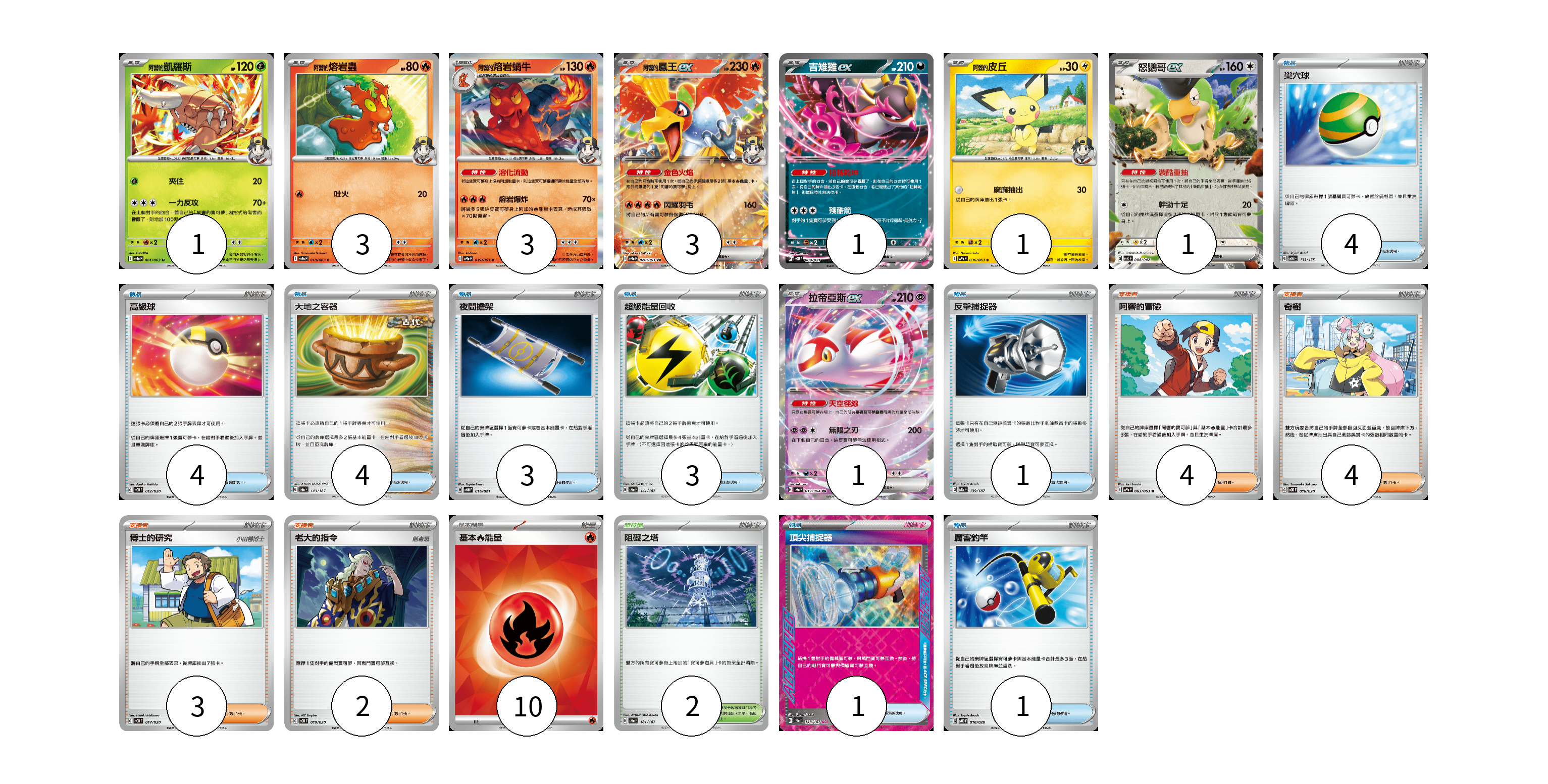 牌組構築方案 以此牌組為基礎新構築牌組 顯示卡面 顯示列表 寶可夢卡(14) 1 3 3 3 1 1 1 1 物品卡(21) 4 4 4 3 3 1 1 1 支援者卡(13) 4 4 3 2 競技場卡(2) 2 能量卡(10) 10 寶可夢卡(14) 卡牌名稱 張數 卡牌名稱 張數 <阿響的>凱羅斯 SV9a 001/063 01 <阿響的>熔岩蟲 SV9a 018/063 03 <阿響的>熔岩蝸牛 SV9a 019/063 03 <阿響的>鳳王ex SV9a 020/063 03 吉雉雞ex SVOM 009/021 01 <阿響的>皮丘 SV9a 036/063 01 怒鸚哥ex SVK 006/042 01 拉帝亞斯ex SV7a 019/064 01 物品卡(21) 卡牌名稱 張數 卡牌名稱 張數 巢穴球 SVM 133/175 04 高級球 SVOD 012/020 04 大地之容器 SV8a 143/187 04 夜間擔架 SVOM 016/021 03 超級能量回收 SV8a 141/187 03 反擊捕捉器 SV8a 139/187 01 頂尖捕捉器 SV8a 148/187 01 厲害釣竿 SVOD 010/020 01 支援者卡(13) 卡牌名稱 張數 卡牌名稱 張數 阿響的冒險 SV9a 063/063 04 奇樹 SVOD 016/020 04 博士的研究 SVOD 017/020 03 老大的指令 SVOD 019/020 02 競技場卡(2) 卡牌名稱 張數 卡牌名稱 張數 阻礙之塔 SV8a 181/187 02 能量卡(10) 卡牌名稱 張數 卡牌名稱 張數 基本【火】能量 SVK FIR 10 以此牌組為基礎新構築牌組 牌組編碼 GLVzdK-zjExPA-AYgfxm copy 列印牌組單 牌組編碼已複製 分享至SNS