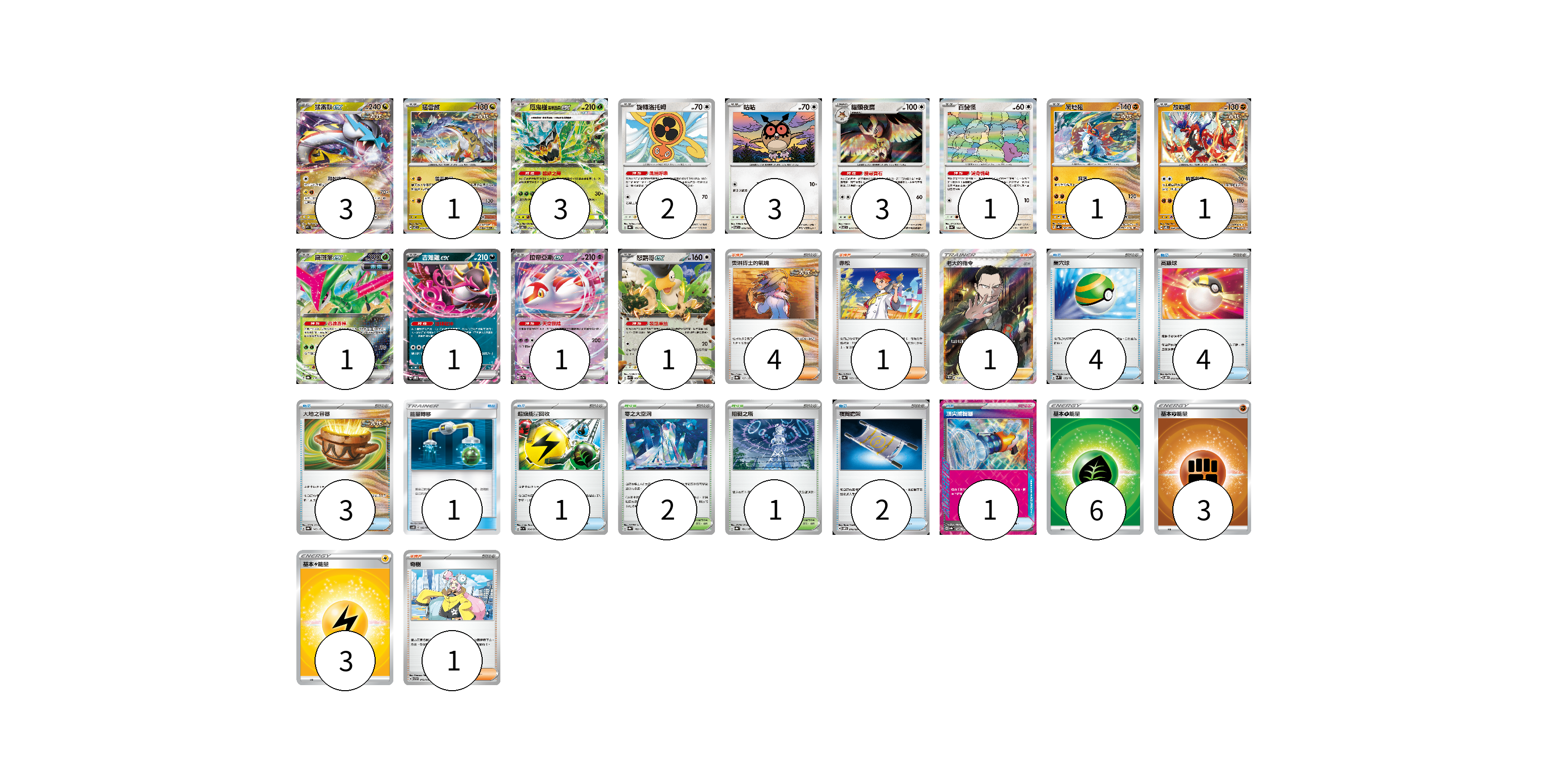 牌組構築方案 以此牌組為基礎新構築牌組 顯示卡面 顯示列表 寶可夢卡(22) 3 1 3 2 3 3 1 1 1 1 1 1 1 物品卡(16) 4 4 3 1 1 2 1 支援者卡(7) 4 1 1 1 競技場卡(3) 2 1 能量卡(12) 6 3 3 寶可夢卡(22) 卡牌名稱 張數 卡牌名稱 張數 猛雷鼓ex SV5K 053/071 03 猛雷鼓 SV7 075/102 01 厄鬼椪 碧草面具ex SV6 016/101 03 旋轉洛托姆 SV8a 131/187 02 咕咕 SV7 076/102 03 貓頭夜鷹 SV7 077/102 03 百變怪 SV4a 144/190 01 爬地翅 SV4K 041/066 01 故勒頓 SV8 069/106 01 鐵斑葉ex SV8a 016/187 01 吉雉雞ex SVOD 004/020 01 拉帝亞斯ex SV7a 019/064 01 怒鸚哥ex SVK 006/042 01 物品卡(16) 卡牌名稱 張數 卡牌名稱 張數 巢穴球 SVM 133/175 04 高級球 SVOD 012/020 04 大地之容器 SV8a 143/187 03 能量轉移 AS6D 142/168 01 超級能量回收 SV1a 064/073 01 夜間擔架 SVOM 016/021 02 頂尖捕捉器 SV8a 148/187 01 支援者卡(7) 卡牌名稱 張數 卡牌名稱 張數 奧琳博士的氣魄 SV8a 167/187 04 赤松 SV8a 163/187 01 老大的指令(坂木) SC1b 170/153 01 奇樹 SVTH 015/018 01 競技場卡(3) 卡牌名稱 張數 卡牌名稱 張數 零之大空洞 SV8a 182/187 02 阻礙之塔 SV8a 181/187 01 能量卡(12) 卡牌名稱 張數 卡牌名稱 張數 基本【草】能量 SI GRA 06 基本【鬥】能量 SI FIG 03 基本【雷】能量 SI LIG 03 以此牌組為基礎新構築牌組 牌組編碼 GOVCPM-ejbcIm-hHwnZr copy 列印牌組單 牌組編碼已複製 分享至SNS