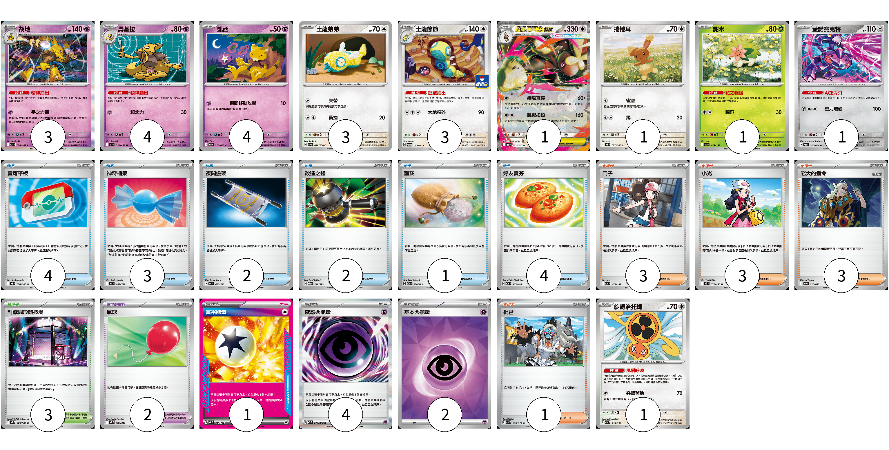 牌組構築方案 以此牌組為基礎新構築牌組 顯示卡面 顯示列表 寶可夢卡(22) 3 4 4 3 3 1 1 1 1 1 寶可夢道具(2) 2 物品卡(16) 4 3 2 2 1 4 支援者卡(10) 3 3 3 1 競技場卡(3) 3 能量卡(7) 1 4 2 寶可夢卡(22) 卡牌名稱 張數 卡牌名稱 張數 胡地 M1S 038/063 03 勇基拉 M1S 037/063 04 凱西 M1S 036/063 04 土龍弟弟 SV9 078/100 03 土龍節節 M-P 045/M-P 03 超級長耳兔ex M2 072/080 01 捲捲耳 M2 071/080 01 謝米 M2a 012/193 01 蓋諾賽克特 SV6a 040/064 01 旋轉洛托姆 M2a 139/193 01 寶可夢道具(2) 卡牌名稱 張數 卡牌名稱 張數 氣球 MC 688/742 02 物品卡(16) 卡牌名稱 張數 卡牌名稱 張數 寶可平板 M3 070/080 04 神奇糖果 MC 655/742 03 夜間擔架 MC 670/742 02 改造之錘 M2a 148/193 02 聖灰 M2a 150/193 01 好友寶芬 M2a 153/193 04 支援者卡(10) 卡牌名稱 張數 卡牌名稱 張數 鬥子 M2a 172/193 03 小光 M2 077/080 03 老大的指令 MBD 020/022 03 枇琶 SV5K 068/071 01 競技場卡(3) 卡牌名稱 張數 卡牌名稱 張數 對戰圓形競技場 M2 079/080 03 能量卡(7) 卡牌名稱 張數 卡牌名稱 張數 富裕能量 MC 740/742 01 感應【超】能量 M3 079/080 04 基本【超】能量 SVOD PSY 02 以此牌組為基礎新構築牌組 牌組編碼 GQSloB-TCqCYe-izBIfy copy 列印牌組單 牌組編碼已複製 分享至SNS