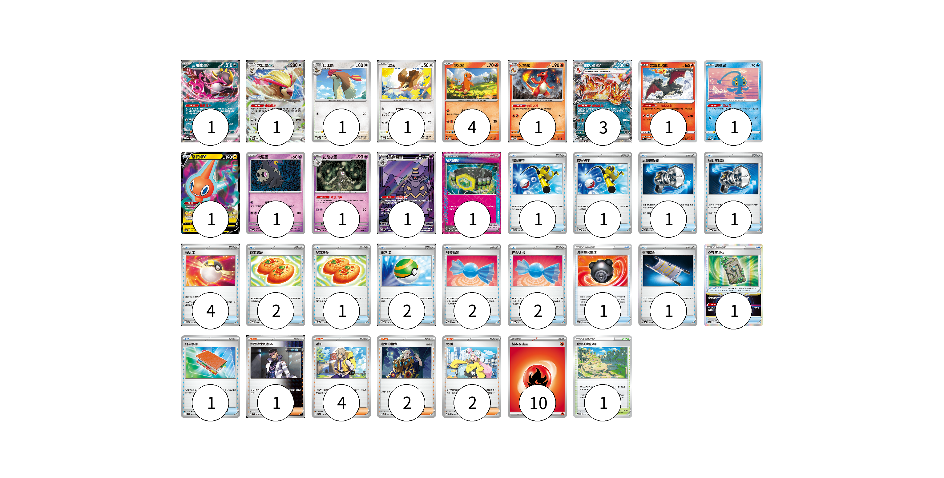 牌組構築方案 以此牌組為基礎新構築牌組 顯示卡面 顯示列表 寶可夢卡(18) 1 1 1 1 4 1 3 1 1 1 1 1 1 寶可夢道具(4) 1 1 2 物品卡(20) 1 1 1 1 4 2 1 2 2 2 1 1 1 支援者卡(7) 1 4 2 競技場卡(1) 1 能量卡(10) 10 寶可夢卡(18) 卡牌名稱 張數 卡牌名稱 張數 吉雉雞ex SV8a 104/187 01 大比鳥ex SV4a 139/190 01 比比鳥 SV4a 138/190 01 波波 SV4a 137/190 01 小火龍 SVTL 001/021 04 火恐龍 SVTL 002/021 01 噴火龍ex SVTL 006/021 03 光輝噴火龍 SVTL 003/021 01 瑪納霏 S12a 029/172 01 洛托姆V S11 037/100 01 夜巡靈 SV6a 018/064 01 彷徨夜靈 SV6a 019/064 01 黑夜魔靈 SV6a 070/064 01 寶可夢道具(4) 卡牌名稱 張數 卡牌名稱 張數 極限腰帶 SV8a 159/187 01 森林封印石 S12 092/098 01 奇樹 SVTL 018/021 02 物品卡(20) 卡牌名稱 張數 卡牌名稱 張數 厲害釣竿 SVTL 009/021 01 厲害釣竿 SV4a 158/190 01 反擊捕捉器 SVTS 009/022 01 反擊捕捉器 SV8a 139/187 01 高級球 SVTL 012/021 04 好友寶芬 SVTL 010/021 02 好友寶芬 SV8a 147/187 01 巢穴球 SVTL 011/021 02 神奇糖果 SVTL 013/021 02 神奇糖果 SV3a 053/062 02 洗翠的沉重球 S10P 062/067 01 夜間擔架 SV6a 056/064 01 朋友手冊 SV1S 069/078 01 支援者卡(7) 卡牌名稱 張數 卡牌名稱 張數 弗圖博士的劇本 SV8a 175/187 01 派帕 SVTL 020/021 04 老大的指令 SVTL 021/021 02 競技場卡(1) 卡牌名稱 張數 卡牌名稱 張數 崩塌的競技場 S12a 167/172 01 能量卡(10) 卡牌名稱 張數 卡牌名稱 張數 基本【火】能量 SVTL FIR 10 以此牌組為基礎新構築牌組 牌組編碼 GSwgDa-cjZLqL-PHMioM copy 列印牌組單 牌組編碼已複製 分享至SNS