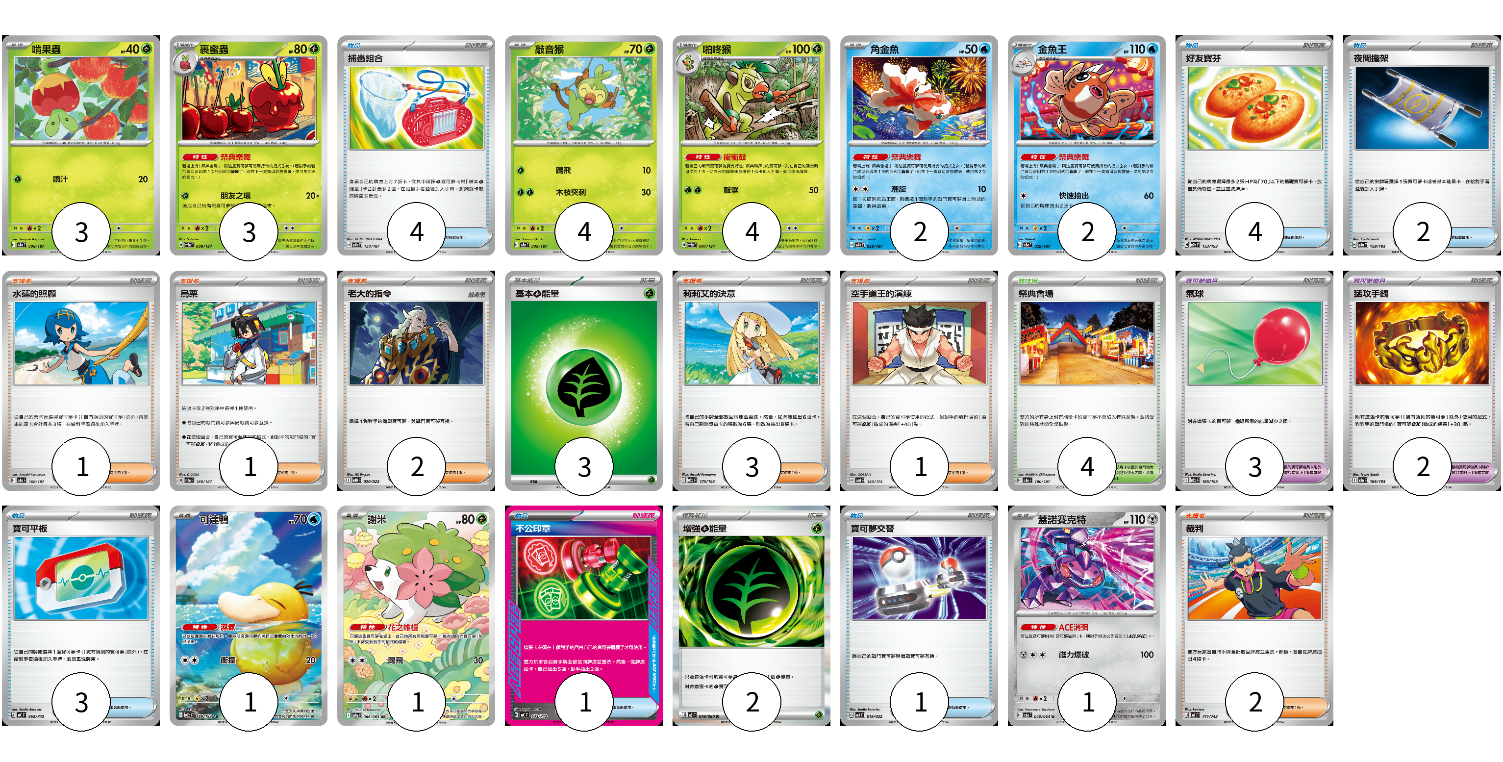 牌組構築方案 以此牌組為基礎新構築牌組 顯示卡面 顯示列表 寶可夢卡(21) 3 3 4 4 2 2 1 1 1 寶可夢道具(5) 3 2 物品卡(15) 4 4 2 3 1 1 支援者卡(10) 1 1 2 3 1 2 競技場卡(4) 4 能量卡(5) 3 2 寶可夢卡(21) 卡牌名稱 張數 卡牌名稱 張數 啃果蟲 SV8a 008/187 03 裹蜜蟲 SV8a 009/187 03 敲音猴 SV8a 006/187 04 啪咚猴 SV8a 007/187 04 角金魚 SV8a 028/187 02 金魚王 SV8a 029/187 02 可達鴨 M2a 199/193 01 謝米 SV9a 066/063 01 蓋諾賽克特 SV6a 040/064 01 寶可夢道具(5) 卡牌名稱 張數 卡牌名稱 張數 氣球 M2a 165/193 03 猛攻手鐲 M2a 166/193 02 物品卡(15) 卡牌名稱 張數 卡牌名稱 張數 捕蟲組合 SV8a 150/187 04 好友寶芬 M2a 153/193 04 夜間擔架 M2a 159/193 02 寶可平板 MC 662/742 03 不公印章 MC 633/742 01 寶可夢交替 MJ 019/022 01 支援者卡(10) 卡牌名稱 張數 卡牌名稱 張數 水蓮的照顧 SV8a 168/187 01 烏栗 SV8a 169/187 01 老大的指令 MBD 020/022 02 莉莉艾的決意 M2a 175/193 03 空手道王的演練 SVM 143/175 01 裁判 MC 711/742 02 競技場卡(4) 卡牌名稱 張數 卡牌名稱 張數 祭典會場 SV8a 180/187 04 能量卡(5) 卡牌名稱 張數 卡牌名稱 張數 基本【草】能量 M-P GRA 03 增強【草】能量 M3 078/080 02 以此牌組為基礎新構築牌組 牌組編碼 GUlKeh-DOCFmX-AqxpEw copy 列印牌組單 牌組編碼已複製 分享至SNS