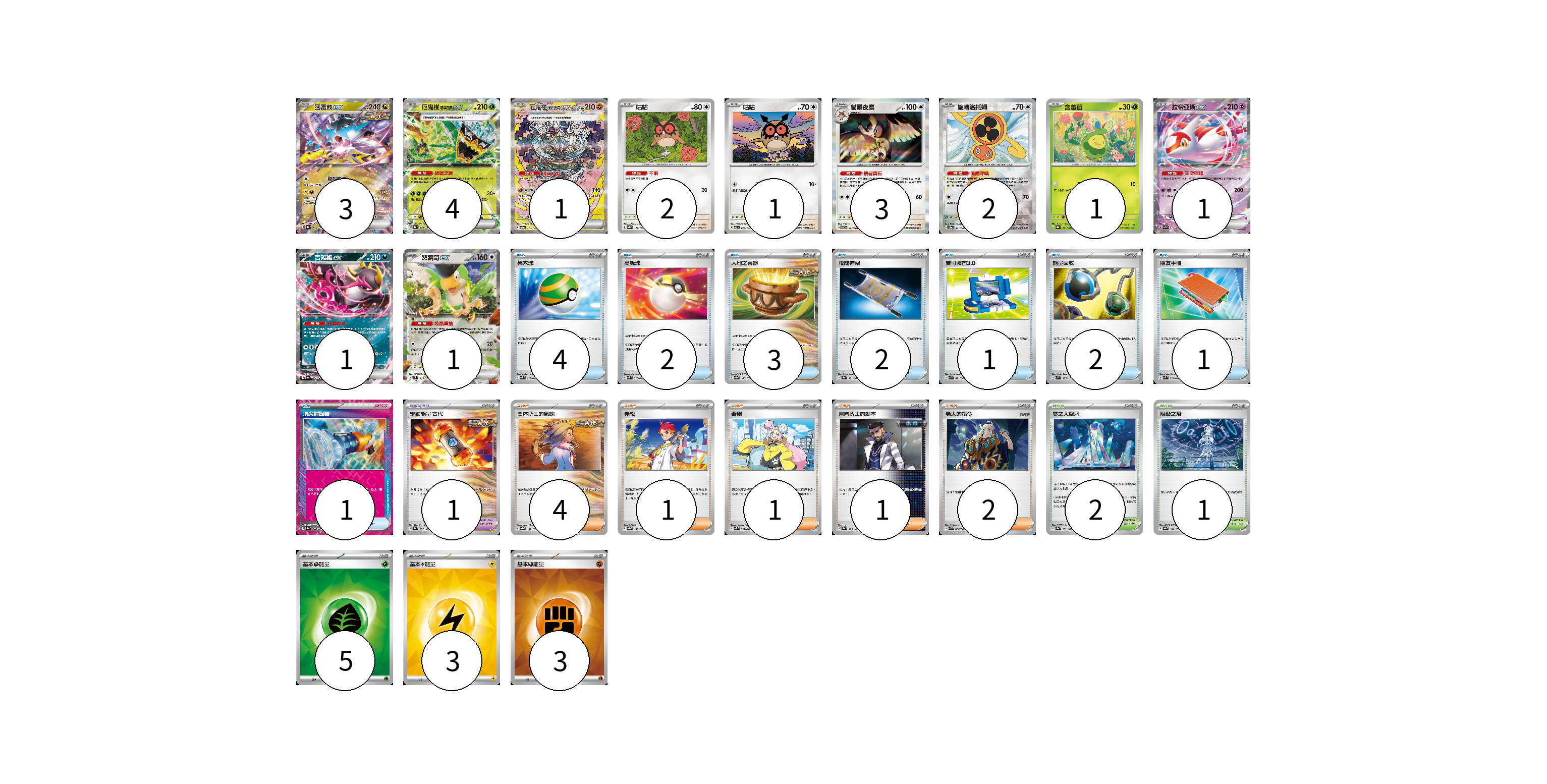 牌組構築方案 以此牌組為基礎新構築牌組 顯示卡面 顯示列表 寶可夢卡(20) 3 4 1 2 1 3 2 1 1 1 1 寶可夢道具(1) 1 物品卡(16) 4 2 3 2 1 2 1 1 支援者卡(9) 4 1 1 1 2 競技場卡(3) 2 1 能量卡(11) 5 3 3 寶可夢卡(20) 卡牌名稱 張數 卡牌名稱 張數 猛雷鼓ex SV8a 124/187 03 厄鬼椪 碧草面具ex SV8a 020/187 04 厄鬼椪 礎石面具ex SV8a 216/187 01 咕咕 SV8a 127/187 02 咕咕 SV7 076/102 01 貓頭夜鷹 SV7 077/102 03 旋轉洛托姆 SV8a 131/187 02 含羞苞 SV8a 001/187 01 拉帝亞斯ex SV7a 019/064 01 吉雉雞ex SV6a 038/064 01 怒鸚哥ex SV2P 065/071 01 寶可夢道具(1) 卡牌名稱 張數 卡牌名稱 張數 驅勁能量 古代 SV8a 157/187 01 物品卡(16) 卡牌名稱 張數 卡牌名稱 張數 巢穴球 SVK 016/042 04 高級球 SVK 018/042 02 大地之容器 SV8a 143/187 03 夜間擔架 SV8a 151/187 02 寶可裝置3.0 SVK 021/042 01 能量回收 SVM 125/175 02 朋友手冊 SVK 014/042 01 頂尖捕捉器 SV8a 148/187 01 支援者卡(9) 卡牌名稱 張數 卡牌名稱 張數 奧琳博士的氣魄 SV8a 167/187 04 赤松 SV8a 163/187 01 奇樹 SVK 031/042 01 弗圖博士的劇本 SV8a 175/187 01 老大的指令 SVK 036/042 02 競技場卡(3) 卡牌名稱 張數 卡牌名稱 張數 零之大空洞 SV8a 182/187 02 阻礙之塔 SV8a 181/187 01 能量卡(11) 卡牌名稱 張數 卡牌名稱 張數 基本【草】能量 SVK GRA 05 基本【雷】能量 SVK LIG 03 基本【鬥】能量 SVK FIG 03 以此牌組為基礎新構築牌組 牌組編碼 GVnZlS-wWWiMP-KroaYq copy 列印牌組單 牌組編碼已複製 分享至SNS