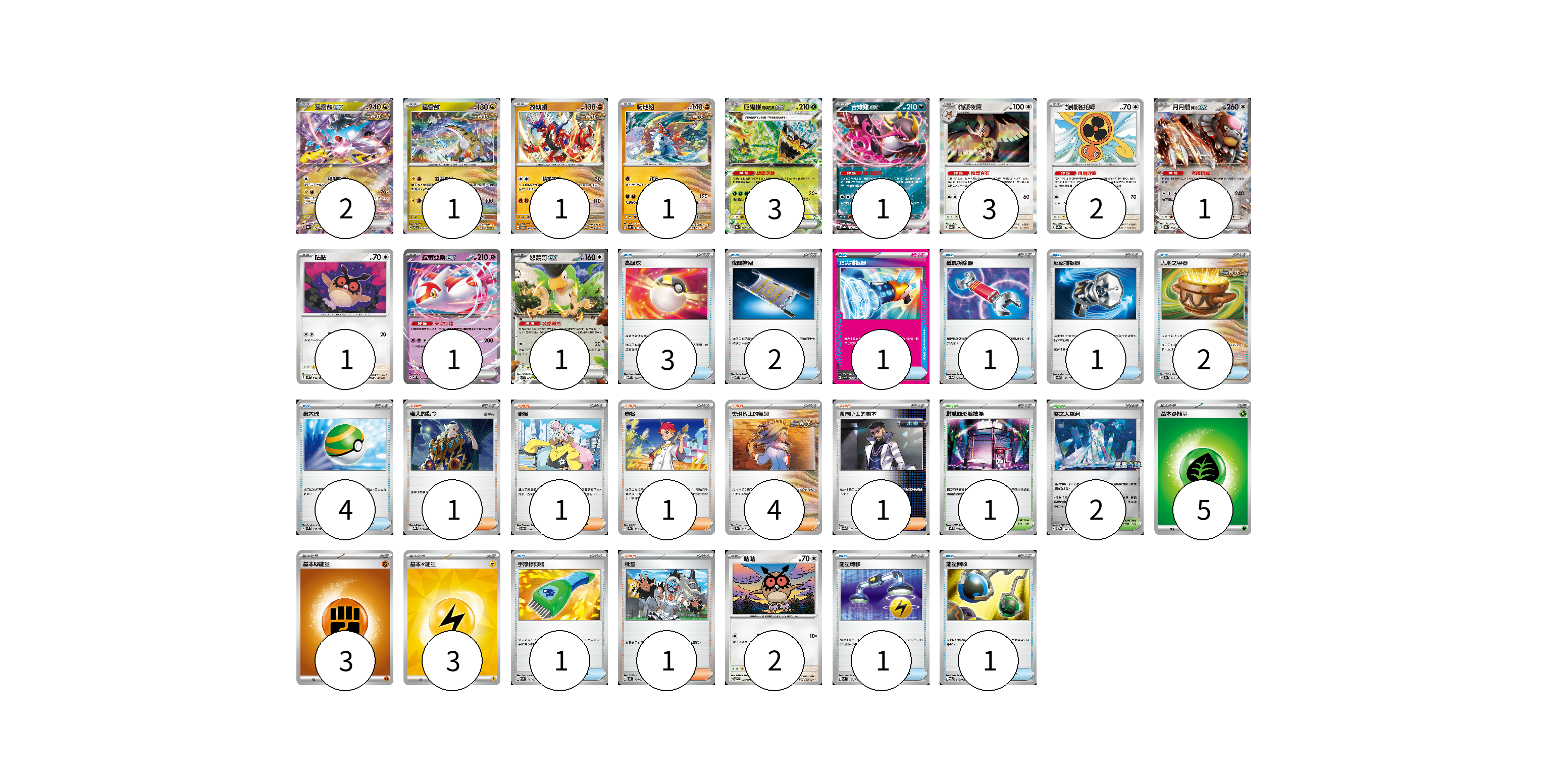 牌組構築方案 以此牌組為基礎新構築牌組 顯示卡面 顯示列表 寶可夢卡(20) 2 1 1 1 3 1 3 2 1 1 1 1 2 物品卡(17) 3 2 1 1 1 2 4 1 1 1 支援者卡(9) 1 1 1 4 1 1 競技場卡(3) 1 2 能量卡(11) 5 3 3 寶可夢卡(20) 卡牌名稱 張數 卡牌名稱 張數 猛雷鼓ex SV8a 124/187 02 猛雷鼓 SV7 075/102 01 故勒頓 SV8 069/106 01 爬地翅 SV4K 041/066 01 厄鬼椪 碧草面具ex SV8a 020/187 03 吉雉雞ex SV8a 104/187 01 貓頭夜鷹 SV8a 128/187 03 旋轉洛托姆 SV8a 131/187 02 月月熊 赫月ex SV8a 134/187 01 咕咕 SV5K 054/071 01 拉帝亞斯ex MBD 003/022 01 怒鸚哥ex SVK 006/042 01 咕咕 SV7 076/102 02 物品卡(17) 卡牌名稱 張數 卡牌名稱 張數 高級球 MBD 014/022 03 夜間擔架 MBD 016/022 02 頂尖捕捉器 MBG 014/022 01 道具拆除器 SV11W 080/086 01 反擊捕捉器 SV8a 139/187 01 大地之容器 SV8a 143/187 02 巢穴球 SVM 133/175 04 手部修剪器 SV5M 061/071 01 能量轉移 SVM 127/175 01 能量回收 SVQL 012/022 01 支援者卡(9) 卡牌名稱 張數 卡牌名稱 張數 老大的指令 MBG 021/022 01 奇樹 SVOD 016/020 01 赤松 SV8a 163/187 01 奧琳博士的氣魄 SV8a 167/187 04 弗圖博士的劇本 SV8a 175/187 01 枇琶 SV5K 068/071 01 競技場卡(3) 卡牌名稱 張數 卡牌名稱 張數 對戰圓形競技場 M2 079/080 01 零之大空洞 SV-P 151/SV-P 02 能量卡(11) 卡牌名稱 張數 卡牌名稱 張數 基本【草】能量 M-P GRA 05 基本【鬥】能量 M-P FIG 03 基本【雷】能量 SVQP LIG 03 以此牌組為基礎新構築牌組 牌組編碼 GWYCEM-Wqzuxz-qXGyjZ copy 列印牌組單 牌組編碼已複製 分享至SNS