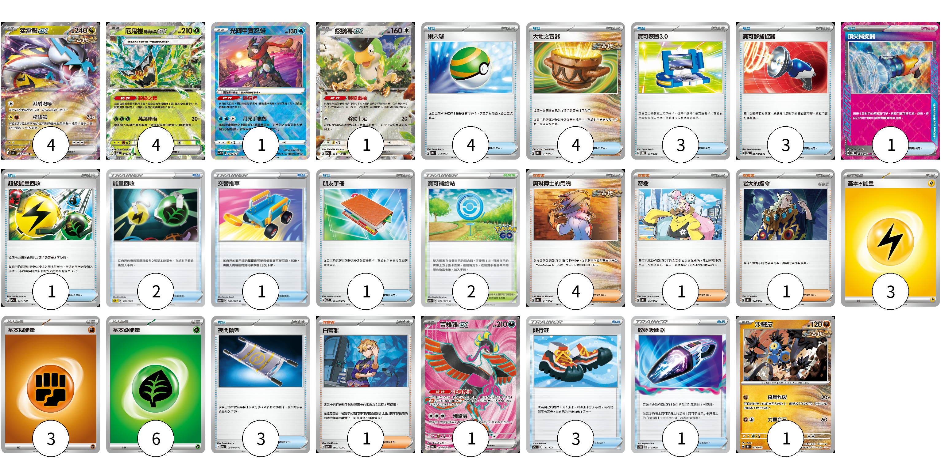 牌組構築方案 以此牌組為基礎新構築牌組 顯示卡面 顯示列表 寶可夢卡(12) 4 4 1 1 1 1 物品卡(27) 4 4 3 3 1 1 2 1 1 3 3 1 支援者卡(7) 4 1 1 1 競技場卡(2) 2 能量卡(12) 3 3 6 寶可夢卡(12) 卡牌名稱 張數 卡牌名稱 張數 猛雷鼓ex SV5K 053/071 04 厄鬼椪 碧草面具ex SV6 016/101 04 光輝甲賀忍蛙 SVF 004/038 01 怒鸚哥ex SV4a 154/190 01 吉雉雞ex SV6a 081/064 01 沙鐵皮 SVHK 009/022 01 物品卡(27) 卡牌名稱 張數 卡牌名稱 張數 巢穴球 SVHK 012/022 04 大地之容器 SVHK 011/022 04 寶可裝置3.0 SVEL 014/020 03 寶可夢捕捉器 SV5a 057/066 03 頂尖捕捉器 SV5M 062/071 01 超級能量回收 SV4a 157/190 01 能量回收 SDP 013/022 02 交替推車 S10D 060/067 01 朋友手冊 SV1S 069/078 01 夜間擔架 SV6a 056/064 03 健行鞋 S12a 137/172 03 放逐吸塵器 SVB 016/028 01 支援者卡(7) 卡牌名稱 張數 卡牌名稱 張數 奧琳博士的氣魄 SVHK 017/022 04 奇樹 SVHK 019/022 01 老大的指令 SVHK 022/022 01 白蕾雅 SV7 100/102 01 競技場卡(2) 卡牌名稱 張數 卡牌名稱 張數 寶可補給站 S10b 071/071 02 能量卡(12) 卡牌名稱 張數 卡牌名稱 張數 基本【雷】能量 SVHM LIG 03 基本【鬥】能量 SVF FIG 03 基本【草】能量 SVF GRA 06 以此牌組為基礎新構築牌組 牌組編碼 GZOjDf-gNWLdS-gUliDn copy 列印牌組單 牌組編碼已複製 分享至SNS