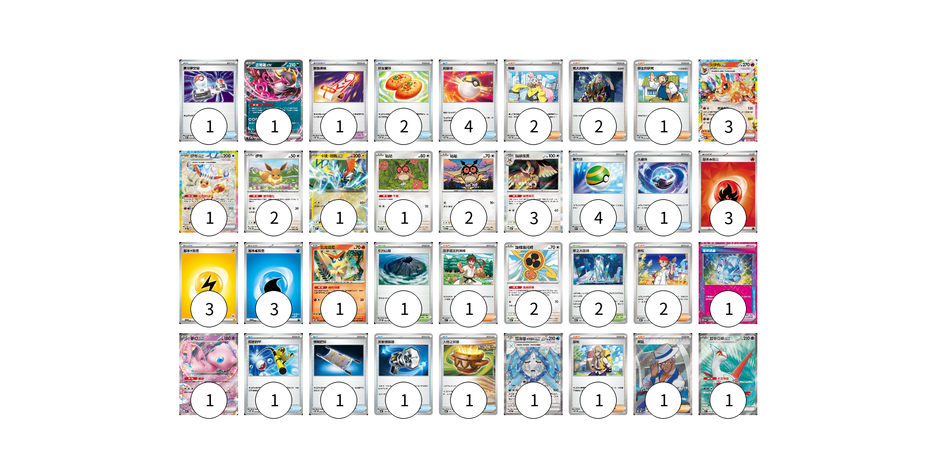 牌組構築方案 以此牌組為基礎新構築牌組 顯示卡面 顯示列表 寶可夢卡(20) 1 3 1 2 1 1 2 3 1 2 1 1 1 寶可夢道具(2) 1 1 物品卡(16) 1 2 4 4 1 1 1 1 1 支援者卡(10) 2 2 1 1 2 1 1 競技場卡(3) 1 2 能量卡(9) 3 3 3 寶可夢卡(20) 卡牌名稱 張數 卡牌名稱 張數 吉雉雞ex SVOD 004/020 01 火伊布ex SV8a 022/187 03 伊布ex SV8a 223/187 01 伊布 SVPN 008/008 02 卡璞・鳴鳴ex SVM 046/175 01 咕咕 SV8a 127/187 01 咕咕 SV7 076/102 02 貓頭夜鷹 SV8a 128/187 03 比克提尼 SV8 012/106 01 旋轉洛托姆 SV8a 131/187 02 夢幻ex SV4a 076/190 01 厄鬼椪 水井面具ex SV6 117/101 01 拉帝亞斯ex SV7a 078/064 01 寶可夢道具(2) 卡牌名稱 張數 卡牌名稱 張數 緊急滑板 SVOD 015/020 01 璀璨結晶 SV8a 152/187 01 物品卡(16) 卡牌名稱 張數 卡牌名稱 張數 寶可夢交替 SV9a 058/063 01 好友寶芬 SVOD 011/020 02 高級球 SVOD 012/020 04 巢穴球 SVK 016/042 04 太晶珠 SV8a 145/187 01 厲害釣竿 SVOD 010/020 01 夜間擔架 SVOM 016/021 01 反擊捕捉器 SV8a 139/187 01 大地之容器 SV8a 143/187 01 支援者卡(10) 卡牌名稱 張數 卡牌名稱 張數 奇樹 SVOD 016/020 02 老大的指令 SVOD 019/020 02 博士的研究 SVOD 017/020 01 空手道王的演練 SVM 147/175 01 赤松 SV8a 163/187 02 派帕 SVOD 018/020 01 席藍 SV8 127/106 01 競技場卡(3) 卡牌名稱 張數 卡牌名稱 張數 引力山岳 SV8 106/106 01 零之大空洞 SV8a 182/187 02 能量卡(9) 卡牌名稱 張數 卡牌名稱 張數 基本【火】能量 SVK FIR 03 基本【雷】能量 SVI LIG 03 基本【水】能量 SVI WAT 03 以此牌組為基礎新構築牌組 牌組編碼 GdrbCI-zfEbFP-oGjUuw copy 列印牌組單 牌組編碼已複製 分享至SNS