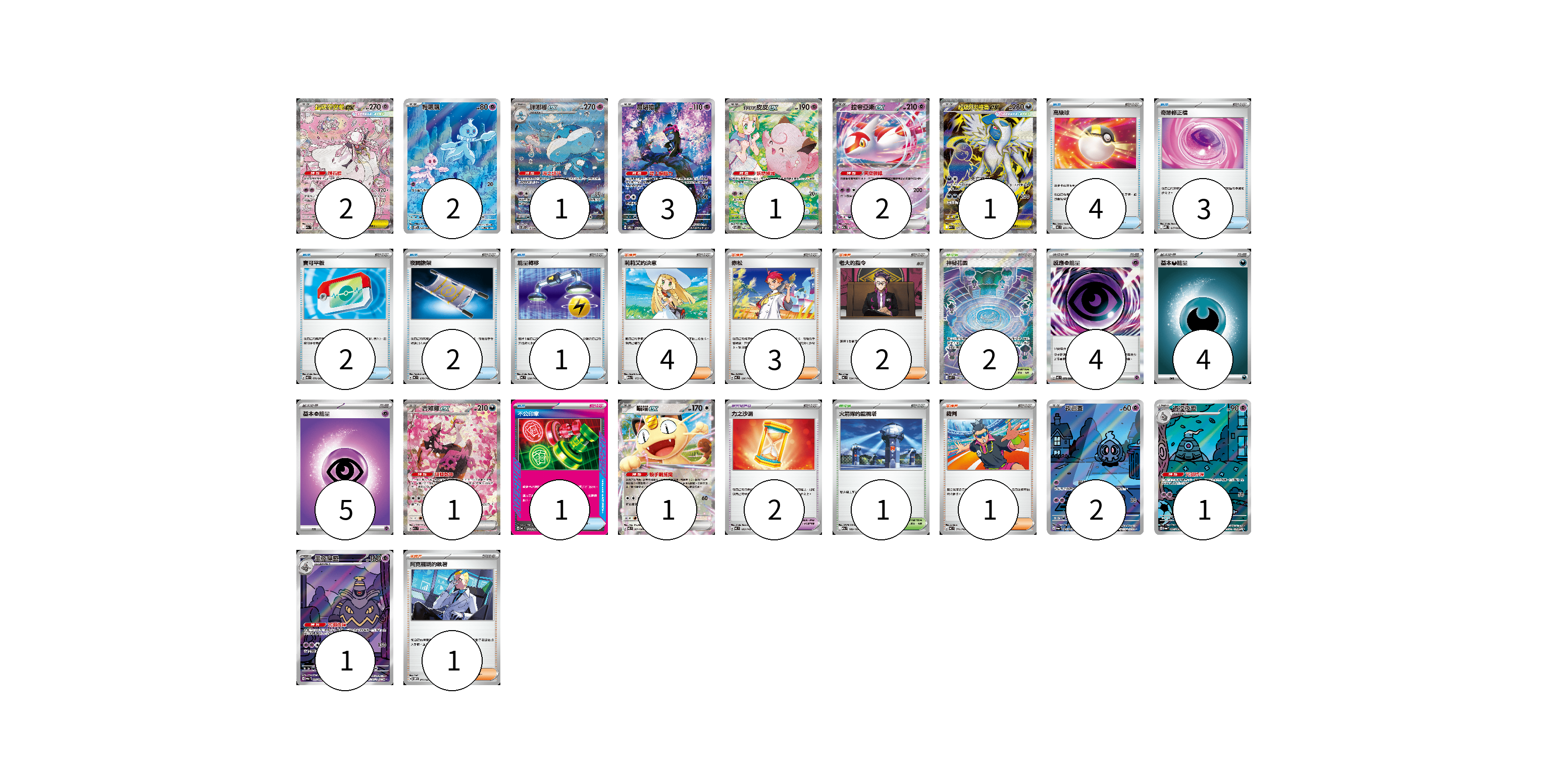 牌組構築方案 以此牌組為基礎新構築牌組 顯示卡面 顯示列表 寶可夢卡(18) 2 2 1 3 1 2 1 1 1 2 1 1 寶可夢道具(2) 2 物品卡(13) 4 3 2 2 1 1 支援者卡(11) 4 3 2 1 1 競技場卡(3) 2 1 能量卡(13) 4 4 5 寶可夢卡(18) 卡牌名稱 張數 卡牌名稱 張數 超級蒂安希ex M2a 238/193 02 輕飄飄 SV11W 124/086 02 胖嘟嘟ex SV11W 170/086 01 願增猿 SV6 107/101 03 莉莉艾的皮皮ex SV9 126/100 01 拉帝亞斯ex M2a 075/193 02 超級阿勃梭魯ex M1L 079/063 01 吉雉雞ex M2a 244/193 01 喵喵ex M3 061/080 01 夜巡靈 SV6a 068/064 02 彷徨夜靈 SV6a 069/064 01 黑夜魔靈 SV6a 070/064 01 寶可夢道具(2) 卡牌名稱 張數 卡牌名稱 張數 力之沙漏 MC 683/742 02 物品卡(13) 卡牌名稱 張數 卡牌名稱 張數 高級球 MC 651/742 04 奇跡修正檔 MBD 017/022 03 寶可平板 M3 070/080 02 夜間擔架 MC 670/742 02 能量轉移 MC 638/742 01 不公印章 MC 633/742 01 支援者卡(11) 卡牌名稱 張數 卡牌名稱 張數 莉莉艾的決意 M2a 175/193 04 赤松 MC 696/742 03 老大的指令 MC 724/742 02 裁判 MC 711/742 01 阿克羅瑪的執著 SVOM 017/021 01 競技場卡(3) 卡牌名稱 張數 卡牌名稱 張數 神秘花園 M1S 086/063 02 火箭隊的監視塔 M2a 189/193 01 能量卡(13) 卡牌名稱 張數 卡牌名稱 張數 感應【超】能量 M3 079/080 04 基本【惡】能量 MC DAR 04 基本【超】能量 MC PSY 05 以此牌組為基礎新構築牌組 牌組編碼 GfuRNU-HjwyHa-PyGYNv copy 列印牌組單 牌組編碼已複製 分享至SNS