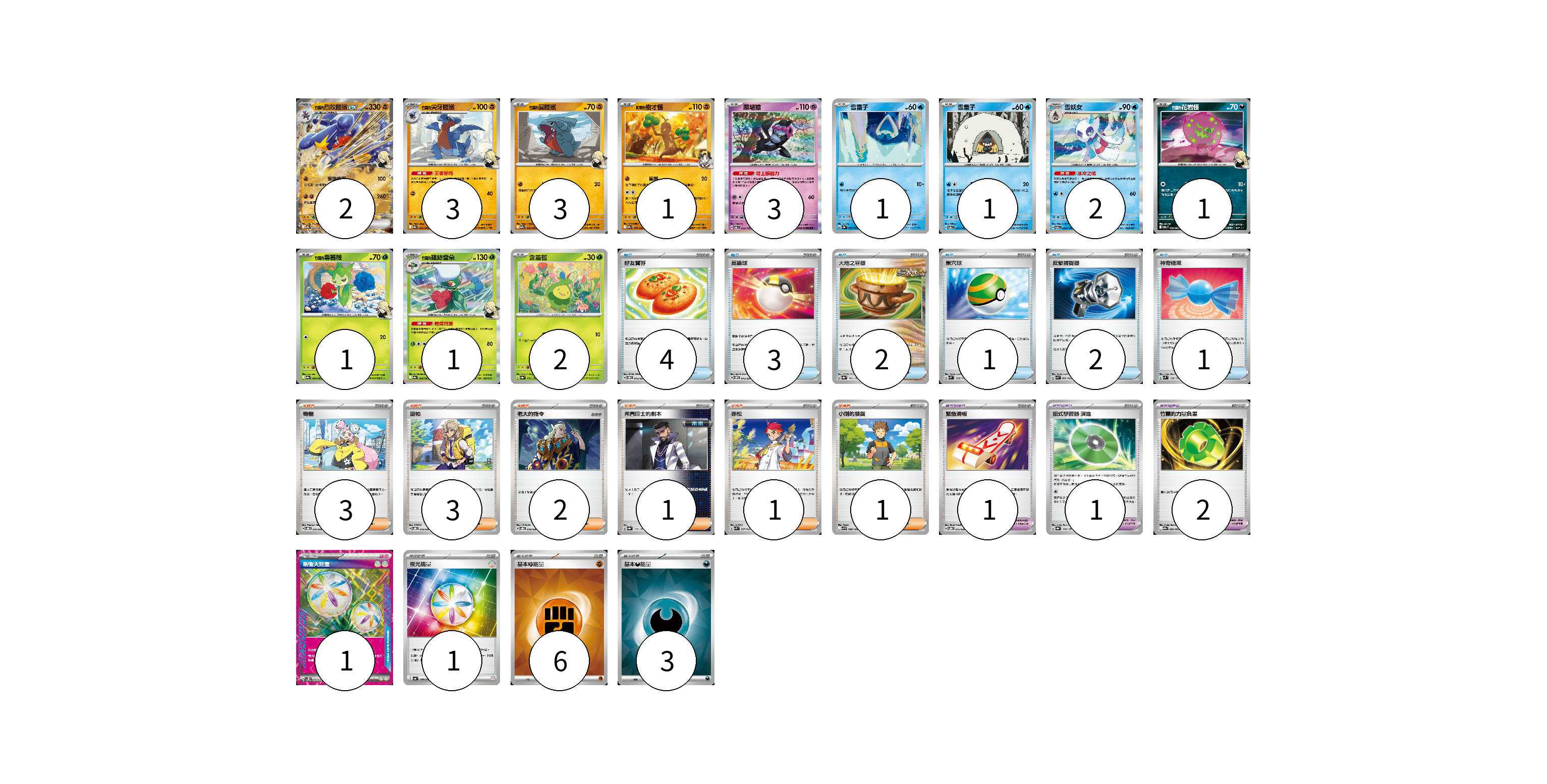 牌組構築方案 以此牌組為基礎新構築牌組 顯示卡面 顯示列表 寶可夢卡(21) 2 3 3 1 3 1 1 2 1 1 1 2 寶可夢道具(4) 1 1 2 物品卡(13) 4 3 2 1 2 1 支援者卡(11) 3 3 2 1 1 1 能量卡(11) 1 1 6 3 寶可夢卡(21) 卡牌名稱 張數 卡牌名稱 張數 <竹蘭的>烈咬陸鯊ex SV9a 044/063 02 <竹蘭的>尖牙陸鯊 SV9a 043/063 03 <竹蘭的>圓陸鯊 SV9a 042/063 03 <阿響的>樹才怪 SV9a 041/063 01 願增猿 SV6 055/101 03 雪童子 SV3a 005/062 01 雪童子 SV6 031/101 01 雪妖女 SV6 033/101 02 <竹蘭的>花岩怪 SV9a 050/063 01 <竹蘭的>毒薔薇 SV9a 004/063 01 <竹蘭的>羅絲雷朵 SV9a 005/063 01 含羞苞 SV8a 001/187 02 寶可夢道具(4) 卡牌名稱 張數 卡牌名稱 張數 緊急滑板 SVOD 015/020 01 招式學習器 演進 SV8a 160/187 01 竹蘭的力量負重 SV9a 060/063 02 物品卡(13) 卡牌名稱 張數 卡牌名稱 張數 好友寶芬 SVOM 012/021 04 高級球 SVOM 013/021 03 大地之容器 SV8a 143/187 02 巢穴球 SVM 133/175 01 反擊捕捉器 SVK 009/042 02 神奇糖果 SVM 135/175 01 支援者卡(11) 卡牌名稱 張數 卡牌名稱 張數 奇樹 SVOD 016/020 03 派帕 SVOD 018/020 03 老大的指令 SVOD 019/020 02 弗圖博士的劇本 SV8a 175/187 01 赤松 SVK 027/042 01 小剛的發掘 SV9 096/100 01 能量卡(11) 卡牌名稱 張數 卡牌名稱 張數 新衝天能量 SV5K 071/071 01 夜光能量 SV4a 190/190 01 基本【鬥】能量 SVK FIG 06 基本【惡】能量 SVK DAR 03 以此牌組為基礎新構築牌組 牌組編碼 GlobdR-PgklSs-ChscFx copy 列印牌組單 牌組編碼已複製 分享至SNS