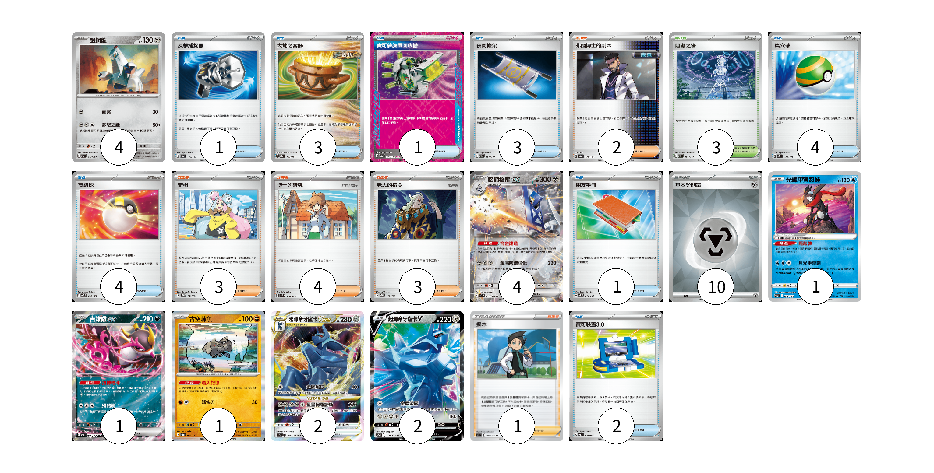 牌組構築方案 以此牌組為基礎新構築牌組 顯示卡面 顯示列表 寶可夢卡(15) 4 4 1 1 1 2 2 物品卡(19) 1 3 1 3 4 4 1 2 支援者卡(13) 2 3 4 3 1 競技場卡(3) 3 能量卡(10) 10 寶可夢卡(15) 卡牌名稱 張數 卡牌名稱 張數 鋁鋼龍 SV8a 112/187 04 鋁鋼橋龍ex SV7a 037/064 04 光輝甲賀忍蛙 SVTG 002/019 01 吉雉雞ex SV6a 038/064 01 古空棘魚 SV8a 079/187 01 起源帝牙盧卡VSTAR S12a 101/172 02 起源帝牙盧卡V S12a 100/172 02 物品卡(19) 卡牌名稱 張數 卡牌名稱 張數 反擊捕捉器 SV8a 139/187 01 大地之容器 SV8a 143/187 03 寶可夢旋風回收機 SV8a 149/187 01 夜間擔架 SV8a 151/187 03 巢穴球 SVM 133/175 04 高級球 SVM 134/175 04 朋友手冊 SVK 014/042 01 寶可裝置3.0 SVK 021/042 02 支援者卡(13) 卡牌名稱 張數 卡牌名稱 張數 弗圖博士的劇本 SV8a 175/187 02 奇樹 SVM 160/175 03 博士的研究 SVM 166/175 04 老大的指令 SVM 172/175 03 捩木 S11 097/100 01 競技場卡(3) 卡牌名稱 張數 卡牌名稱 張數 阻礙之塔 SV8a 181/187 03 能量卡(10) 卡牌名稱 張數 卡牌名稱 張數 基本【鋼】能量 SVK MET 10 以此牌組為基礎新構築牌組 牌組編碼 GtGWVu-DfBGtb-IVnejz copy 列印牌組單 牌組編碼已複製 分享至SNS