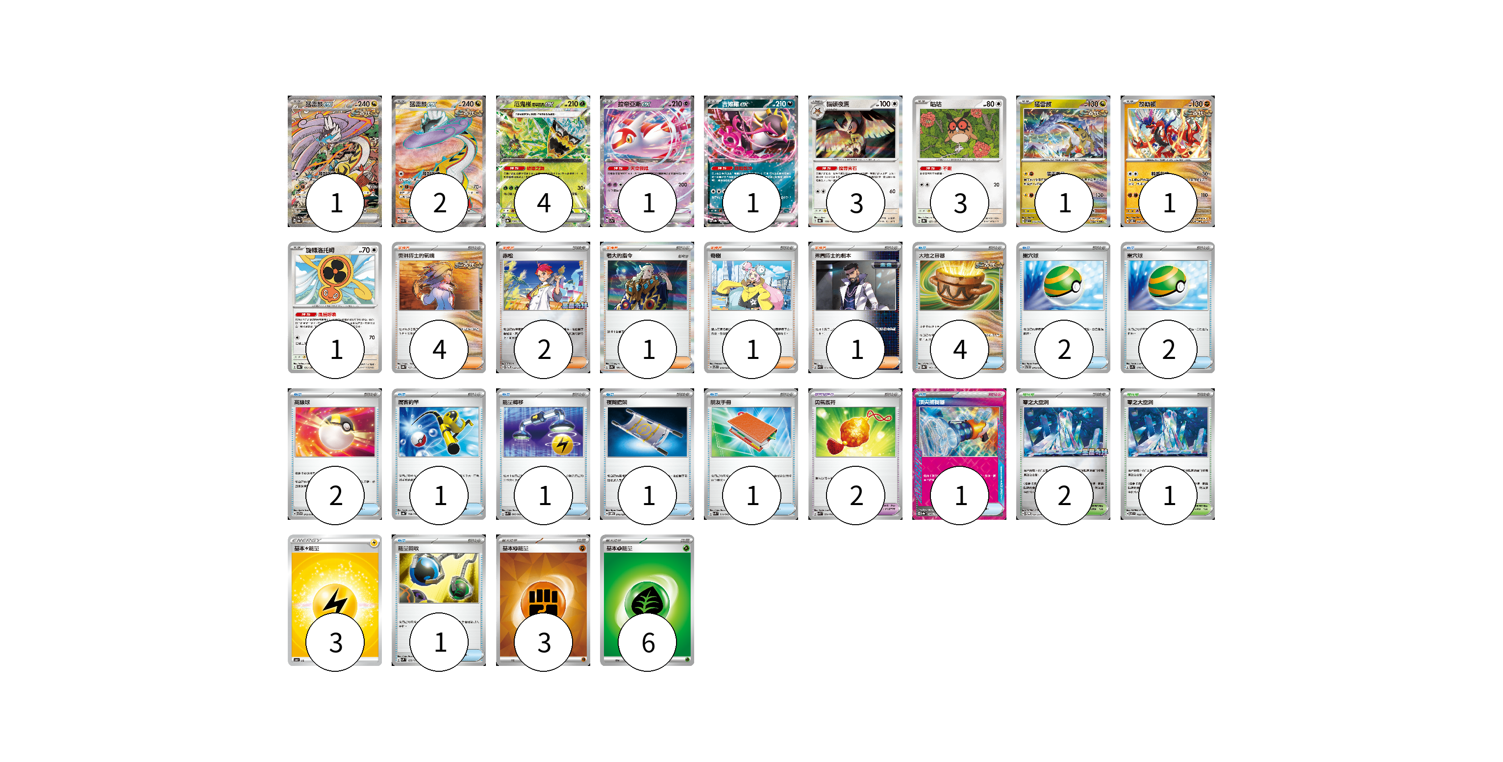 牌組構築方案 以此牌組為基礎新構築牌組 顯示卡面 顯示列表 寶可夢卡(18) 1 2 4 1 1 3 3 1 1 1 寶可夢道具(2) 2 物品卡(16) 4 2 2 2 1 1 1 1 1 1 支援者卡(9) 4 2 1 1 1 競技場卡(3) 2 1 能量卡(12) 3 3 6 寶可夢卡(18) 卡牌名稱 張數 卡牌名稱 張數 猛雷鼓ex SV8a 222/187 01 猛雷鼓ex SV5K 089/071 02 厄鬼椪 碧草面具ex SV8a 020/187 04 拉帝亞斯ex SV7a 019/064 01 吉雉雞ex SV8a 104/187 01 貓頭夜鷹 SV8a 128/187 03 咕咕 SV8a 127/187 03 猛雷鼓 SV7 075/102 01 故勒頓 SV8 069/106 01 旋轉洛托姆 SV8a 131/187 01 寶可夢道具(2) 卡牌名稱 張數 卡牌名稱 張數 勇氣護符 SVK 024/042 02 物品卡(16) 卡牌名稱 張數 卡牌名稱 張數 大地之容器 SV8a 143/187 04 巢穴球 SVTH 010/018 02 巢穴球 SV1S 070/078 02 高級球 SVTG 013/019 02 厲害釣竿 SV4a 158/190 01 能量轉移 SVK 008/042 01 夜間擔架 SVOM 016/021 01 朋友手冊 SVK 014/042 01 頂尖捕捉器 SV8a 148/187 01 能量回收 SVM 125/175 01 支援者卡(9) 卡牌名稱 張數 卡牌名稱 張數 奧琳博士的氣魄 SV8a 167/187 04 赤松 SV-P 150/SV-P 02 老大的指令 SV4a 181/190 01 奇樹 SVTS 018/022 01 弗圖博士的劇本 SVK 034/042 01 競技場卡(3) 卡牌名稱 張數 卡牌名稱 張數 零之大空洞 SV-P 151/SV-P 02 零之大空洞 SV7 102/102 01 能量卡(12) 卡牌名稱 張數 卡牌名稱 張數 基本雷能量 SN LIG 03 基本【鬥】能量 SVK FIG 03 基本【草】能量 SVTM GRA 06 以此牌組為基礎新構築牌組 牌組編碼 GuEPEf-eQpnRX-QtZRxd copy 列印牌組單 牌組編碼已複製 分享至SNS