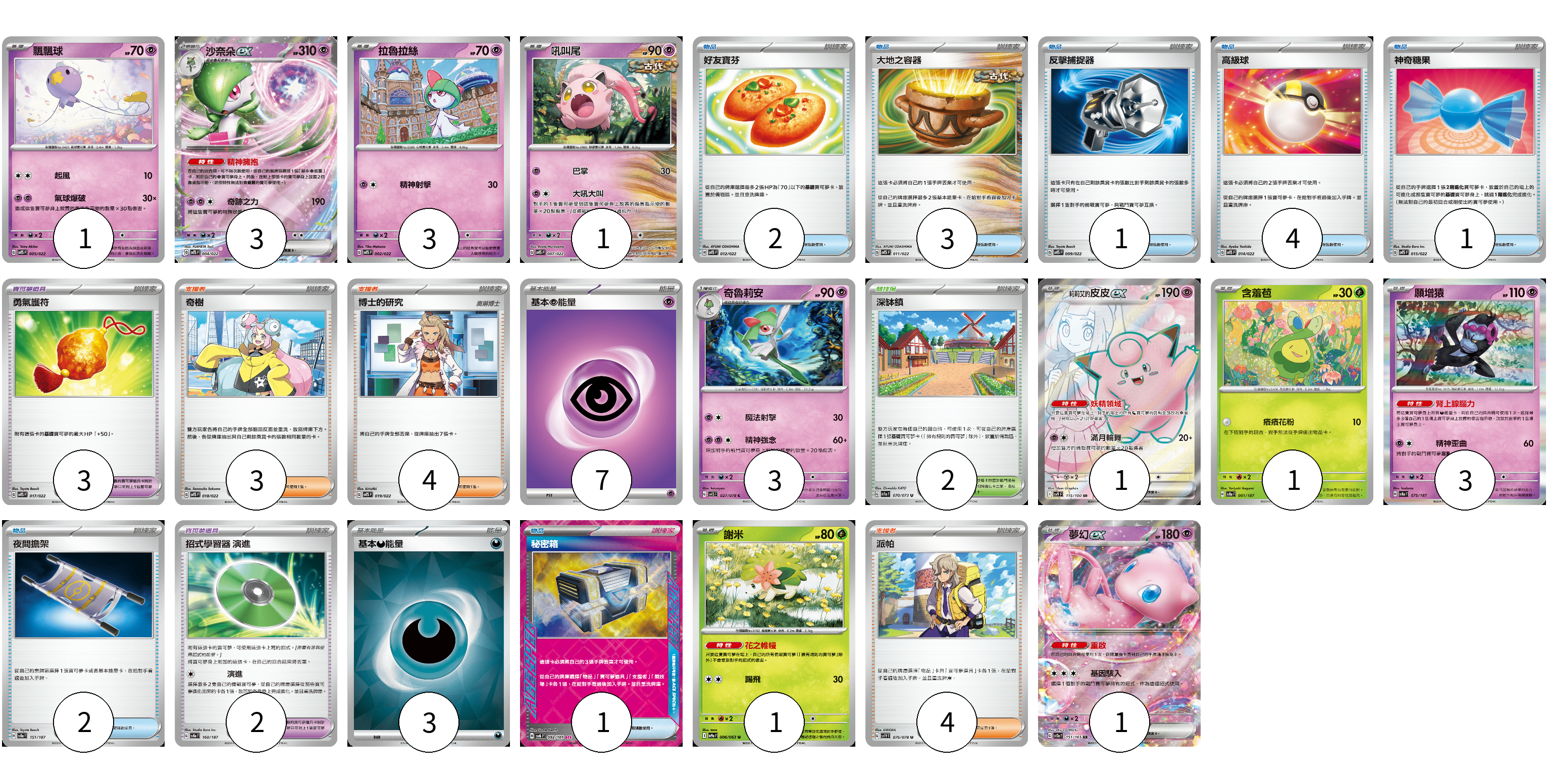牌組構築方案 以此牌組為基礎新構築牌組 顯示卡面 顯示列表 寶可夢卡(18) 1 3 3 1 3 1 1 3 1 1 寶可夢道具(5) 3 2 物品卡(14) 2 3 1 4 1 2 1 支援者卡(11) 3 4 4 競技場卡(2) 2 能量卡(10) 7 3 寶可夢卡(18) 卡牌名稱 張數 卡牌名稱 張數 飄飄球 SVTS 005/022 01 沙奈朵ex SVTS 004/022 03 拉魯拉絲 SVTS 002/022 03 吼叫尾 SVTS 007/022 01 奇魯莉安 SV1S 027/078 03 莉莉艾的皮皮ex SV9 115/100 01 含羞苞 SV8a 001/187 01 願增猿 SV8a 075/187 03 謝米 SV9a 006/063 01 夢幻ex SV2a 151/165 01 寶可夢道具(5) 卡牌名稱 張數 卡牌名稱 張數 勇氣護符 SVTS 017/022 03 招式學習器 演進 SV8a 160/187 02 物品卡(14) 卡牌名稱 張數 卡牌名稱 張數 好友寶芬 SVTS 012/022 02 大地之容器 SVTS 011/022 03 反擊捕捉器 SVTS 009/022 01 高級球 SVTS 014/022 04 神奇糖果 SVTS 015/022 01 夜間擔架 SV8a 151/187 02 秘密箱 SV6 092/101 01 支援者卡(11) 卡牌名稱 張數 卡牌名稱 張數 奇樹 SVTS 018/022 03 博士的研究 SVTS 019/022 04 派帕 SV1V 076/078 04 競技場卡(2) 卡牌名稱 張數 卡牌名稱 張數 深缽鎮 SV1a 070/073 02 能量卡(10) 卡牌名稱 張數 卡牌名稱 張數 基本【超】能量 SVTS PSY 07 基本【惡】能量 SVOM DAR 03 以此牌組為基礎新構築牌組 牌組編碼 GurOqs-ailtoO-LPYCac copy 列印牌組單 牌組編碼已複製 分享至SNS