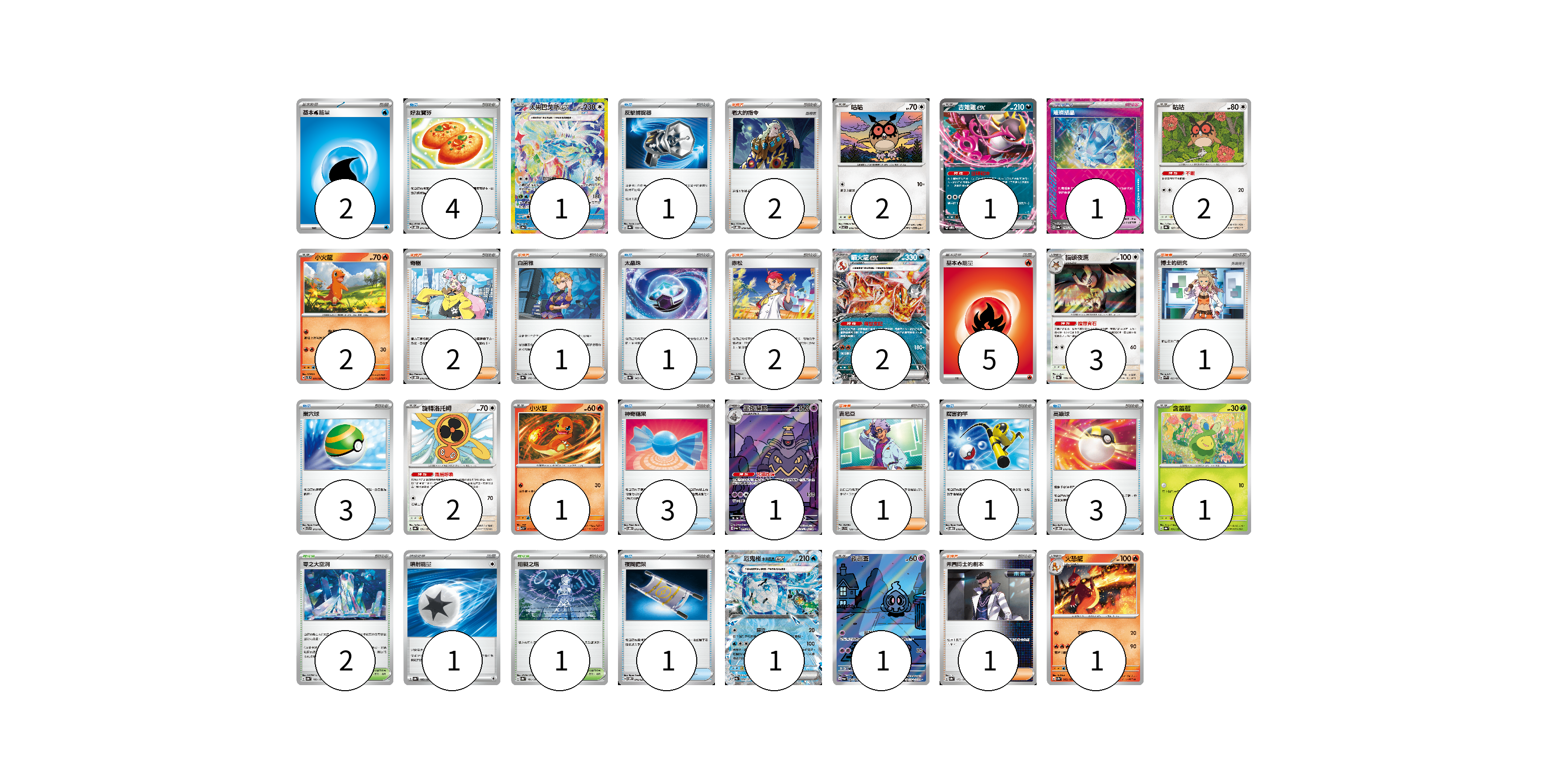牌組構築方案 以此牌組為基礎新構築牌組 顯示卡面 顯示列表 寶可夢卡(21) 1 2 1 2 2 2 3 2 1 1 1 1 1 1 寶可夢道具(1) 1 物品卡(17) 4 1 1 3 3 1 3 1 支援者卡(10) 2 2 1 2 1 1 1 競技場卡(3) 2 1 能量卡(8) 2 5 1 寶可夢卡(21) 卡牌名稱 張數 卡牌名稱 張數 太樂巴戈斯ex SV8a 226/187 01 咕咕 SV7 076/102 02 吉雉雞ex SVOD 004/020 01 咕咕 SV8a 127/187 02 小火龍 SVTL 001/021 02 噴火龍ex SVTL 006/021 02 貓頭夜鷹 SV8a 128/187 03 旋轉洛托姆 SV8a 131/187 02 小火龍 SV3 012/108 01 黑夜魔靈 SV6a 070/064 01 含羞苞 SV8a 001/187 01 厄鬼椪 水井面具ex SV8a 050/187 01 夜巡靈 SV6a 068/064 01 火恐龍 SV2a 005/165 01 寶可夢道具(1) 卡牌名稱 張數 卡牌名稱 張數 璀璨結晶 SV8a 152/187 01 物品卡(17) 卡牌名稱 張數 卡牌名稱 張數 好友寶芬 SVOD 011/020 04 反擊捕捉器 SV8a 139/187 01 太晶珠 SV8a 145/187 01 巢穴球 SVTR 013/021 03 神奇糖果 SVOD 013/020 03 厲害釣竿 SVOD 010/020 01 高級球 SVOD 012/020 03 夜間擔架 SVOM 016/021 01 支援者卡(10) 卡牌名稱 張數 卡牌名稱 張數 老大的指令 SVOD 019/020 02 奇樹 SVOD 016/020 02 白蕾雅 SV8a 176/187 01 赤松 SV8a 163/187 02 博士的研究(奧琳博士) SVAW 023/023 01 吉尼亞 SVD 129/139 01 弗圖博士的劇本 SV8a 175/187 01 競技場卡(3) 卡牌名稱 張數 卡牌名稱 張數 零之大空洞 SV8a 182/187 02 阻礙之塔 SV8a 181/187 01 能量卡(8) 卡牌名稱 張數 卡牌名稱 張數 基本【水】能量 SVF WAT 02 基本火能量 sv-p FIR 05 噴射能量 SV8a 185/187 01 以此牌組為基礎新構築牌組 牌組編碼 GvIsfj-hAsGEy-yRCTQf copy 列印牌組單 牌組編碼已複製 分享至SNS
