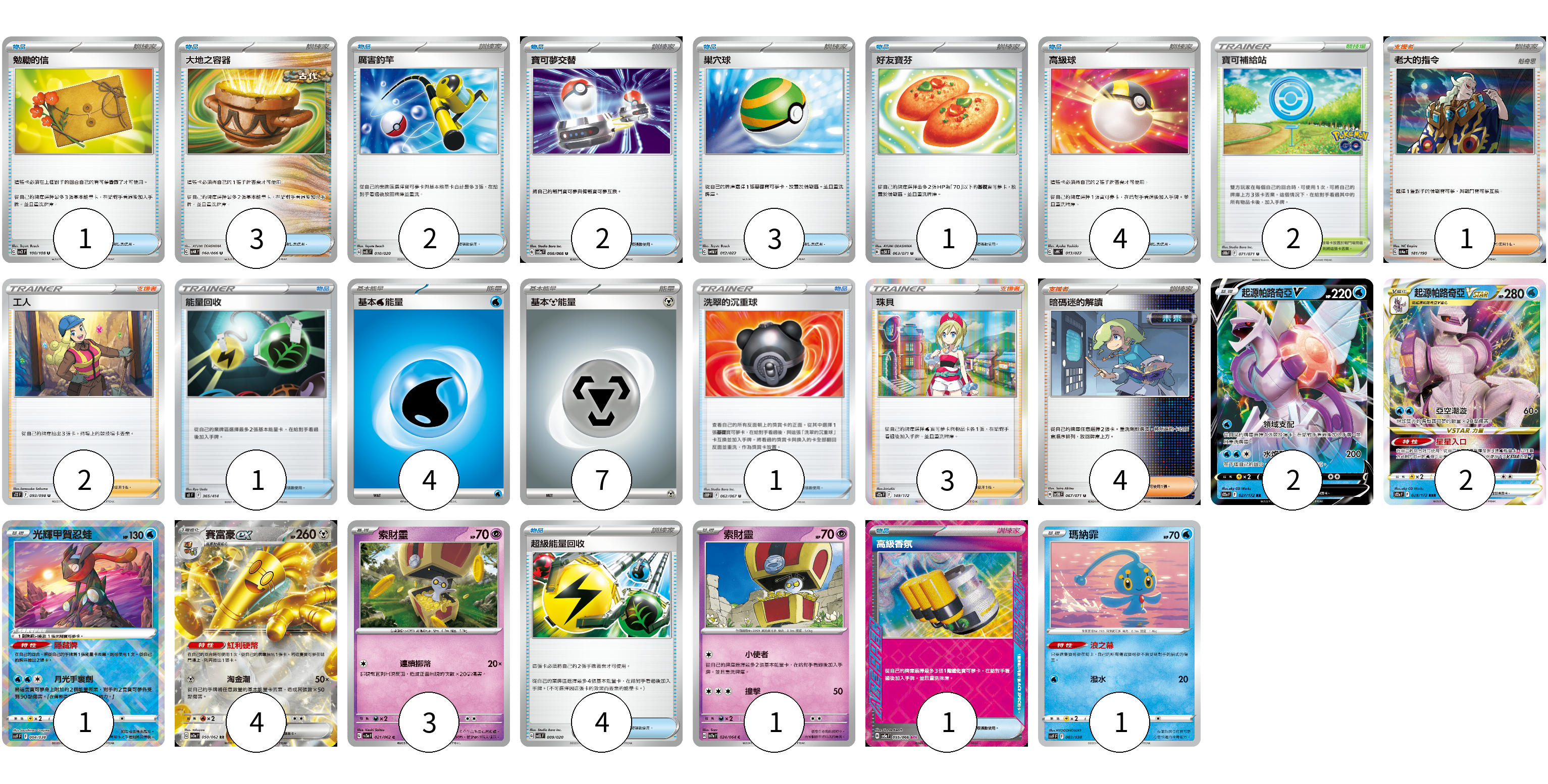 牌組構築方案 以此牌組為基礎新構築牌組 顯示卡面 顯示列表 寶可夢卡(16) 2 2 2 1 4 3 1 1 物品卡(21) 1 3 2 3 1 4 1 1 4 1 支援者卡(10) 1 2 3 4 競技場卡(2) 2 能量卡(11) 4 7 寶可夢卡(16) 卡牌名稱 張數 卡牌名稱 張數 厲害釣竿 SVEL 010/020 02 起源帕路奇亞V S12a 027/172 02 起源帕路奇亞VSTAR S12a 028/172 02 光輝甲賀忍蛙 SVF 004/038 01 賽富豪ex SV3a 050/062 04 索財靈 SV3a 021/062 03 索財靈 SV7a 024/064 01 瑪納霏 SVF 003/038 01 物品卡(21) 卡牌名稱 張數 卡牌名稱 張數 勉勵的信 SV3 100/108 01 大地之容器 SV4K 060/066 03 寶可夢交替 SV5a 056/066 02 巢穴球 SVHM 012/022 03 好友寶芬 SV5K 063/071 01 高級球 SVHK 013/022 04 能量回收 SI 365/414 01 洗翠的沉重球 S10P 062/067 01 超級能量回收 SVEL 009/020 04 高級香氛 SV5a 055/066 01 支援者卡(10) 卡牌名稱 張數 卡牌名稱 張數 老大的指令 SV4a 181/190 01 工人 S12 093/098 02 珠貝 S12a 149/172 03 暗碼迷的解讀 SV5M 067/071 04 競技場卡(2) 卡牌名稱 張數 卡牌名稱 張數 寶可補給站 S10b 071/071 02 能量卡(11) 卡牌名稱 張數 卡牌名稱 張數 基本【水】能量 SVD WAT 04 基本【鋼】能量 SVB MET 07 以此牌組為基礎新構築牌組 牌組編碼 GyVHMj-MvuKTw-WWVRxK copy 列印牌組單 牌組編碼已複製 分享至SNS
