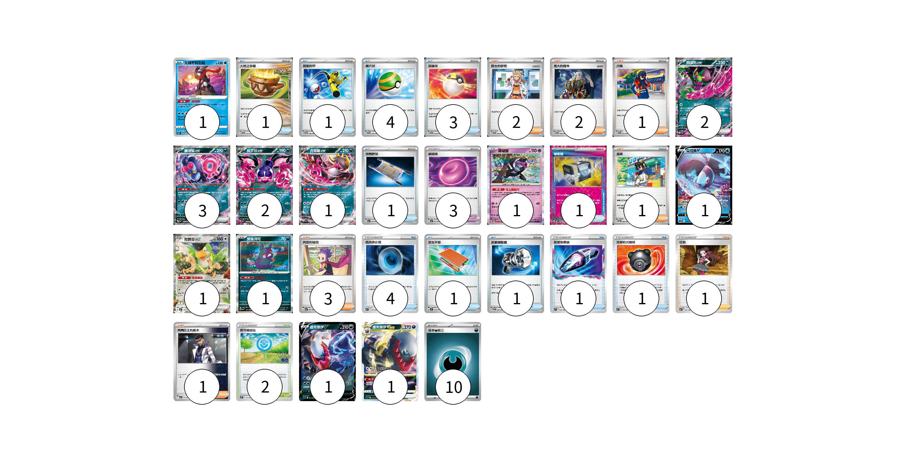 牌組構築方案 以此牌組為基礎新構築牌組 顯示卡面 顯示列表 寶可夢卡(15) 1 2 3 2 1 1 1 1 1 1 1 寶可夢道具(3) 3 物品卡(19) 1 1 4 3 1 1 4 1 1 1 1 支援者卡(11) 2 2 1 1 3 1 1 競技場卡(2) 2 能量卡(10) 10 寶可夢卡(15) 卡牌名稱 張數 卡牌名稱 張數 光輝甲賀忍蛙 SVTG 002/019 01 夠讚狗ex SV6a 036/064 02 願增猿ex SV6a 037/064 03 桃歹郎ex SV6a 039/064 02 吉雉雞ex SV6a 038/064 01 願增猿 SV6 055/101 01 霓虹魚V SVHK 004/022 01 怒鸚哥ex SV4a 154/190 01 莫魯貝可 SV4K 051/066 01 達克萊伊V SLD 007/020 01 達克萊伊VSTAR SLD 008/020 01 寶可夢道具(3) 卡牌名稱 張數 卡牌名稱 張數 鎖鏈糬 SV6a 057/064 03 物品卡(19) 卡牌名稱 張數 卡牌名稱 張數 大地之容器 SVTG 010/019 01 厲害釣竿 SVTG 009/019 01 巢穴球 SVTG 012/019 04 高級球 SVTG 013/019 03 夜間擔架 SV6a 056/064 01 秘密箱 SV6 092/101 01 暗黑修正檔 SVF 014/038 04 朋友手冊 SV1S 069/078 01 反擊捕捉器 SVTS 009/022 01 放逐吸塵器 SVF 023/038 01 洗翠的沉重球 SVF 019/038 01 支援者卡(11) 卡牌名稱 張數 卡牌名稱 張數 博士的研究 SVTG 018/019 02 老大的指令 SVTG 019/019 02 丹瑜 SVTR 016/021 01 烏栗 SV6 096/101 01 阿杏的秘招 SV6a 060/064 03 杜娟 SVB 021/028 01 弗圖博士的劇本 SVHM 021/022 01 競技場卡(2) 卡牌名稱 張數 卡牌名稱 張數 寶可補給站 S10b 071/071 02 能量卡(10) 卡牌名稱 張數 卡牌名稱 張數 基本惡能量 sv-p DAR 10 以此牌組為基礎新構築牌組 牌組編碼 HBXxgP-wHzpyf-siVXmQ copy 列印牌組單 牌組編碼已複製 分享至SNS