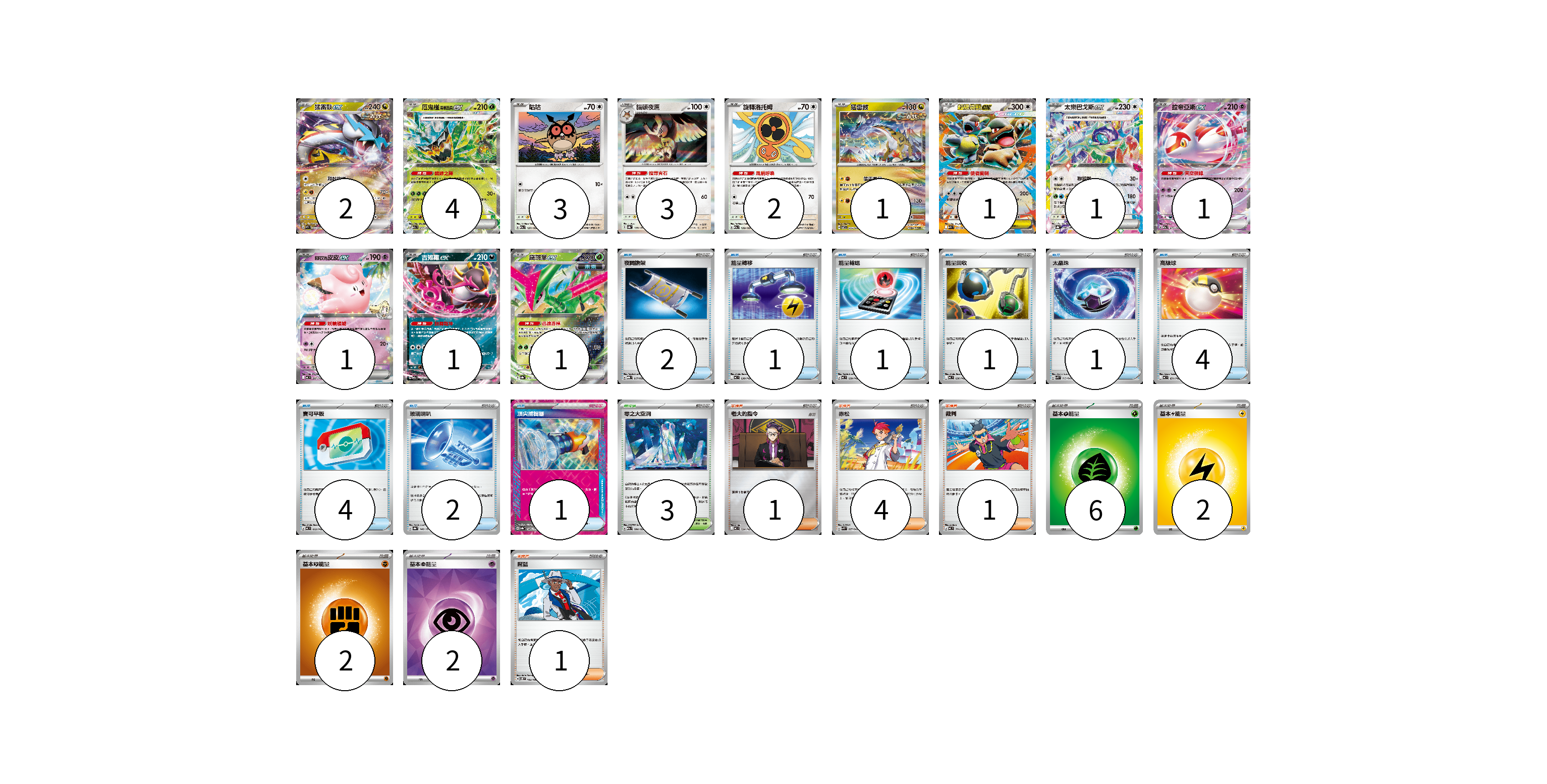 牌組構築方案 以此牌組為基礎新構築牌組 顯示卡面 顯示列表 寶可夢卡(21) 2 4 3 3 2 1 1 1 1 1 1 1 物品卡(17) 2 1 1 1 1 4 4 2 1 支援者卡(7) 1 4 1 1 競技場卡(3) 3 能量卡(12) 6 2 2 2 寶可夢卡(21) 卡牌名稱 張數 卡牌名稱 張數 猛雷鼓ex SV5K 053/071 02 厄鬼椪 碧草面具ex M2a 017/193 04 咕咕 M2a 137/193 03 貓頭夜鷹 SV8a 128/187 03 旋轉洛托姆 M2a 139/193 02 猛雷鼓 SV7 075/102 01 超級袋獸ex M1S 051/063 01 太樂巴戈斯ex SV8a 136/187 01 拉帝亞斯ex M2a 075/193 01 莉莉艾的皮皮ex MC 287/742 01 吉雉雞ex M2a 114/193 01 鐵斑葉ex SV8a 016/187 01 物品卡(17) 卡牌名稱 張數 卡牌名稱 張數 夜間擔架 MBG 017/022 02 能量轉移 MC 638/742 01 能量輸送 MC 639/742 01 能量回收 MC 636/742 01 太晶珠 SVK 013/042 01 高級球 MC 651/742 04 寶可平板 MC 662/742 04 玻璃喇叭 SV8a 140/187 02 頂尖捕捉器 SV8a 148/187 01 支援者卡(7) 卡牌名稱 張數 卡牌名稱 張數 老大的指令 MC 724/742 01 赤松 SVK 027/042 04 裁判 MC 711/742 01 席藍 SV8 102/106 01 競技場卡(3) 卡牌名稱 張數 卡牌名稱 張數 零之大空洞 M2a 184/193 03 能量卡(12) 卡牌名稱 張數 卡牌名稱 張數 基本【草】能量 MJ GRA 06 基本【雷】能量 MJ LIG 02 基本【鬥】能量 MC FIG 02 基本【超】能量 SVOD PSY 02 以此牌組為基礎新構築牌組 牌組編碼 HCgxzI-DuTIKK-bBGqkw copy 列印牌組單 牌組編碼已複製 分享至SNS
