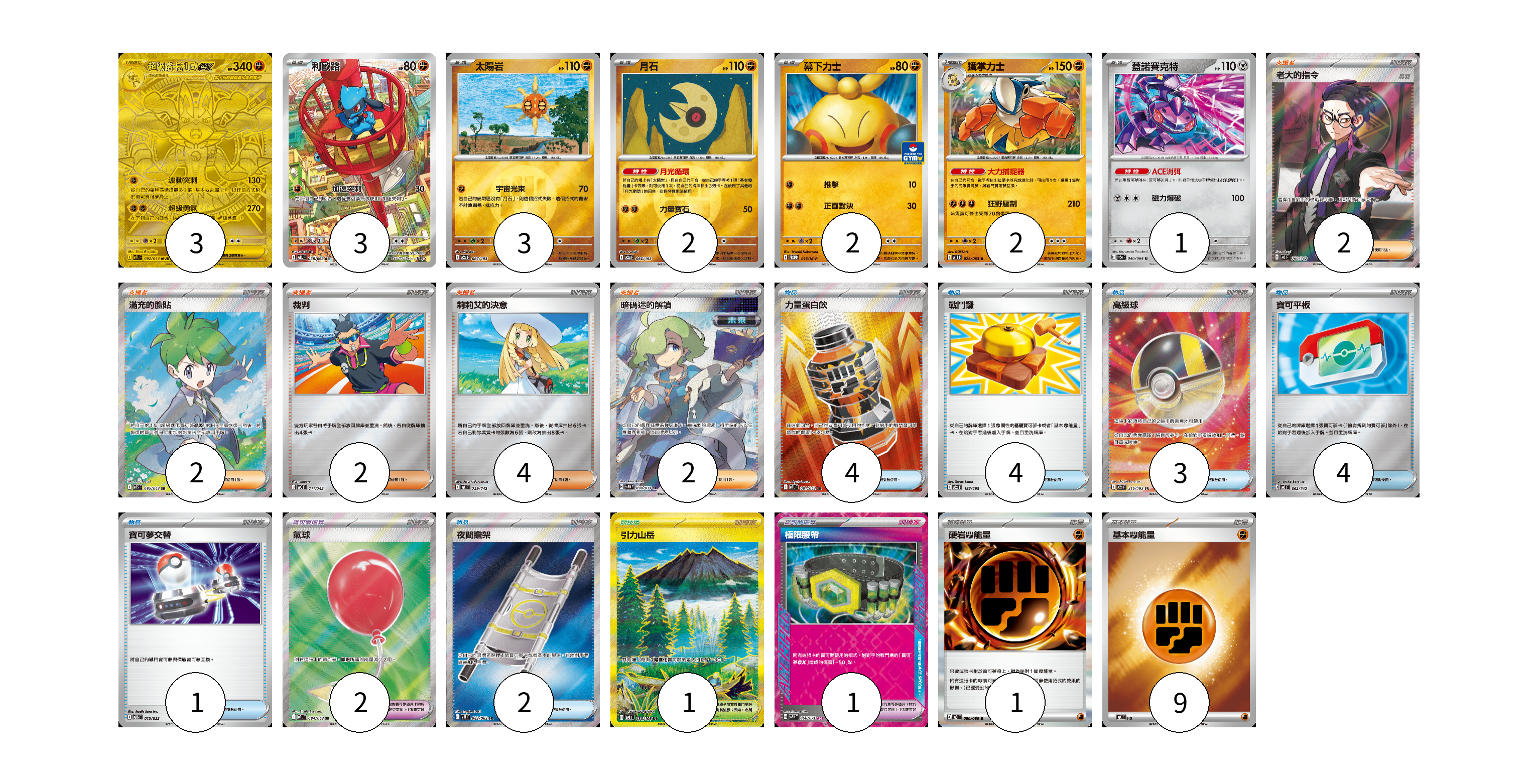 牌組構築方案 以此牌組為基礎新構築牌組 顯示卡面 顯示列表 寶可夢卡(16) 3 3 3 2 2 2 1 寶可夢道具(3) 2 1 物品卡(18) 4 4 3 4 1 2 支援者卡(12) 2 2 2 4 2 競技場卡(1) 1 能量卡(10) 1 9 寶可夢卡(16) 卡牌名稱 張數 卡牌名稱 張數 超級路卡利歐ex M1L 092/063 03 利歐路 M1L 068/063 03 太陽岩 M2a 087/193 03 月石 M2a 086/193 02 幕下力士 M-P 015/M-P 02 鐵掌力士 M1L 025/063 02 蓋諾賽克特 SV6a 040/064 01 寶可夢道具(3) 卡牌名稱 張數 卡牌名稱 張數 氣球 M1L 084/063 02 極限腰帶 SV5K 066/071 01 物品卡(18) 卡牌名稱 張數 卡牌名稱 張數 力量蛋白飲 M1L 081/063 04 戰鬥鑼 M2a 155/193 04 高級球 M2a 216/193 03 寶可平板 MC 662/742 04 寶可夢交替 MBG 015/022 01 夜間擔架 M1L 083/063 02 支援者卡(12) 卡牌名稱 張數 卡牌名稱 張數 老大的指令(烏羽) MC 760/742 02 滿充的體貼 M1S 085/063 02 裁判 MC 711/742 02 莉莉艾的決意 MC 729/742 04 暗碼迷的解讀 SV5M 090/071 02 競技場卡(1) 卡牌名稱 張數 卡牌名稱 張數 引力山岳 SV8 138/106 01 能量卡(10) 卡牌名稱 張數 卡牌名稱 張數 硬岩【鬥】能量 M3 080/080 01 基本【鬥】能量 MC FIG 09 以此牌組為基礎新構築牌組 牌組編碼 HDUfxW-UJbWAn-jsCKLl copy 列印牌組單 牌組編碼已複製 分享至SNS