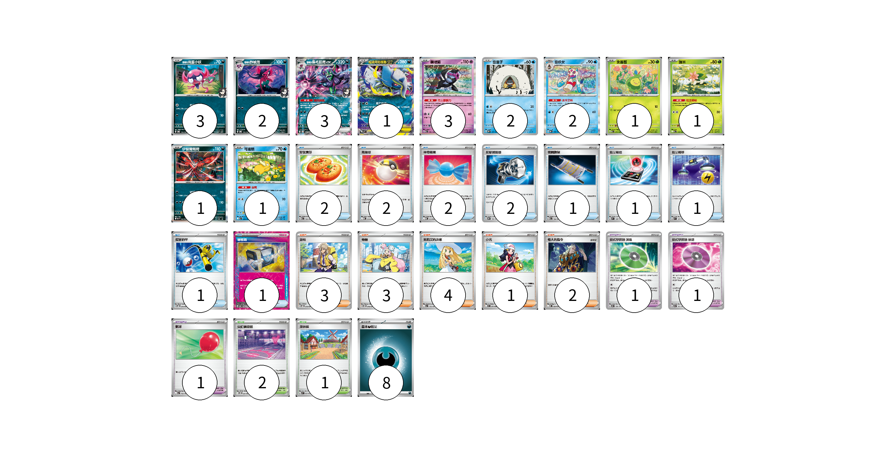 牌組構築方案 以此牌組為基礎新構築牌組 顯示卡面 顯示列表 寶可夢卡(20) 3 2 3 1 3 2 2 1 1 1 1 寶可夢道具(3) 1 1 1 物品卡(13) 2 2 2 2 1 1 1 1 1 支援者卡(13) 3 3 4 1 2 競技場卡(3) 2 1 能量卡(8) 8 寶可夢卡(20) 卡牌名稱 張數 卡牌名稱 張數 <瑪俐的>搗蛋小妖 SVOM 005/021 03 <瑪俐的>詐唬魔 SVOM 006/021 02 <瑪俐的>長毛巨魔ex SVOM 007/021 03 超級阿勃梭魯ex M1L 038/063 01 願增猿 M2a 081/193 03 雪童子 SV8a 037/187 02 雪妖女 SV8a 038/187 02 含羞苞 M2a 011/193 01 謝米 M2a 012/193 01 伊裴爾塔爾 M1L 040/063 01 可達鴨 M2a 032/193 01 寶可夢道具(3) 卡牌名稱 張數 卡牌名稱 張數 招式學習器 演進 SV8a 160/187 01 招式學習器 衰退 SV8a 161/187 01 氣球 M2a 165/193 01 物品卡(13) 卡牌名稱 張數 卡牌名稱 張數 好友寶芬 M2a 153/193 02 高級球 MBD 014/022 02 神奇糖果 MBG 013/022 02 反擊捕捉器 SV8a 139/187 02 夜間擔架 M2a 159/193 01 能量輸送 SVM 128/175 01 能量轉移 SVM 127/175 01 厲害釣竿 SVOD 010/020 01 秘密箱 SV6 092/101 01 支援者卡(13) 卡牌名稱 張數 卡牌名稱 張數 派帕 SVOD 018/020 03 奇樹 SVOM 018/021 03 莉莉艾的決意 M2a 175/193 04 小光 M2 077/080 01 老大的指令 MBD 020/022 02 競技場卡(3) 卡牌名稱 張數 卡牌名稱 張數 尖釘鎮道館 SVOM 021/021 02 深缽鎮 SVK 039/042 01 能量卡(8) 卡牌名稱 張數 卡牌名稱 張數 基本【惡】能量 MBG DAR 08 以此牌組為基礎新構築牌組 牌組編碼 HEvzgD-pMCSkf-MmODIz copy 列印牌組單 牌組編碼已複製 分享至SNS
