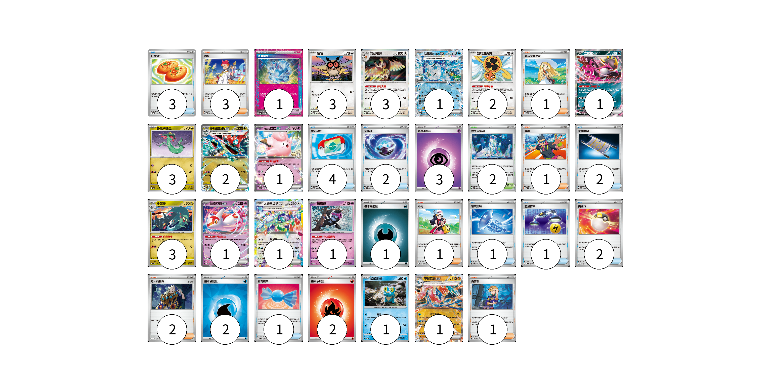 牌組構築方案 以此牌組為基礎新構築牌組 顯示卡面 顯示列表 寶可夢卡(24) 3 3 1 2 1 3 2 1 3 1 1 1 1 1 寶可夢道具(1) 1 物品卡(16) 3 4 2 2 1 1 2 1 支援者卡(9) 3 1 1 1 2 1 競技場卡(2) 2 能量卡(8) 3 1 2 2 寶可夢卡(24) 卡牌名稱 張數 卡牌名稱 張數 咕咕 M2a 137/193 03 貓頭夜鷹 M2a 138/193 03 厄鬼椪 水井面具ex SV8a 050/187 01 旋轉洛托姆 M2a 139/193 02 吉雉雞ex M2a 114/193 01 多龍梅西亞 MC 546/742 03 多龍巴魯托ex MC 548/742 02 莉莉艾的皮皮ex MC 287/742 01 多龍奇 MC 547/742 03 拉帝亞斯ex MC 312/742 01 太樂巴戈斯ex MC 630/742 01 願增猿 MC 358/742 01 呱呱泡蛙 SV5a 023/066 01 甲賀忍蛙ex SV5a 045/066 01 寶可夢道具(1) 卡牌名稱 張數 卡牌名稱 張數 璀璨結晶 SV8a 152/187 01 物品卡(16) 卡牌名稱 張數 卡牌名稱 張數 好友寶芬 SV8a 147/187 03 寶可平板 M3 070/080 04 太晶珠 M2a 152/193 02 夜間擔架 MC 670/742 02 玻璃喇叭 M2a 149/193 01 能量轉移 MC 638/742 01 高級球 MC 651/742 02 神奇糖果 MC 655/742 01 支援者卡(9) 卡牌名稱 張數 卡牌名稱 張數 赤松 SV8a 163/187 03 莉莉艾的決意 M2a 175/193 01 裁判 MC 711/742 01 小光 M2 077/080 01 老大的指令 MBG 021/022 02 白蕾雅 MC 722/742 01 競技場卡(2) 卡牌名稱 張數 卡牌名稱 張數 零之大空洞 M2a 184/193 02 能量卡(8) 卡牌名稱 張數 卡牌名稱 張數 基本【超】能量 MC PSY 03 基本【惡】能量 MC DAR 01 基本【水】能量 SVM WAT 02 基本【火】能量 MC FIR 02 以此牌組為基礎新構築牌組 牌組編碼 HKfumO-BBHlWQ-pPmjNz copy 列印牌組單 牌組編碼已複製 分享至SNS