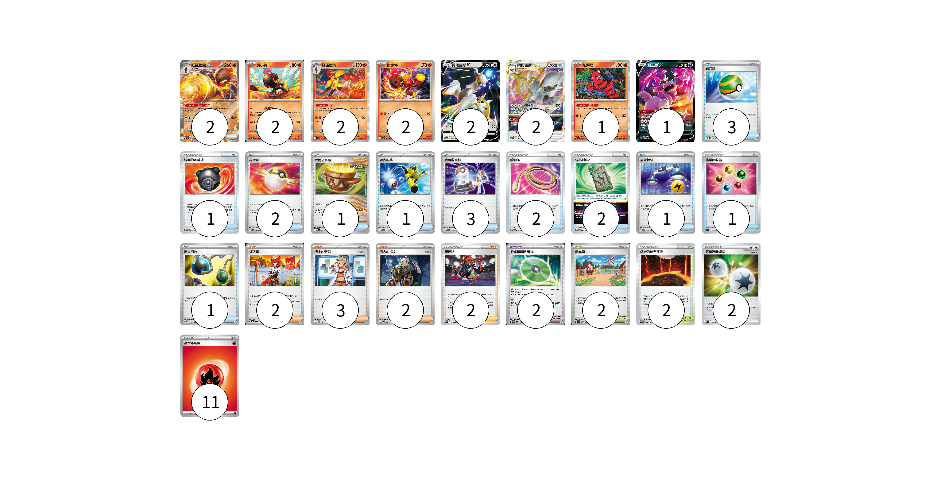 牌組構築方案 以此牌組為基礎新構築牌組 顯示卡面 顯示列表 寶可夢卡(14) 2 2 2 2 2 2 1 1 寶可夢道具(2) 2 物品卡(18) 3 1 2 1 1 3 2 2 1 1 1 支援者卡(9) 2 3 2 2 競技場卡(4) 2 2 能量卡(13) 2 11 寶可夢卡(14) 卡牌名稱 張數 卡牌名稱 張數 紅蓮鎧騎ex SV4K 015/066 02 炭小侍 SV4K 014/066 02 紅蓮鎧騎 SV1S 012/078 02 炭小侍 SV1S 011/078 02 阿爾宙斯V S12a 126/172 02 阿爾宙斯VSTAR S12a 127/172 02 花舞鳥 SV1a 016/073 01 龍王蠍V S12a 085/172 01 寶可夢道具(2) 卡牌名稱 張數 卡牌名稱 張數 招式學習器 演進 SV4M 063/066 02 物品卡(18) 卡牌名稱 張數 卡牌名稱 張數 巢穴球 SVEL 011/020 03 洗翠的沉重球 SVB 014/028 01 高級球 SVEL 012/020 02 大地之容器 SV4K 060/066 01 厲害釣竿 SVEM 011/020 01 寶可夢交替 SVEM 015/020 03 離洞繩 SVF 010/038 02 森林封印石 SVF 024/038 02 能量轉移 SVD 111/139 01 能量回收器 SI 368/414 01 能量回收 SVD 110/139 01 支援者卡(9) 卡牌名稱 張數 卡牌名稱 張數 梅洛可 SV4K 066/066 02 博士的研究 SVEL 018/020 03 老大的指令 SVF 032/038 02 奇巴納 SVB 018/028 02 競技場卡(4) 卡牌名稱 張數 卡牌名稱 張數 深缽鎮 SV1a 070/073 02 熔岩的瀑布深潭 SVF 037/038 02 能量卡(13) 卡牌名稱 張數 卡牌名稱 張數 雙重渦輪能量 SVF 038/038 02 基本【火】能量 SVEL FIR 11 以此牌組為基礎新構築牌組 牌組編碼 HLZPat-OgLQvg-lbiaCD copy 列印牌組單 牌組編碼已複製 分享至SNS