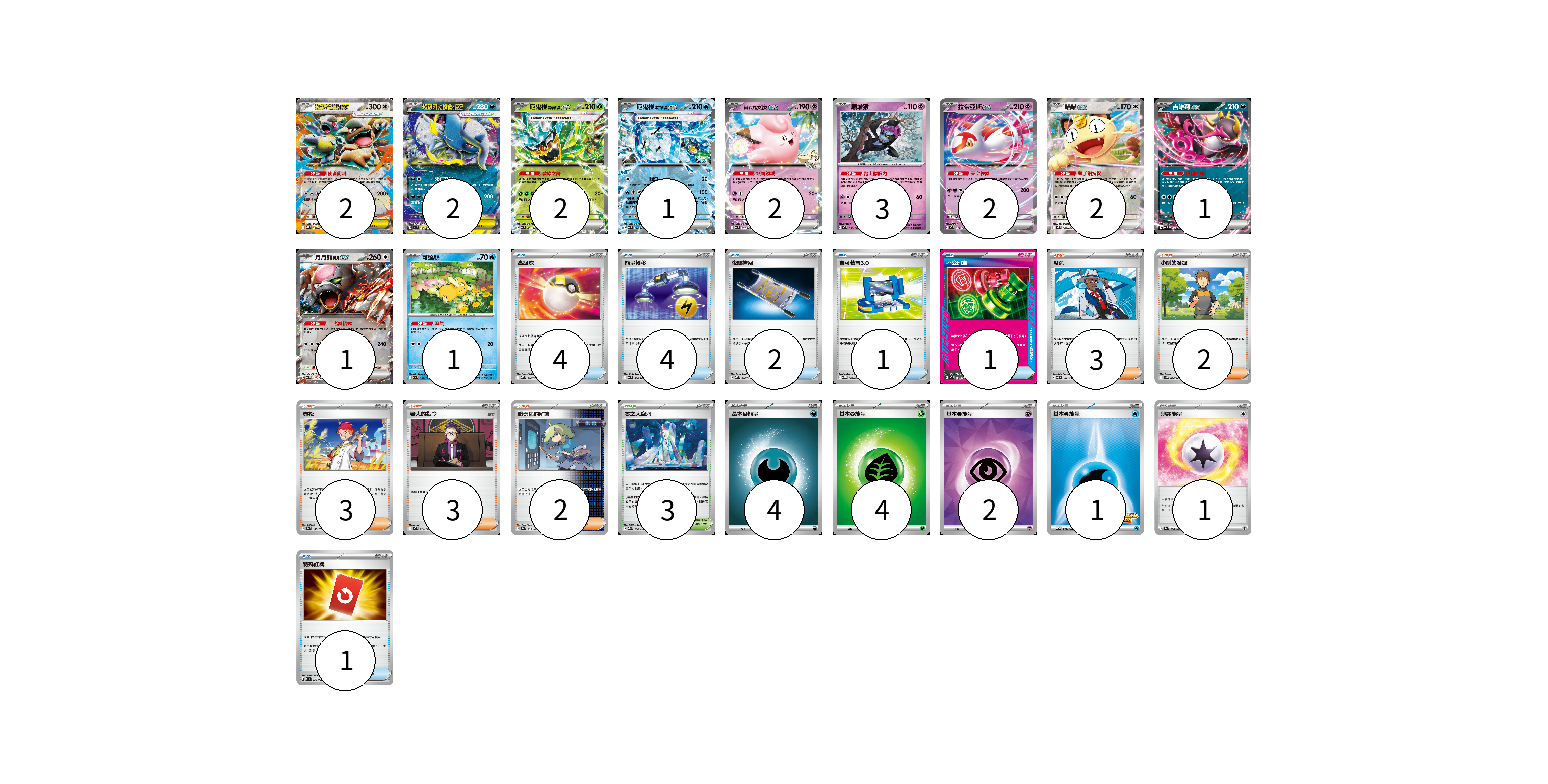 牌組構築方案 以此牌組為基礎新構築牌組 顯示卡面 顯示列表 寶可夢卡(19) 2 2 2 1 2 3 2 2 1 1 1 物品卡(13) 4 4 2 1 1 1 支援者卡(13) 3 2 3 3 2 競技場卡(3) 3 能量卡(12) 4 4 2 1 1 寶可夢卡(19) 卡牌名稱 張數 卡牌名稱 張數 超級袋獸ex M1S 051/063 02 超級阿勃梭魯ex M1L 038/063 02 厄鬼椪 碧草面具ex MC 082/742 02 厄鬼椪 水井面具ex MC 224/742 01 莉莉艾的皮皮ex MC 287/742 02 願增猿 MC 358/742 03 拉帝亞斯ex MC 312/742 02 喵喵ex M3 061/080 02 吉雉雞ex MC 489/742 01 月月熊 赫月 ex MC 625/742 01 可達鴨 M2a 032/193 01 物品卡(13) 卡牌名稱 張數 卡牌名稱 張數 高級球 MBD 014/022 04 能量轉移 MC 638/742 04 夜間擔架 MBD 016/022 02 寶可裝置3.0 SV11B 081/086 01 不公印章 MC 633/742 01 特殊紅牌 M4 072/083 01 支援者卡(13) 卡牌名稱 張數 卡牌名稱 張數 席藍 SV8 102/106 03 小剛的發掘 SV9 096/100 02 赤松 SV8a 163/187 03 老大的指令 MC 724/742 03 暗碼迷的解讀 SV8a 165/187 02 競技場卡(3) 卡牌名稱 張數 卡牌名稱 張數 零之大空洞 M2a 184/193 03 能量卡(12) 卡牌名稱 張數 卡牌名稱 張數 基本【惡】能量 MC DAR 04 基本【草】能量 MC GRA 04 基本【超】能量 SVOD PSY 02 基本【水】能量 SV-P 259/SV-P 01 薄霧能量 SV8a 186/187 01 以此牌組為基礎新構築牌組 牌組編碼 HMUlrN-HnTgKD-WKmPFv copy 列印牌組單 牌組編碼已複製 分享至SNS